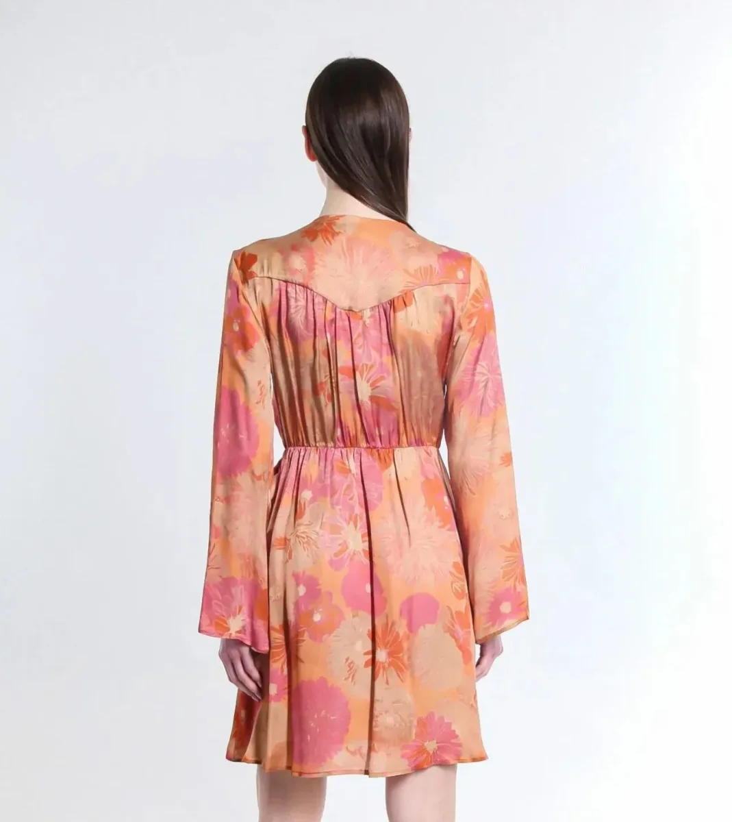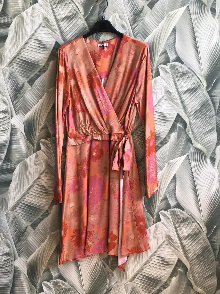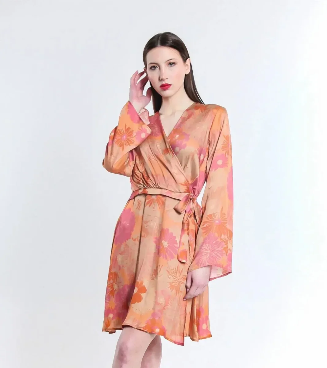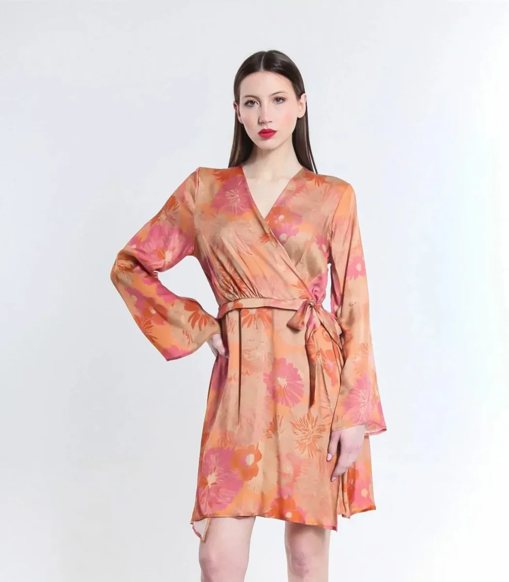 Abito corto Sicilia Con cintura alla vita,modello a portafoglio Manica lunga, scollo a V fantasia floreale sui colori arancio Composizione: 100% viscosa Made in Italy