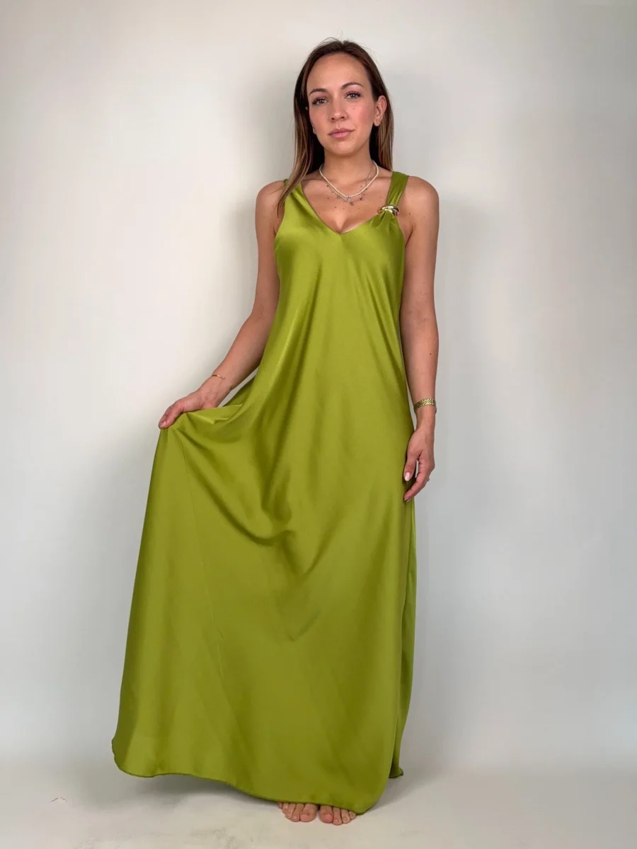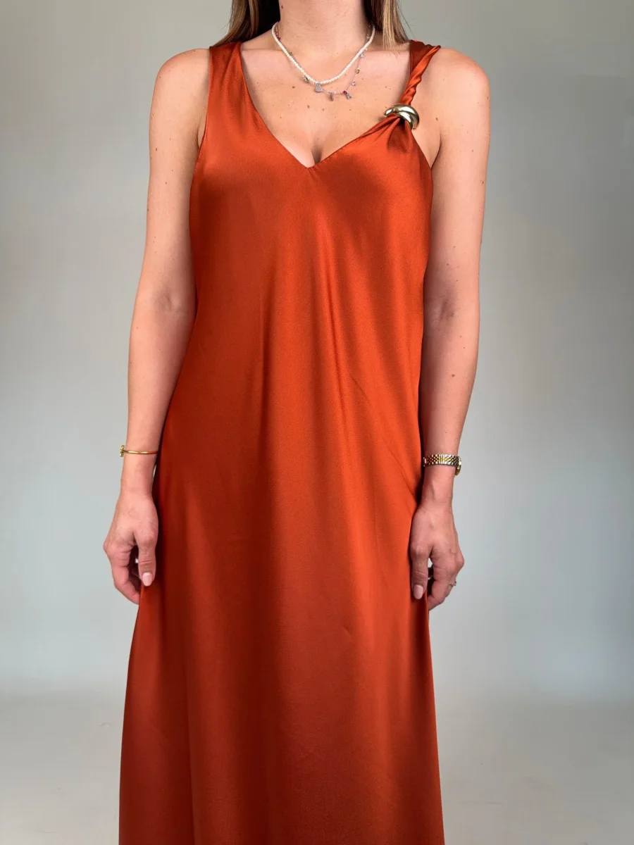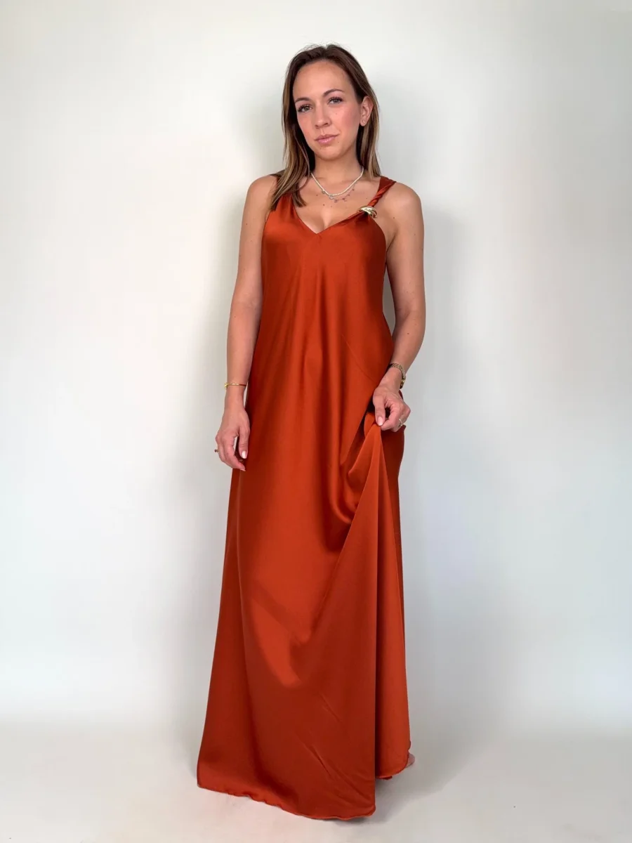 Abiro DIVINA in raso. il tessuto fluido dona un bel movimento e la spilla dorata sulla spalla aggiunge un tocco raffinato. Perfetto per un’occasione estiva o per una cerimonia. 100% poliestere. Veste fino a una 46. Made in Italy