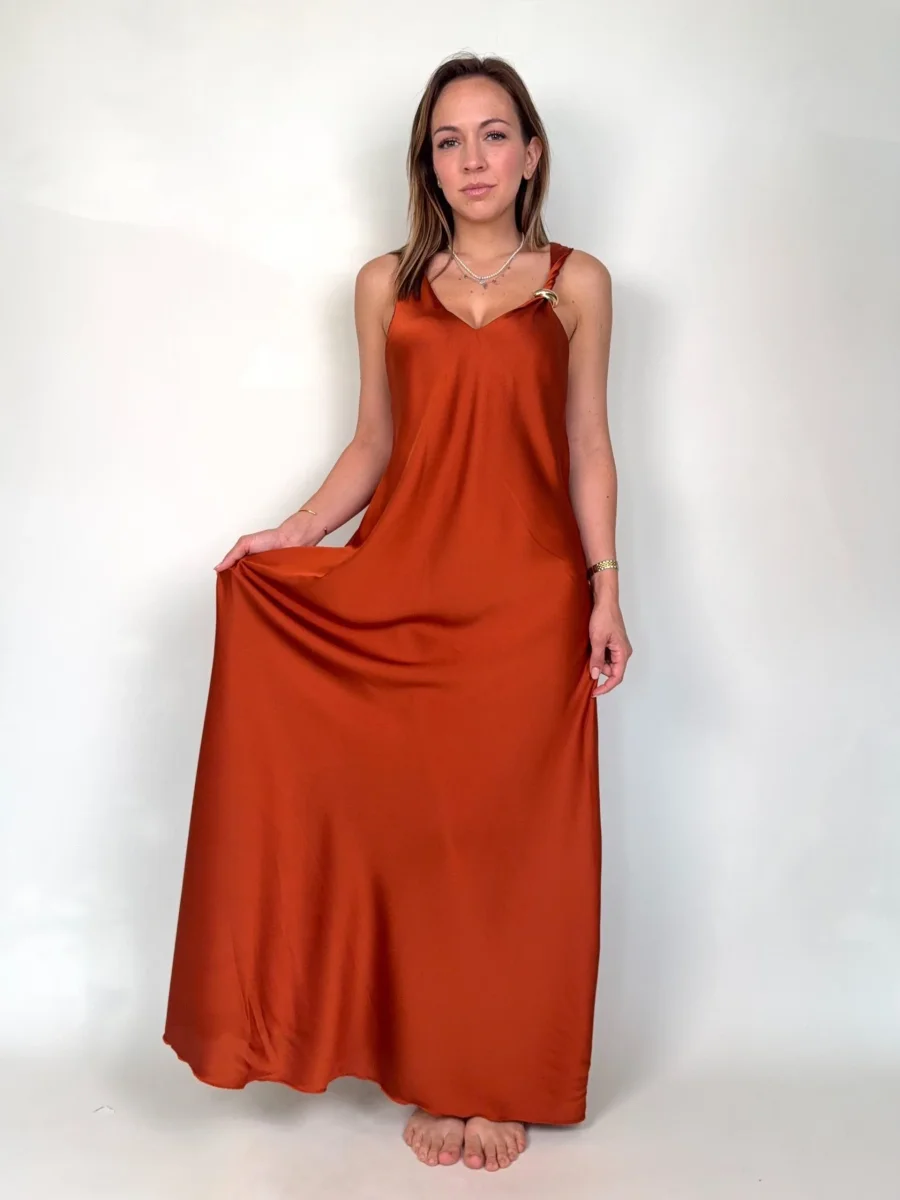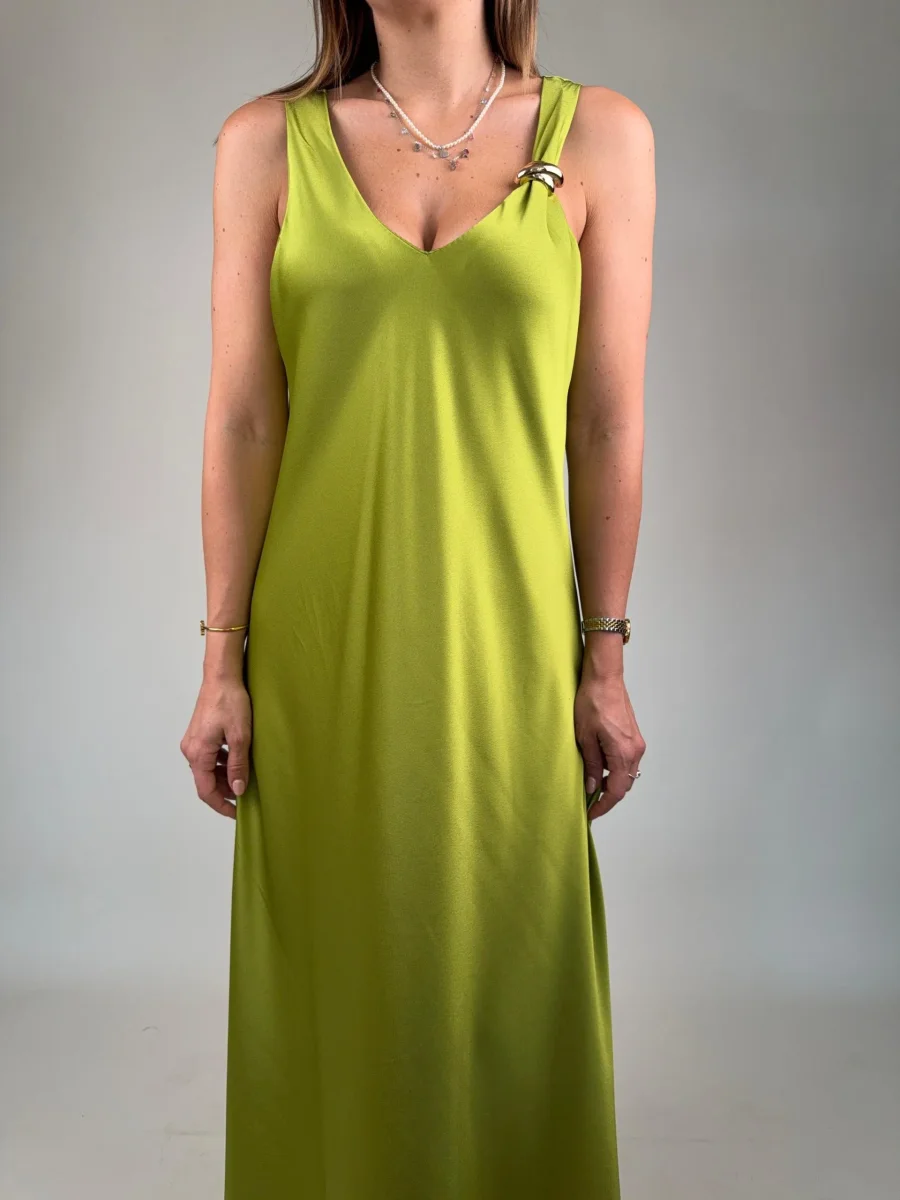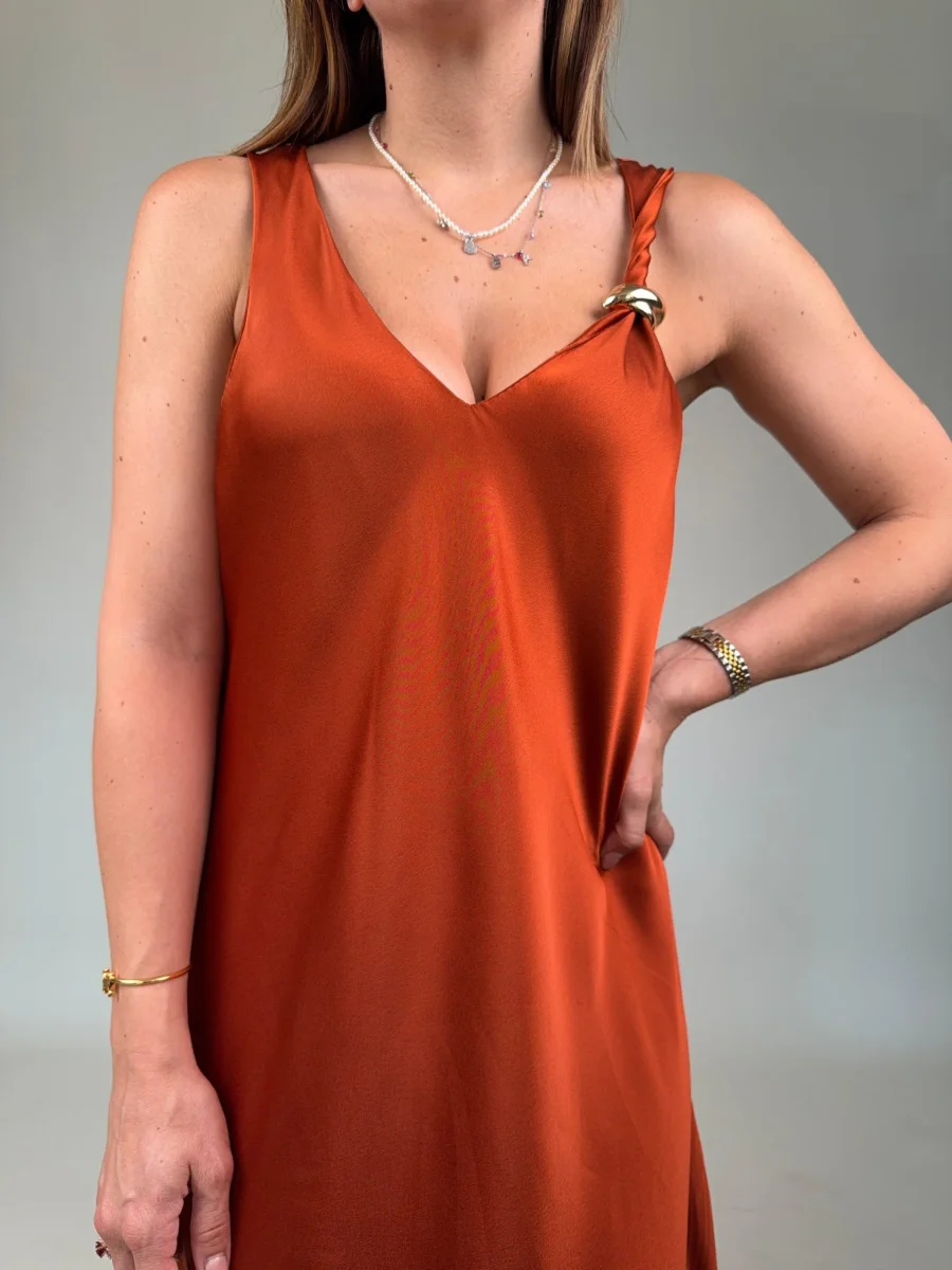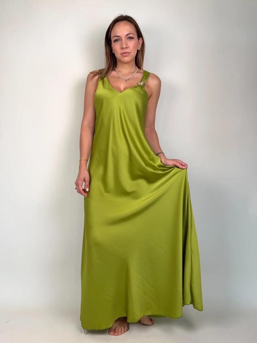 Abiro DIVINA in raso. il tessuto fluido dona un bel movimento e la spilla dorata sulla spalla aggiunge un tocco raffinato. Perfetto per un’occasione estiva o per una cerimonia. 100% poliestere. Veste fino a una 46. Made in Italy