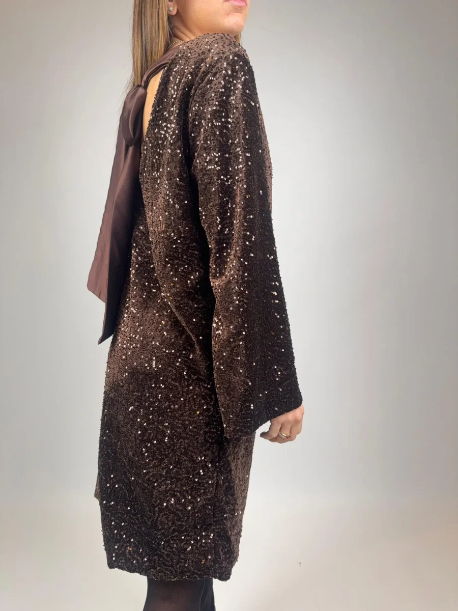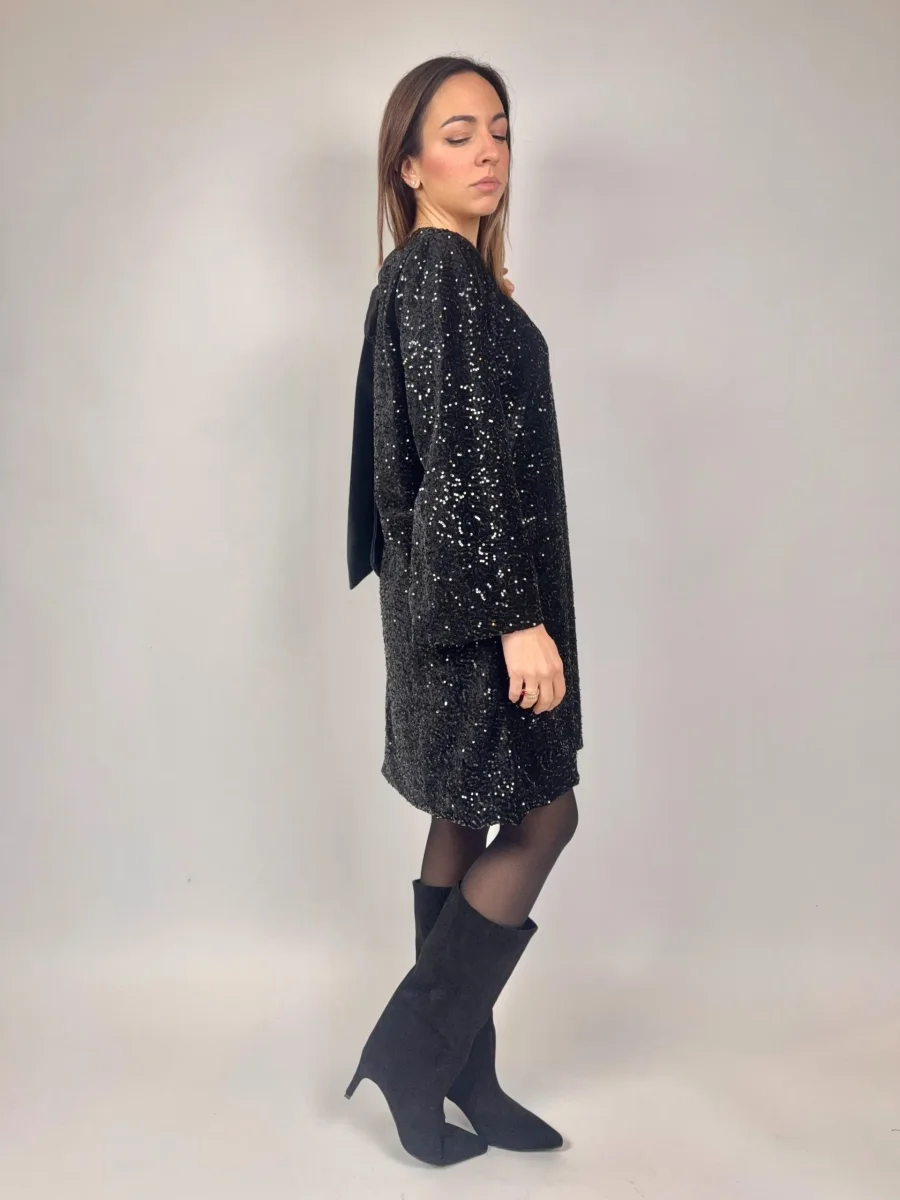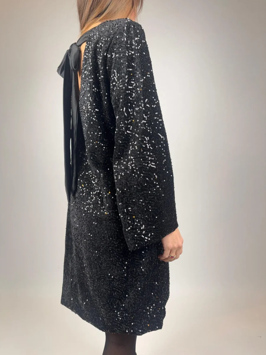 Abito in ciniglia e strass con fiocco sul retro Ottima vestibilitò, veset fino una taglia 46 Composizione: Made in Italu