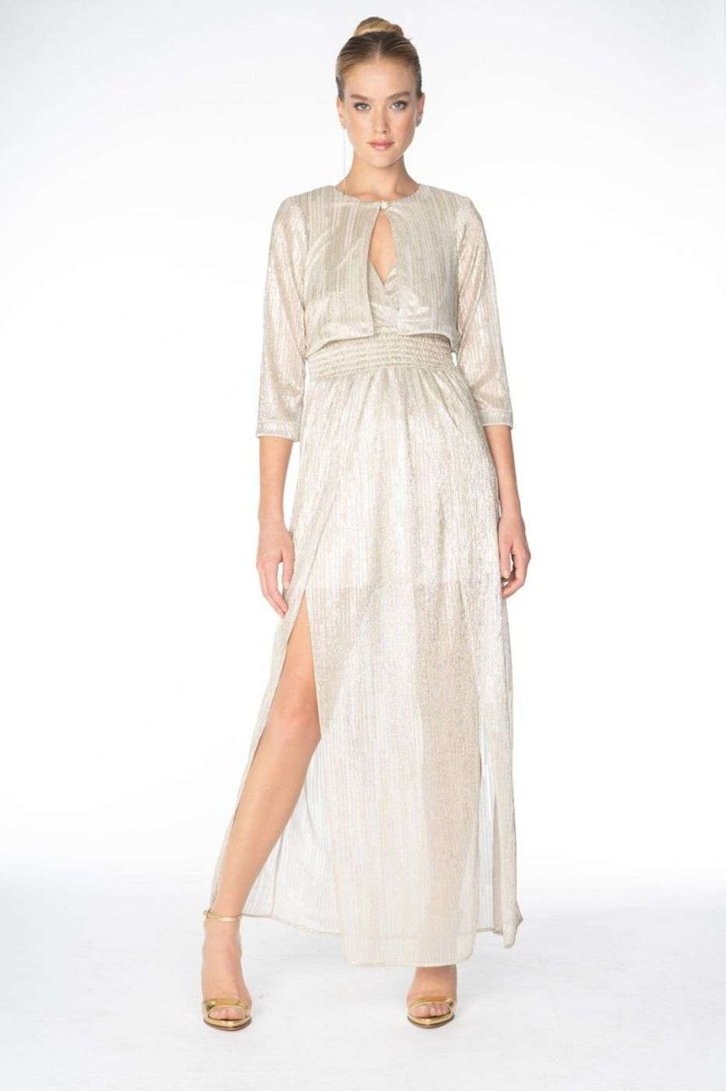 Abito da cerimonia lungo smanicato con ampio scollo a V e spacco. Siste’s. Collezione Primavera/Estate 2022.