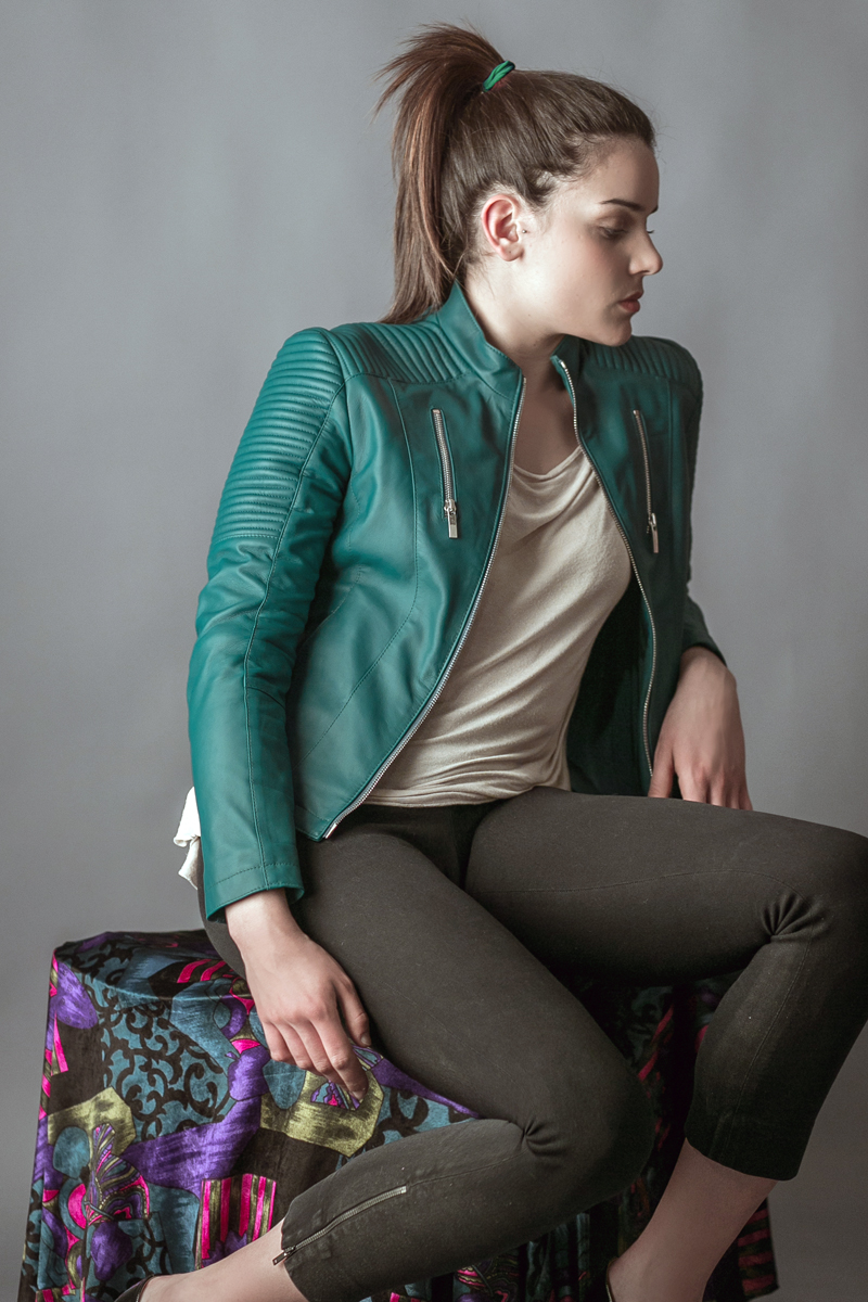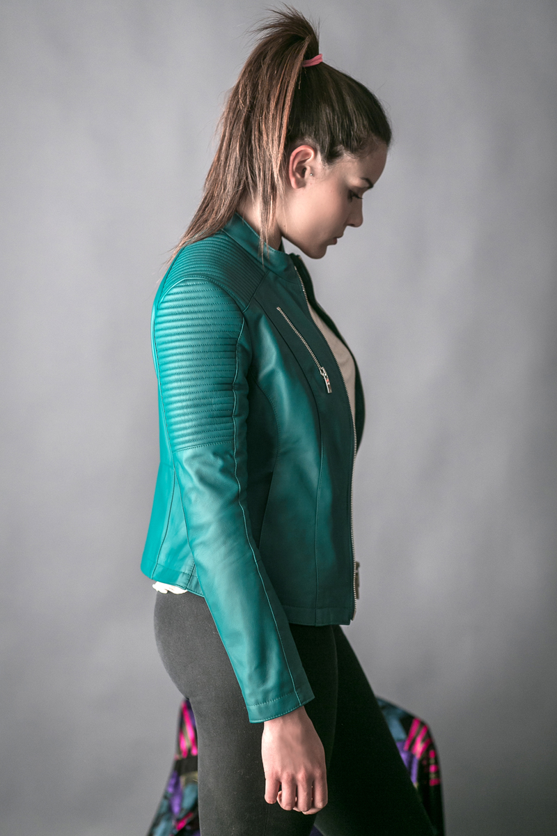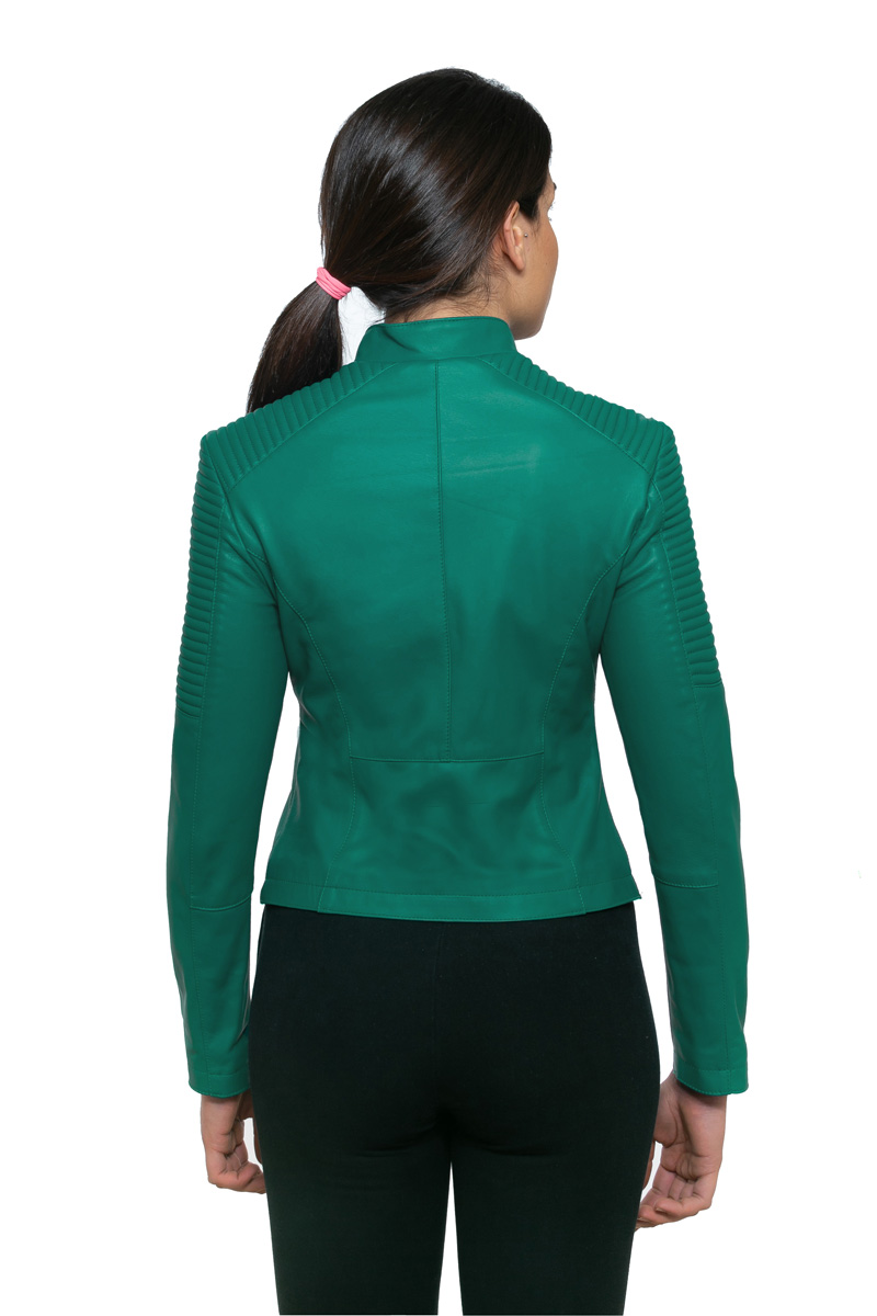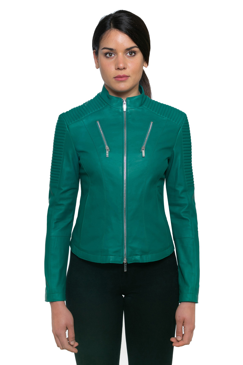 Giubbotto trend Biker in nappa ovina, di colore verde intenso/smeraldo con spalline trapuntate e tasche zippate