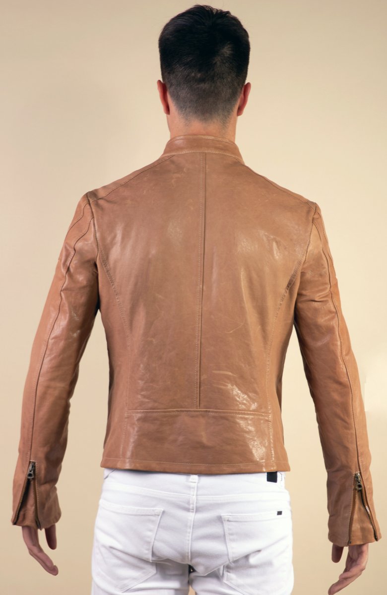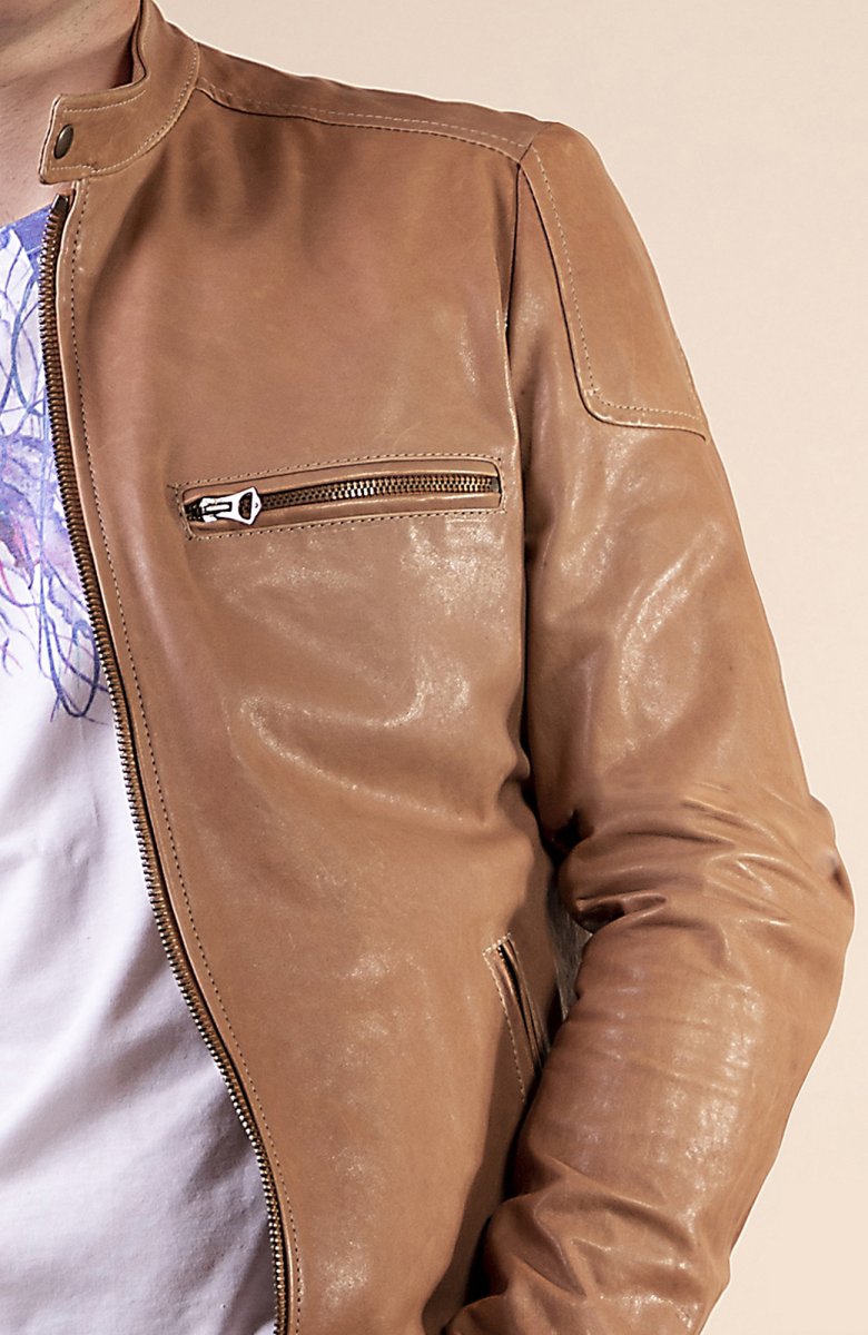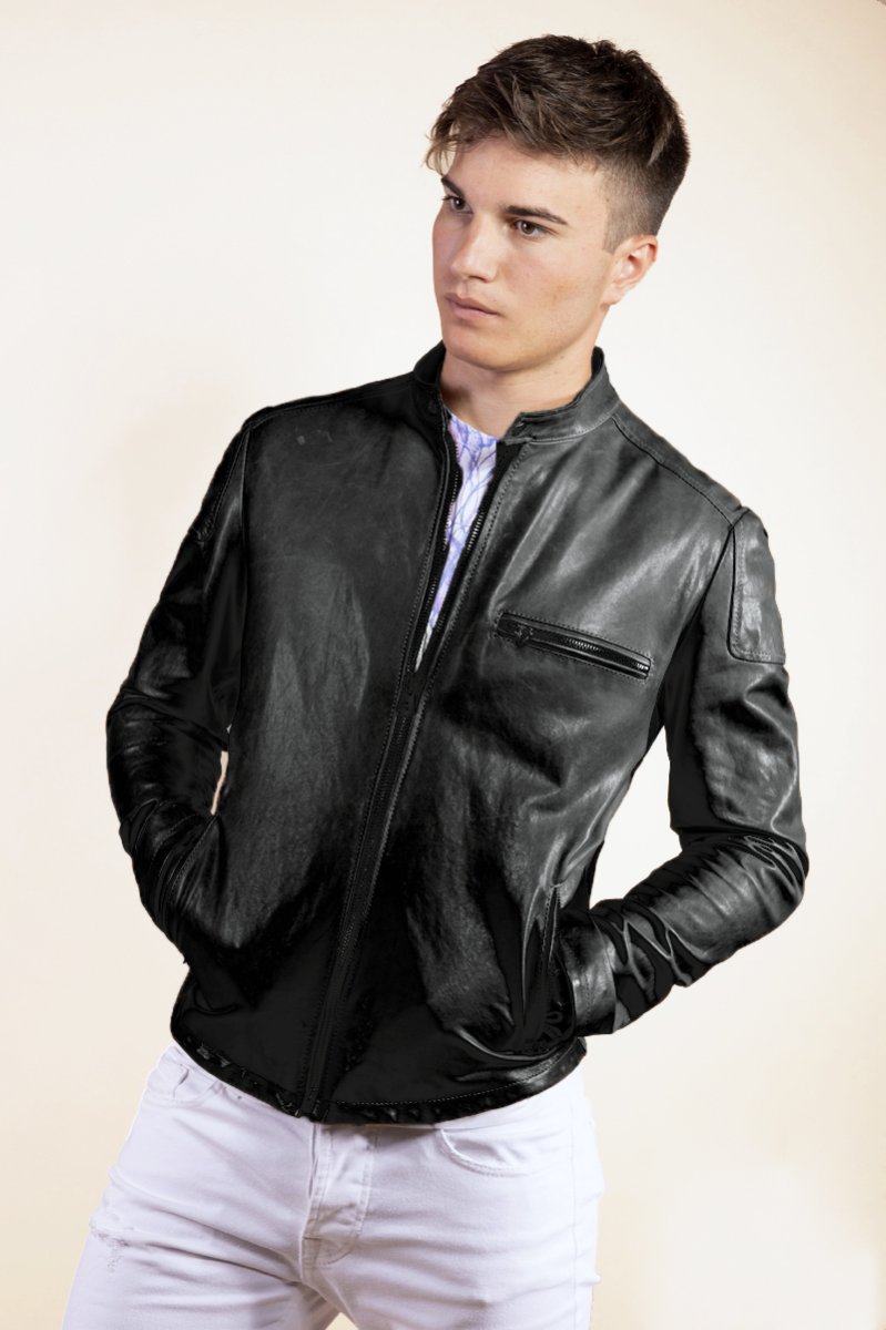Biker in vera nappa, lavata con trattamento vegetale e motivo spalla, zip metallo color canna di fucile. Fodera satin stretch e taschini interni e tasche esterne. Vestibilità slim