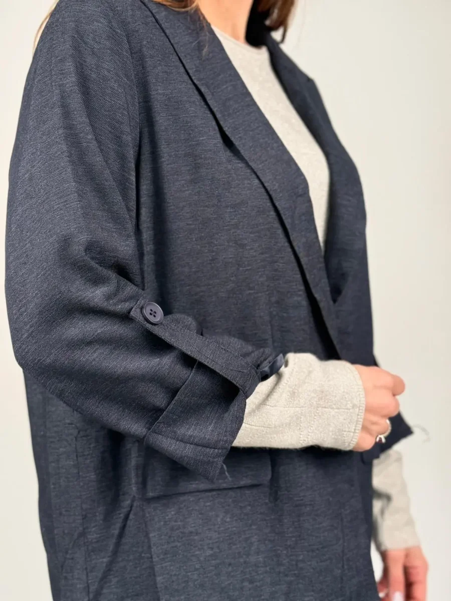 Blazer monopetto effetto denim, totalmente foderata internamente, con manica a tre quarti. Taglie S/M e M/L Conposizione: Tessuto 1 – 80% poliestere 18% rayon 2% spandex; Tessuto 2 – 100% poliestere Made in Italy