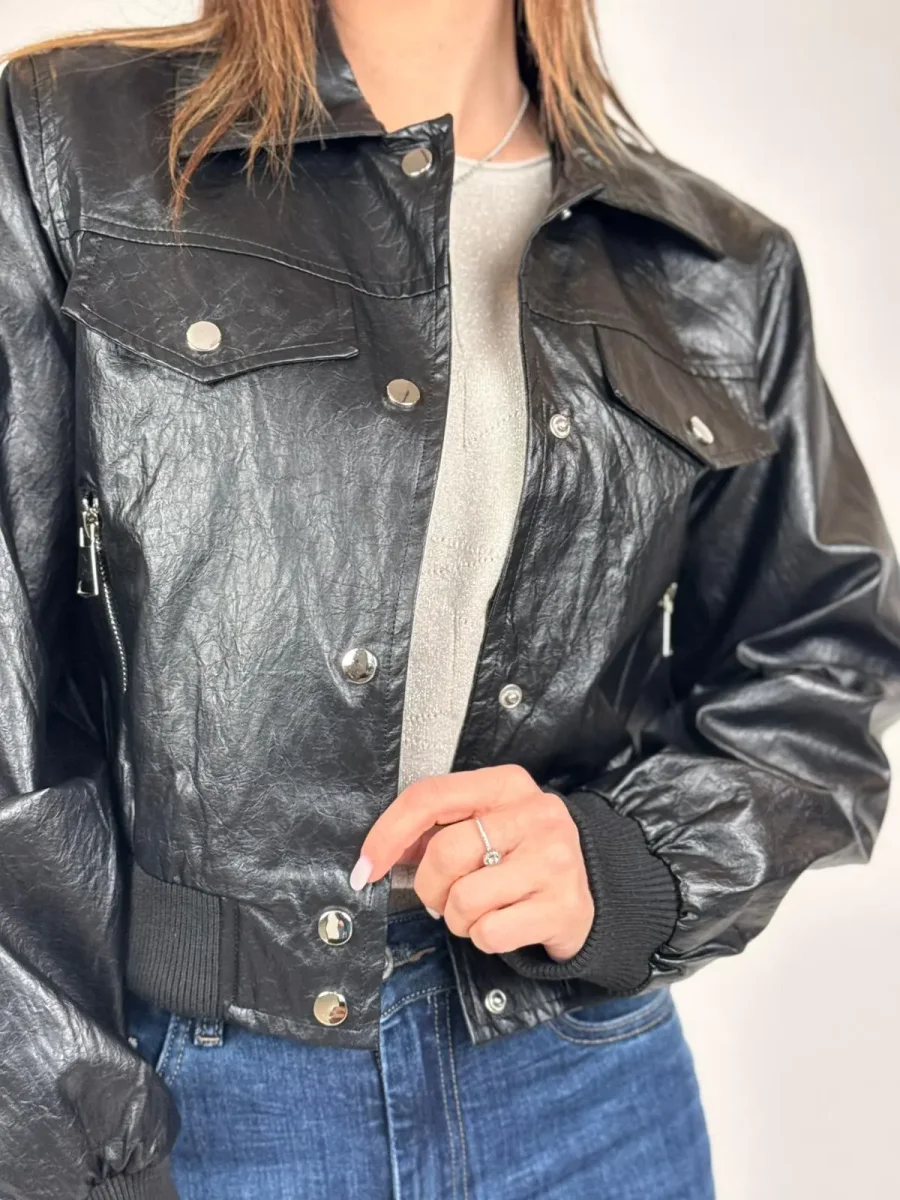 Bomber in ecopelle Polsino e parte terminale in tessuto a costine elasticizzato Chiusura con bottoncini a pressione color argento Colletto classico, due tasche con chiusura zip argentata Disponibile dalla taglia S alla XL