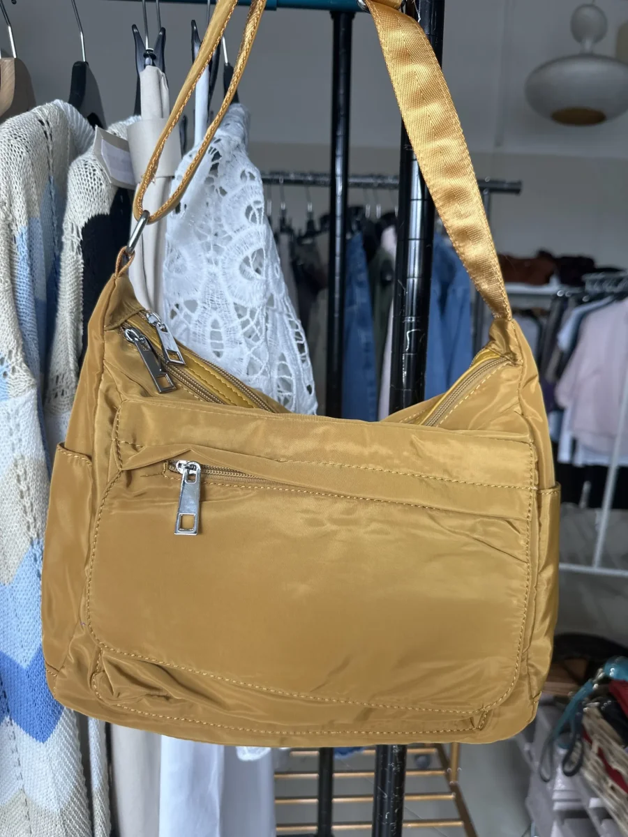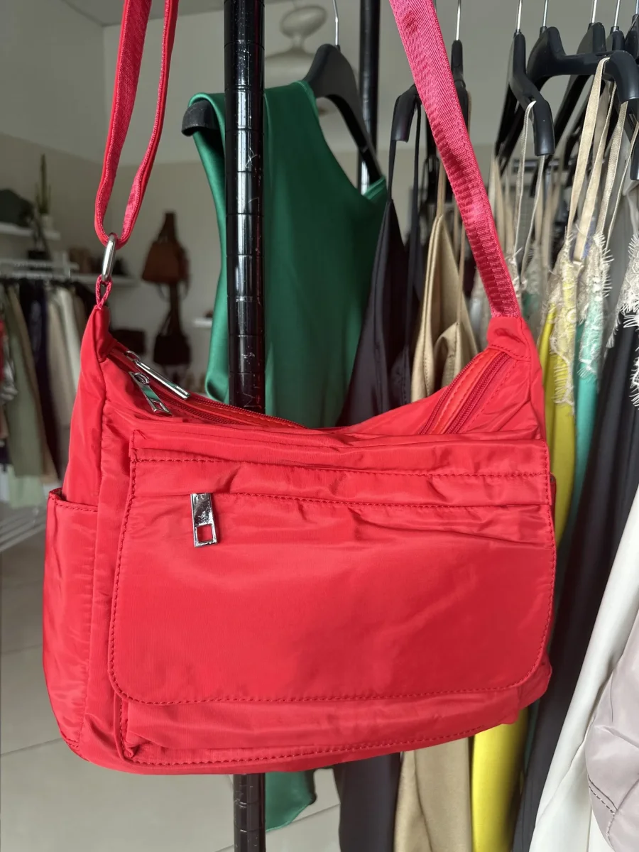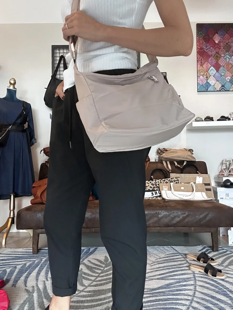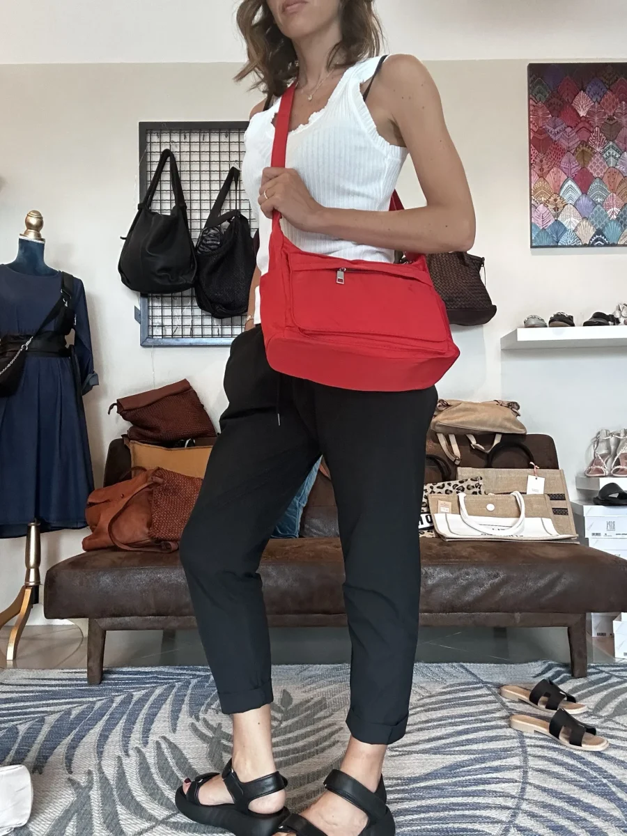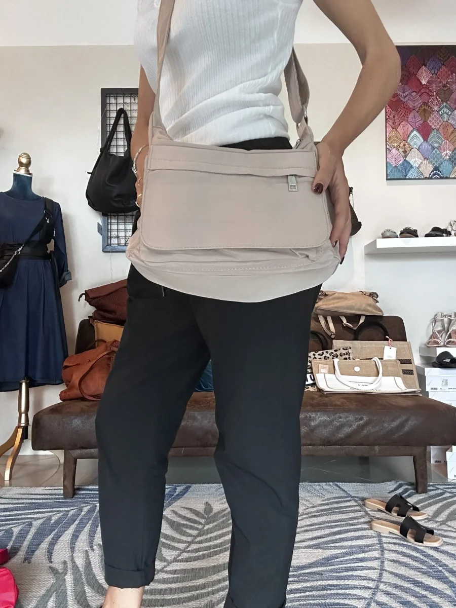 Borsa a tracolla in tessuto nylon modello LARA Leggerissima Dotata di due scomparti principali, più altre tasche secondarie dotate di zip. Tracolla regolabile. Dimensioni: 30 x 20 x 10 cm