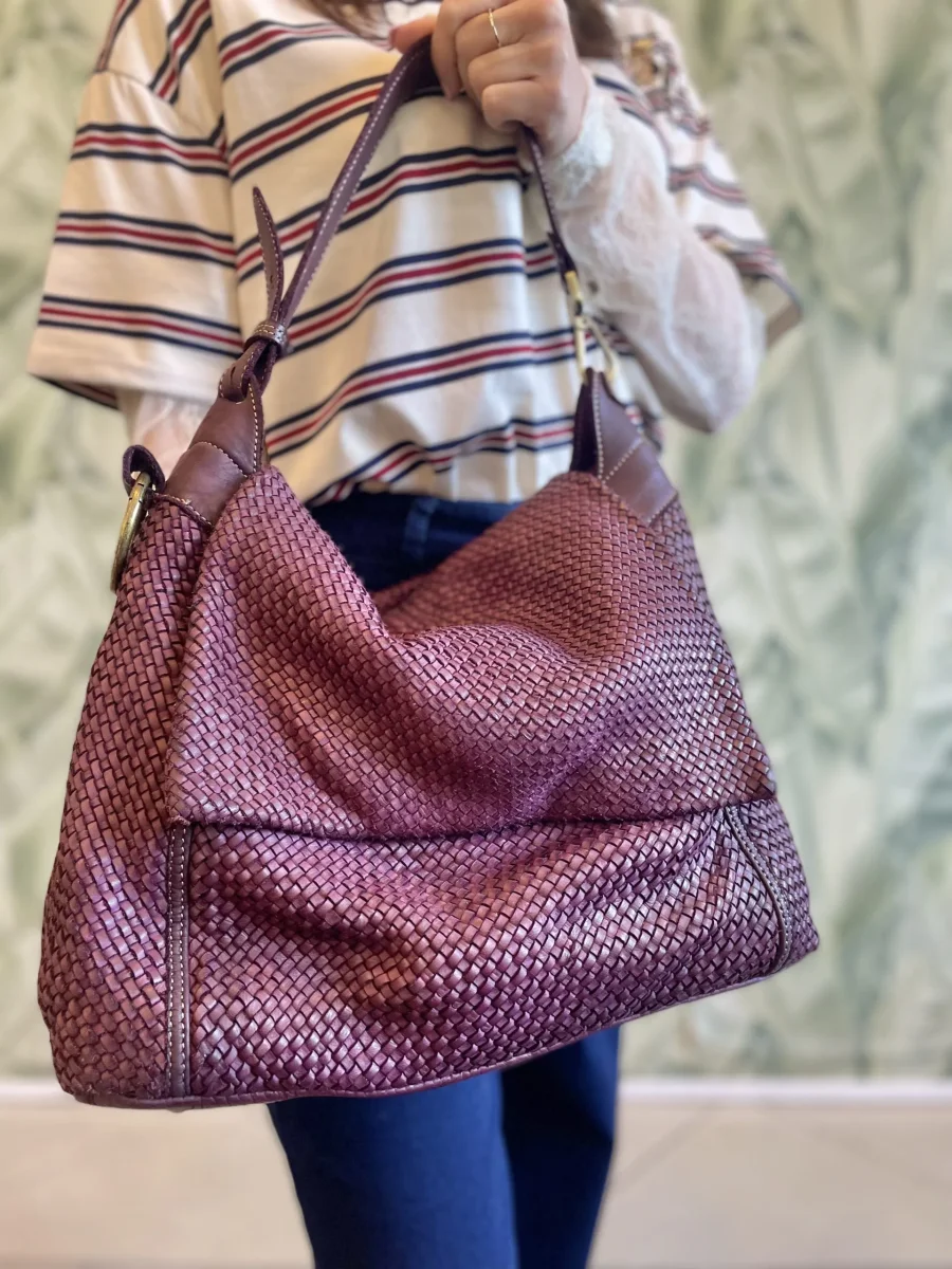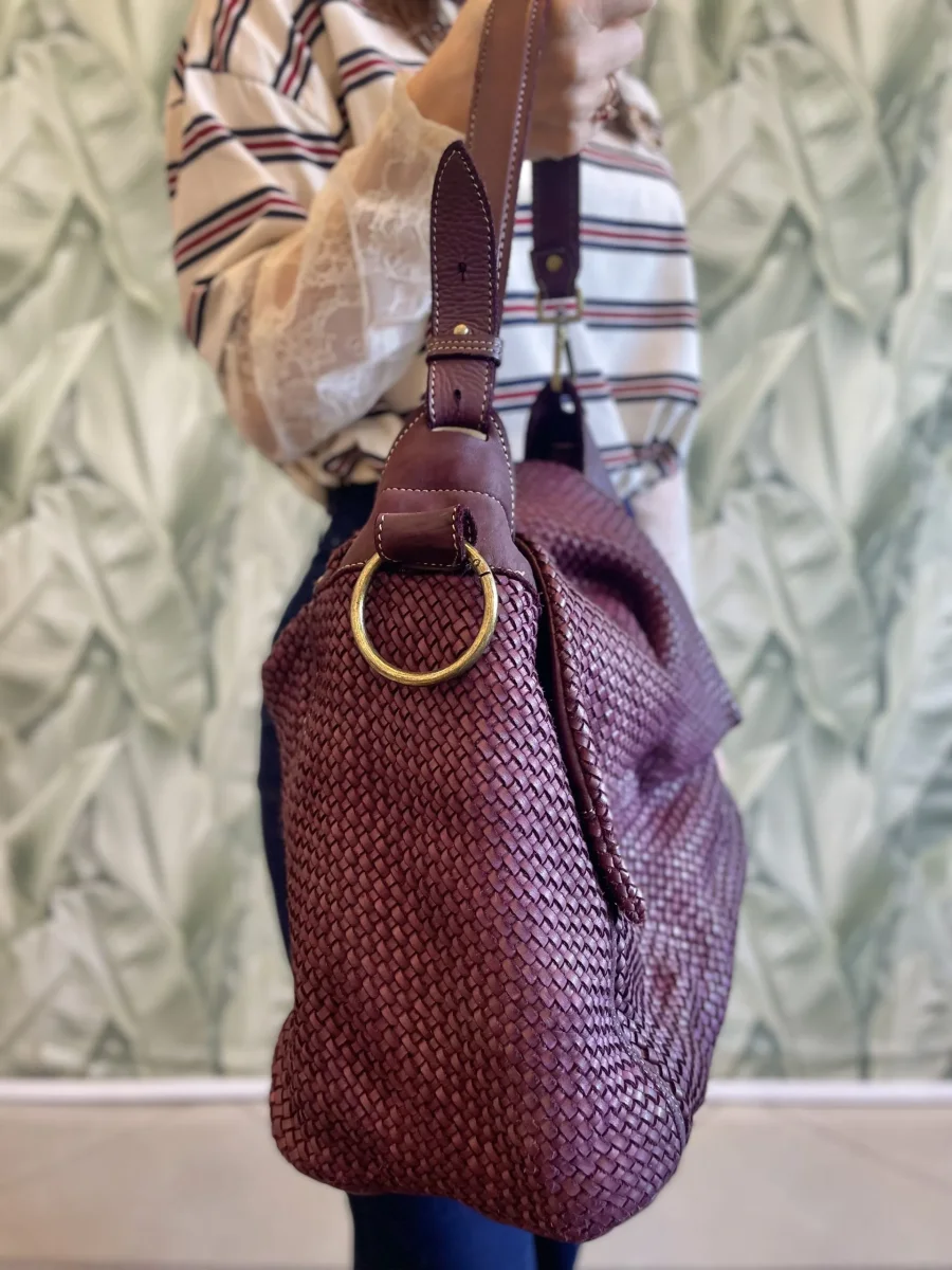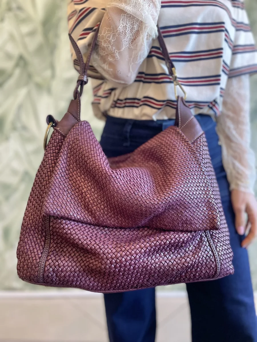Borsa, modello cartella, finemente intrecciata ILARY Lavorazione artigianale, modello in vera pelle Dimensioni: 40 x 32 cm Dotata di tracolla regolabile, chiusura con zip centrale e tre tasche interne. Made in Italy