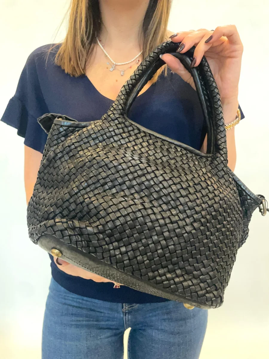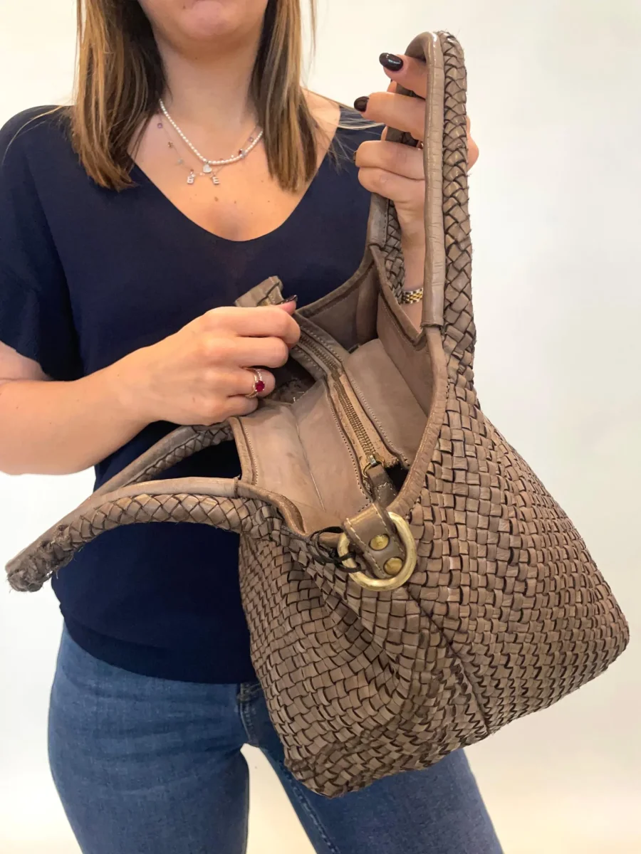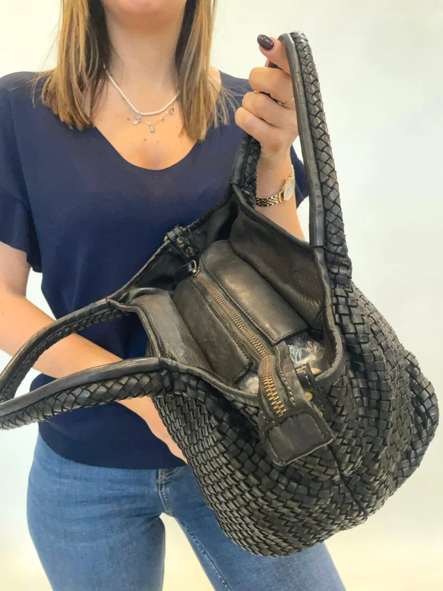 Borsa in vera pelle intrecciata modello Giada. Dimensioni: H 37x L 21x P 23 Modello chiuso con cerniera dotata di tracolla regolabile che si può togliere. Il fondo è dotato di piedini in metallo. Pellame lavato di alta qualità e lavorazione artigianale Italiana.