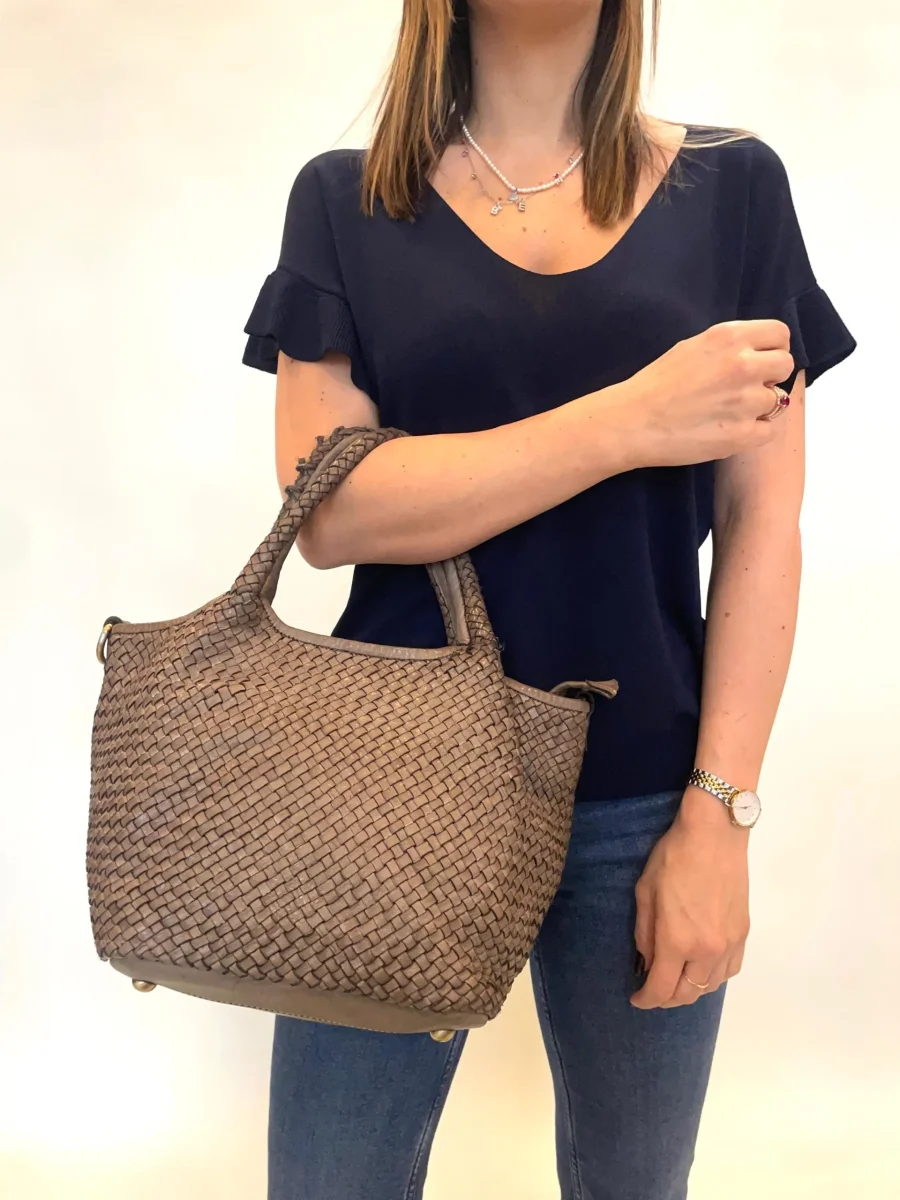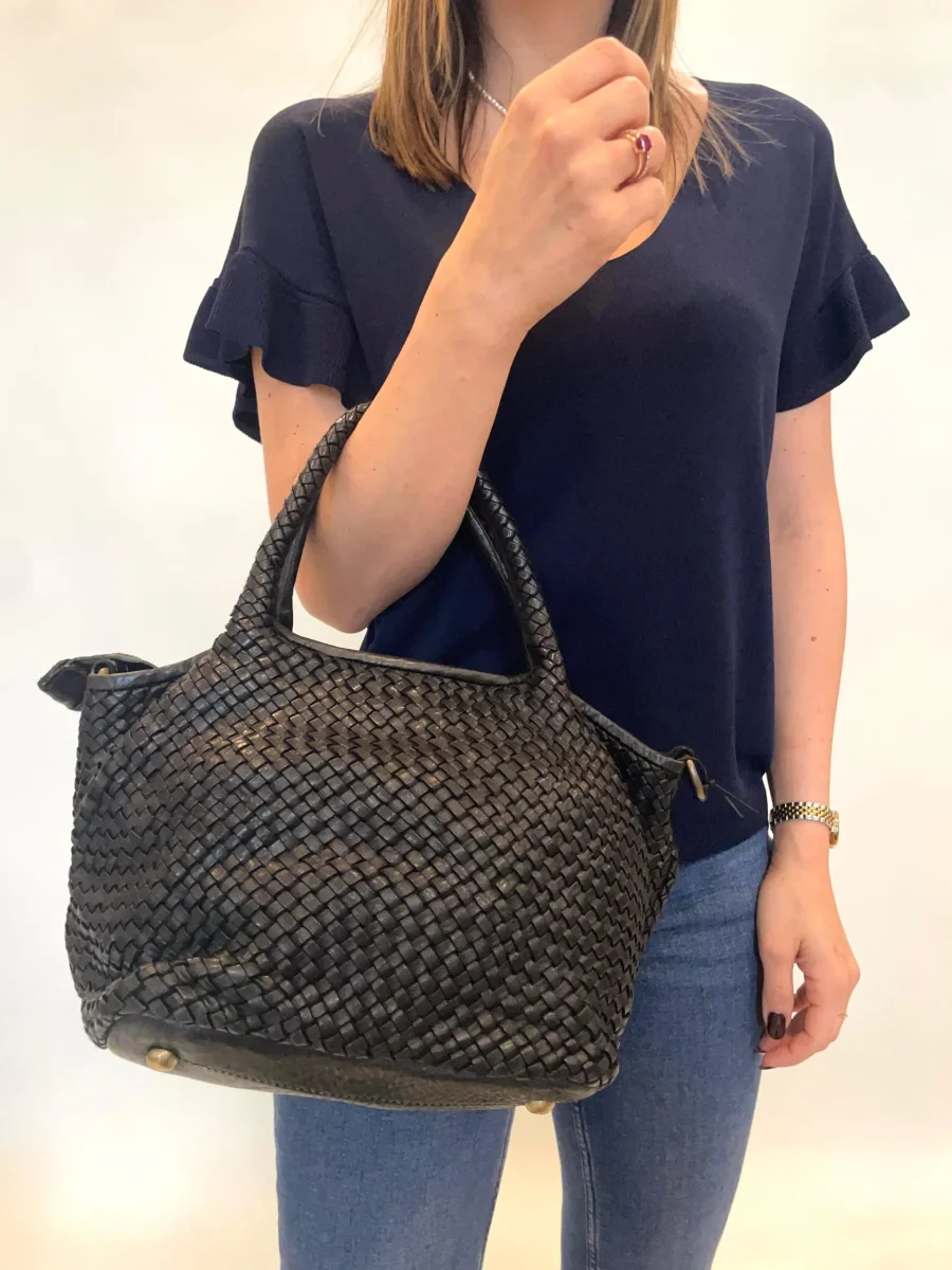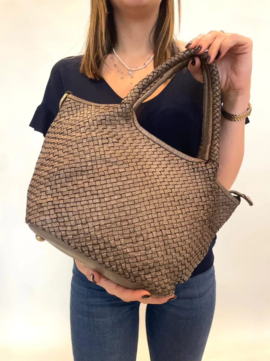 Borsa in vera pelle intrecciata modello Giada. Dimensioni: H 37x L 21x P 23 Modello chiuso con cerniera dotata di tracolla regolabile che si può togliere. Il fondo è dotato di piedini in metallo. Pellame lavato di alta qualità e lavorazione artigianale Italiana.