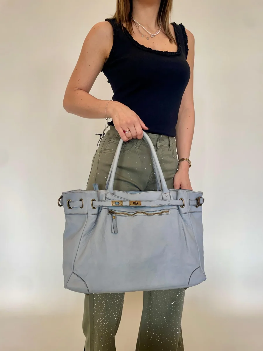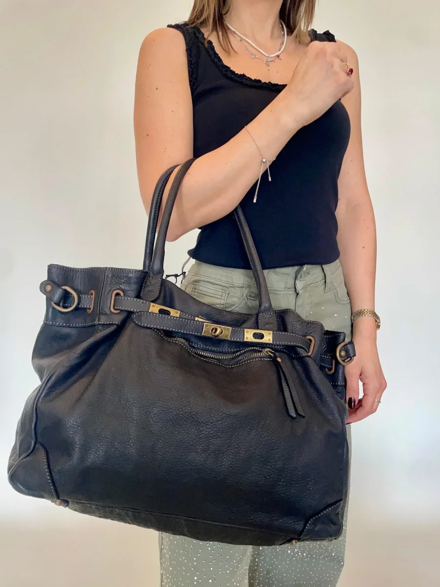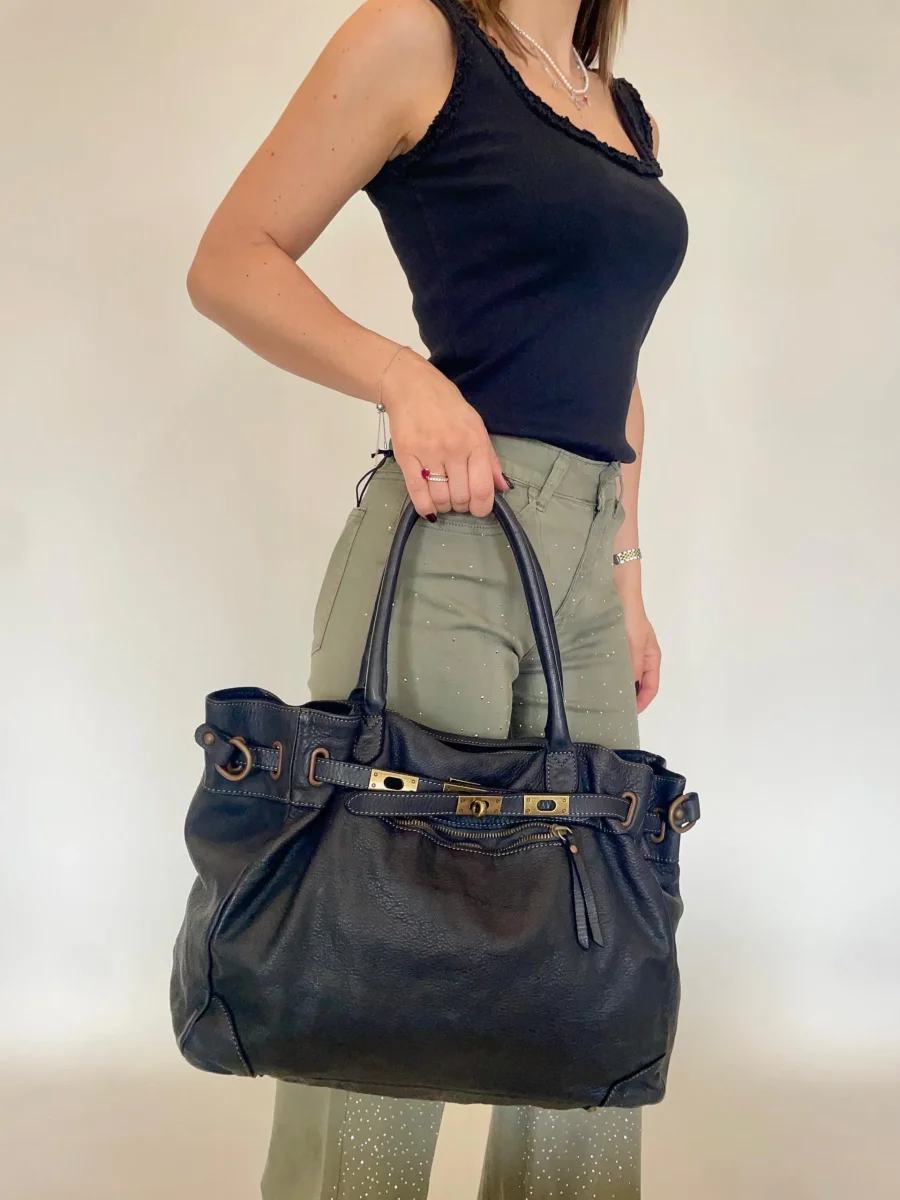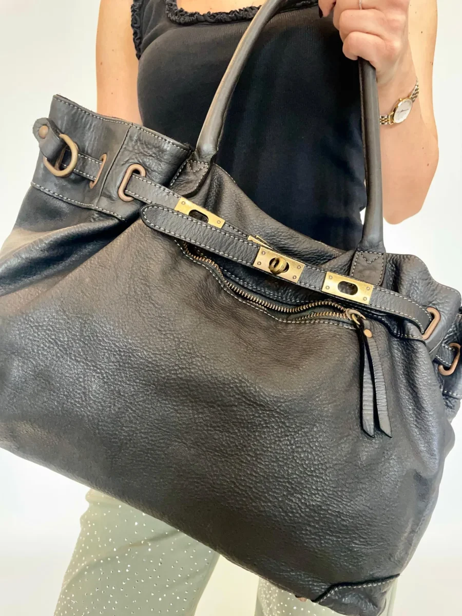 Borsa modello GAIA con cerniera. Vera pelle lavorazione artigianale italiana. Misure: altezza 31 cm, larghezza 40 cm, spessore 16 cm. Dotata di tracolla regolabile in pelle, tasca interna e tasche esterne.