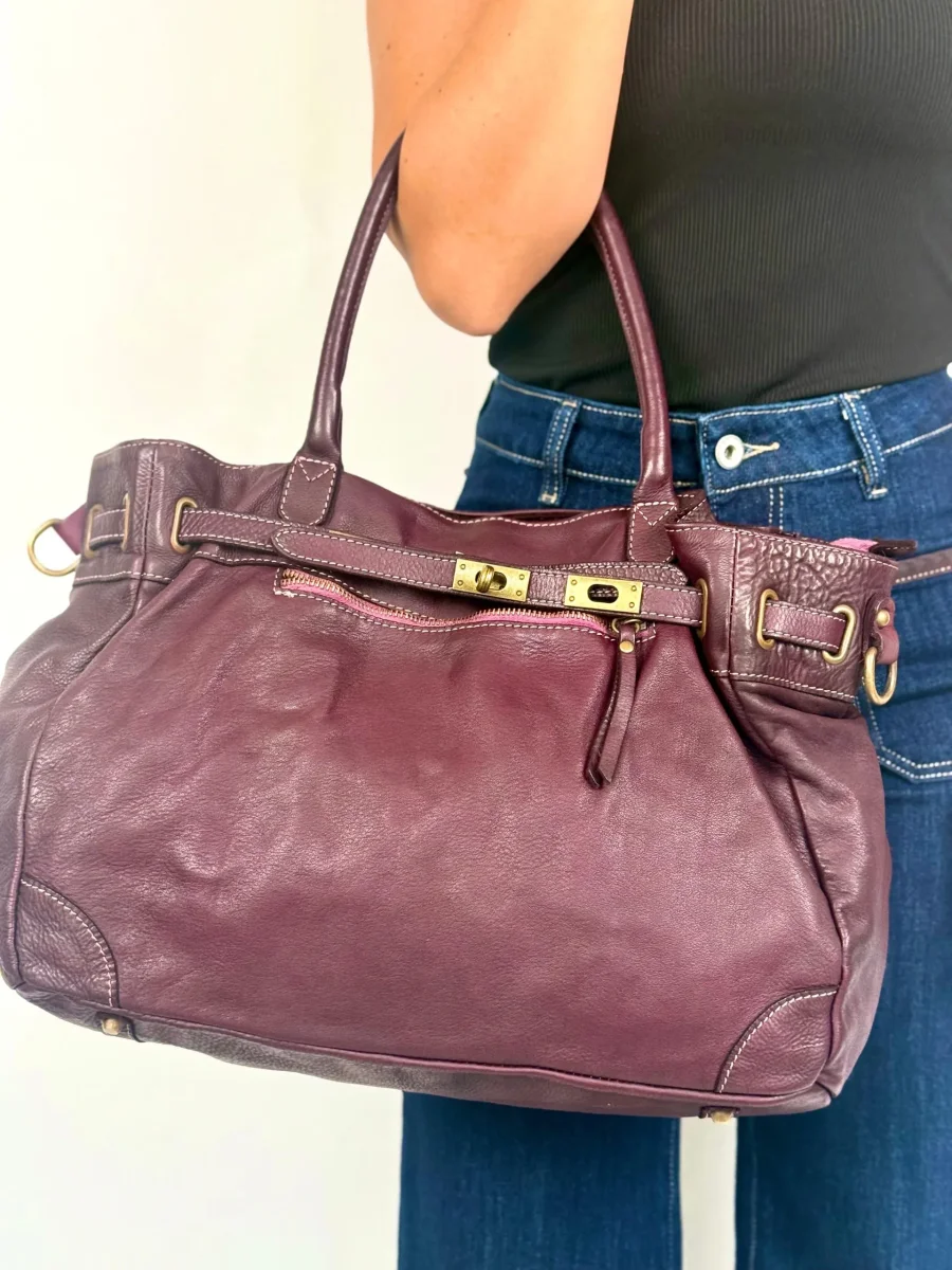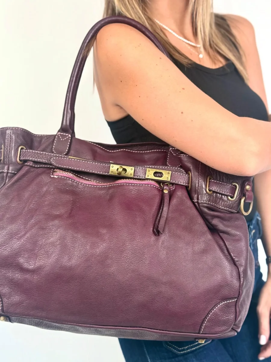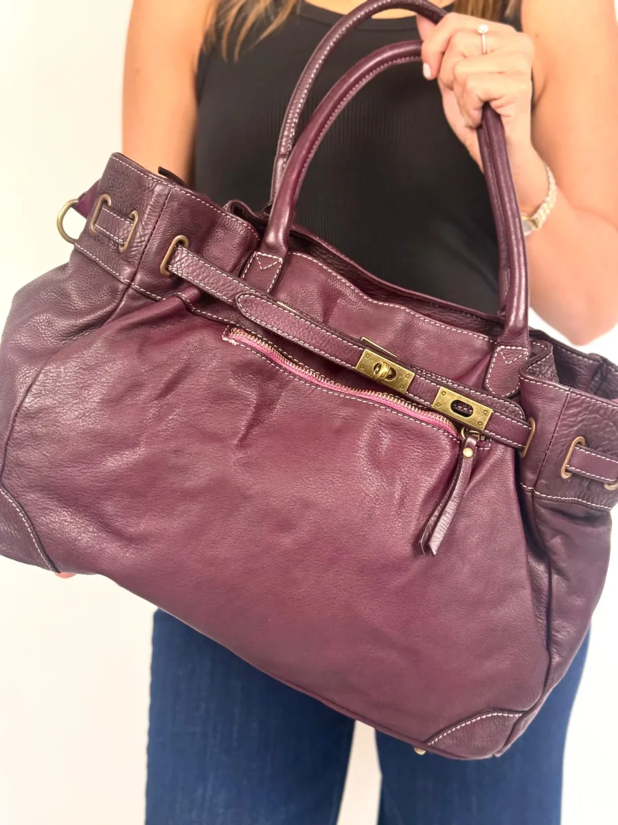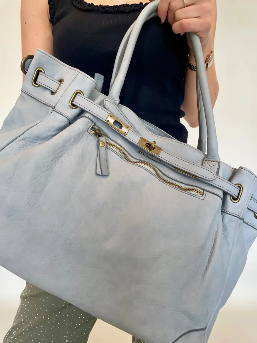 Borsa modello GAIA con cerniera. Vera pelle lavorazione artigianale italiana. Misure: altezza 31 cm, larghezza 40 cm, spessore 16 cm. Dotata di tracolla regolabile in pelle, tasca interna e tasche esterne.