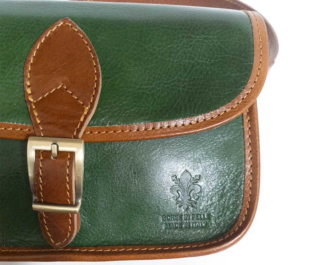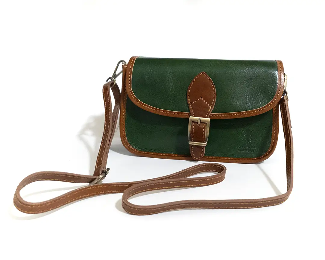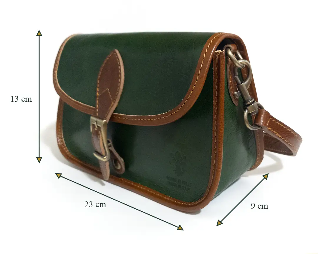Disponibile in cinque eleganti varianti di colore – rossa, nera, cuoio, cuoio e marrone, verde e cuoio – questa borsetta a tracolla si adatta a ogni stile e occasione.