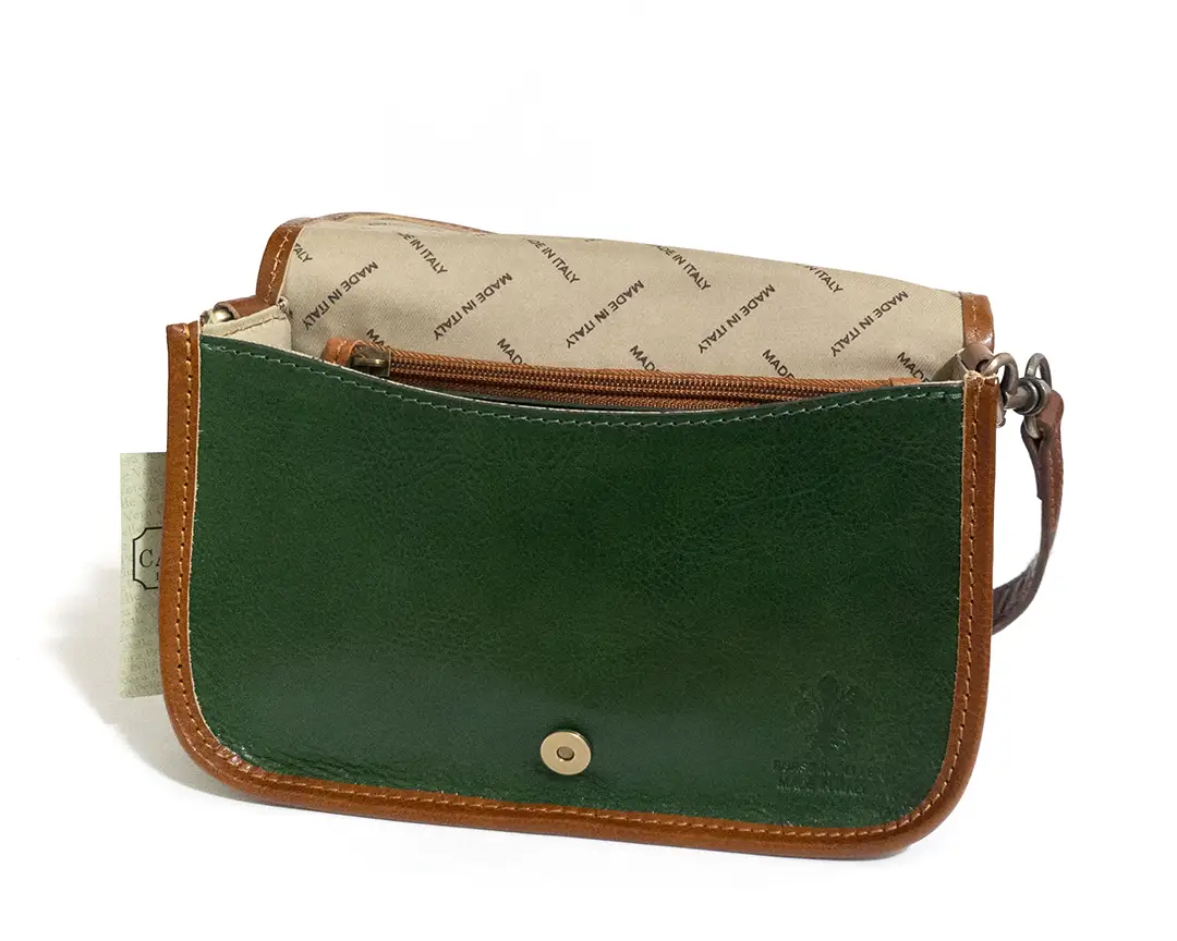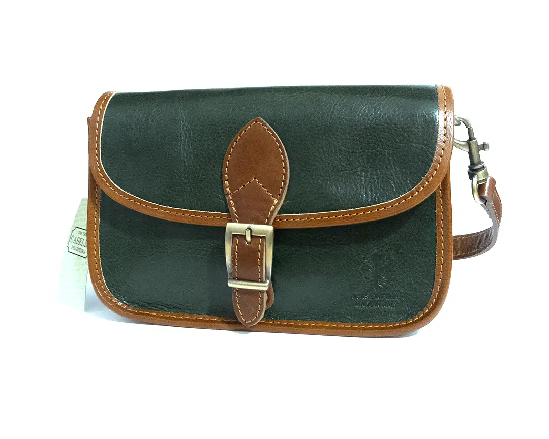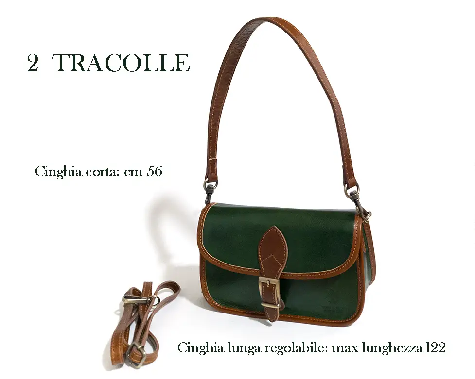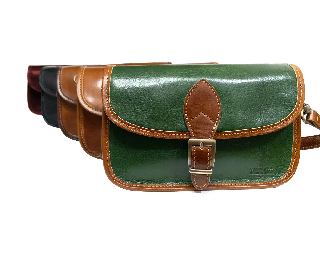 Disponibile in cinque eleganti varianti di colore – rossa, nera, cuoio, cuoio e marrone, verde e cuoio – questa borsetta a tracolla si adatta a ogni stile e occasione.