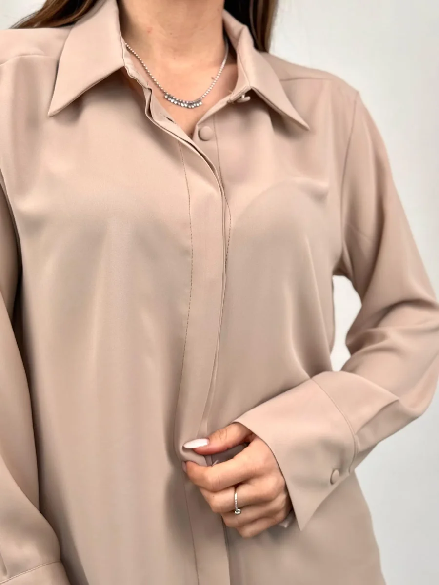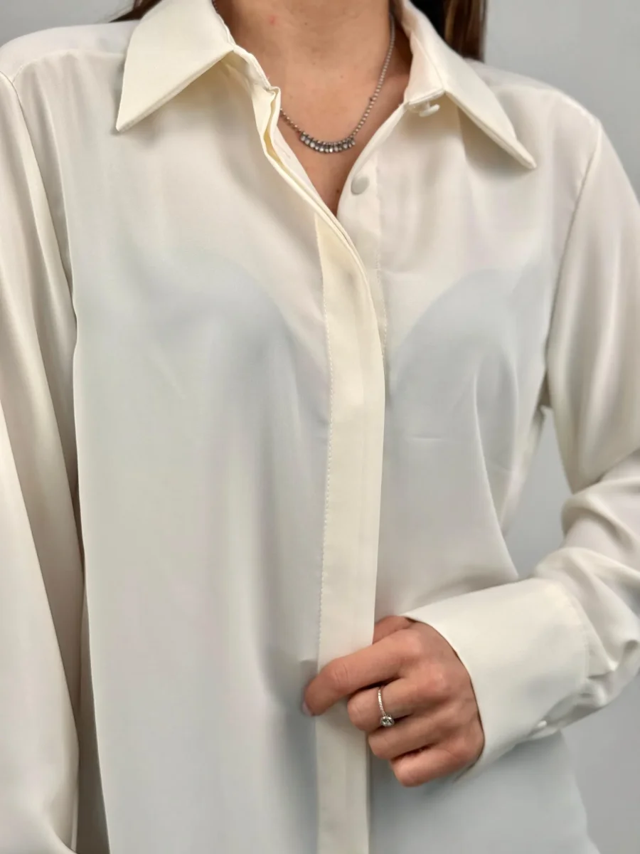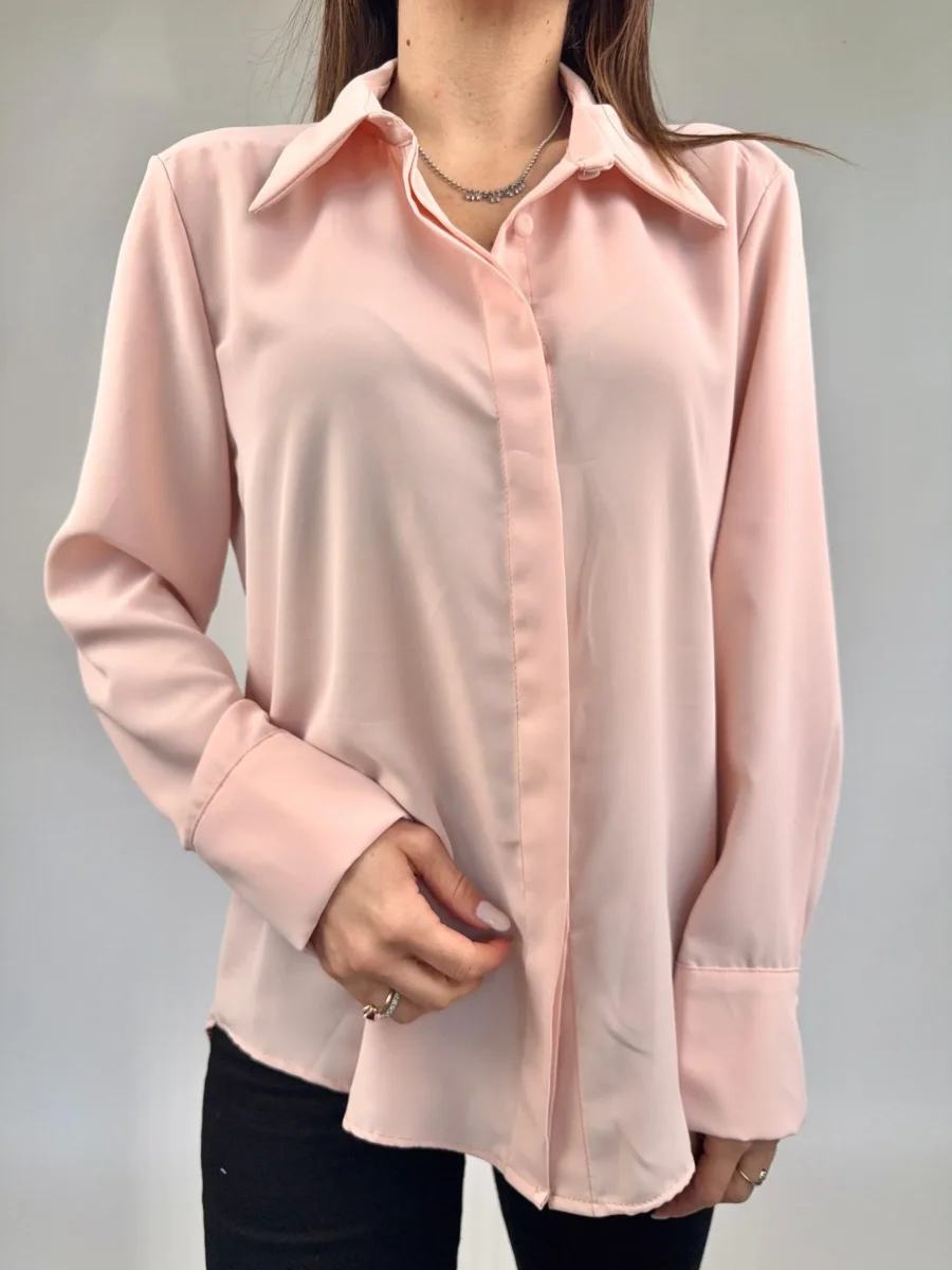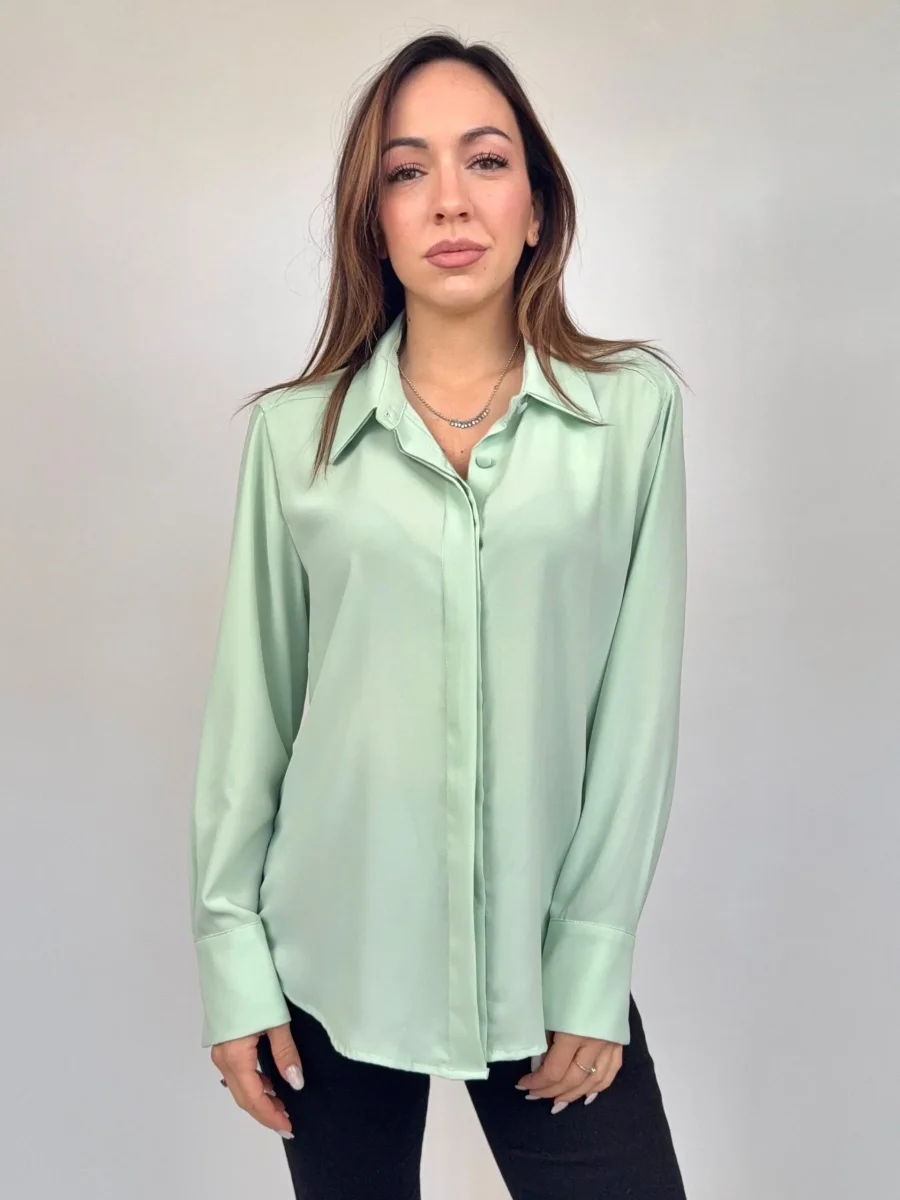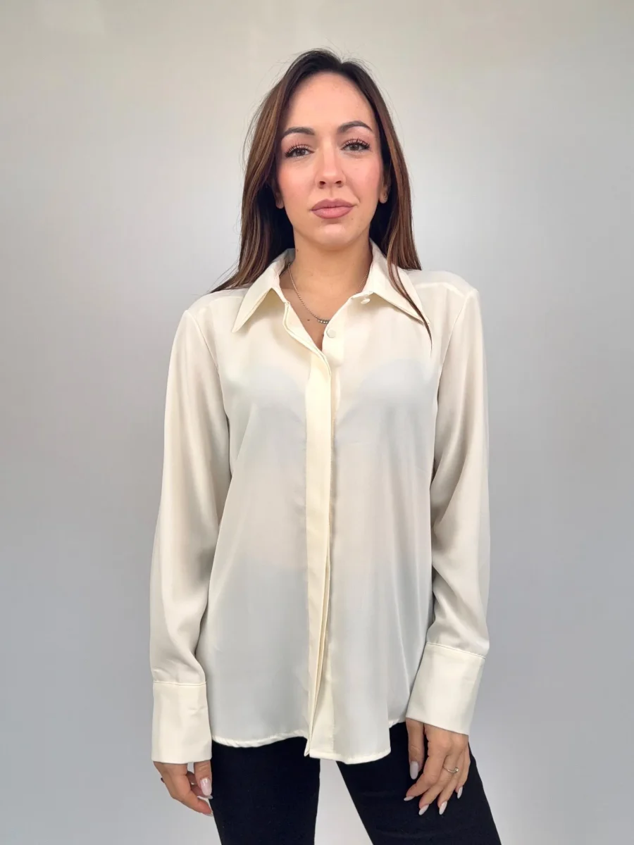 Camicia morbida in tessuto leggero. Chiusura con bottoni. Taglia unica veste una 46 abbondante. Giro seno 104 cm. 100% poliestere Made in Italy.