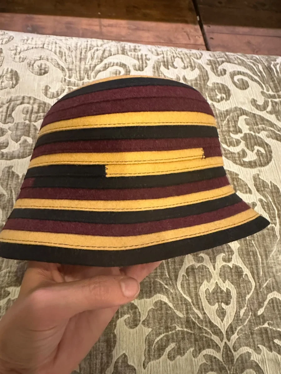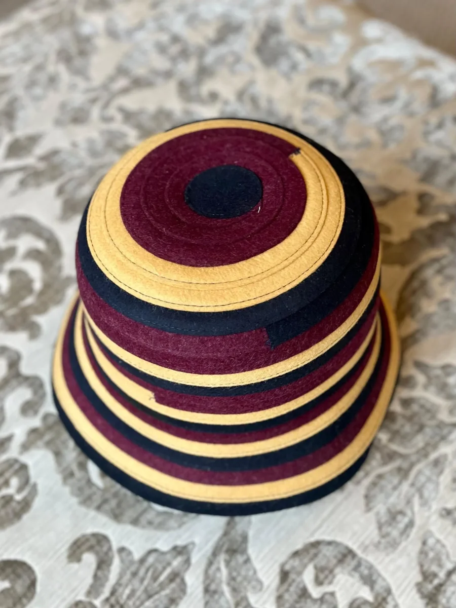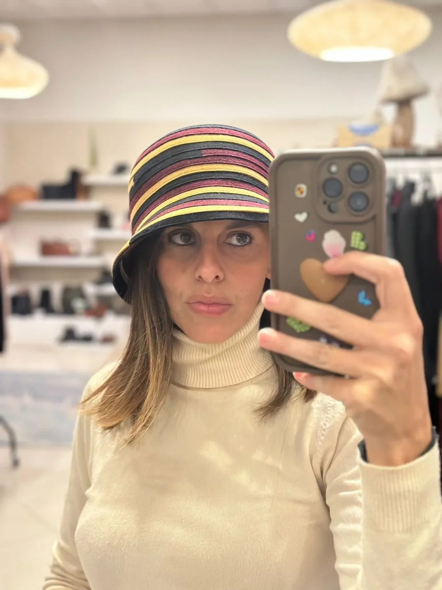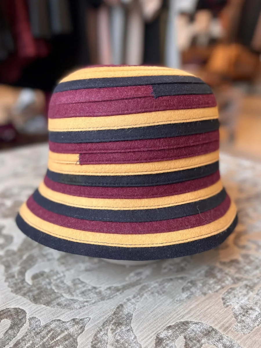 Questo cappello ha un design avvolgente e un bordo medio. Realizzato in feltro, presenta una combinazione di colori caldi come il senape bordeaux ed il nero in strisce orizzontali. Composizione: 100% lana Lavorazione artigianale italiana