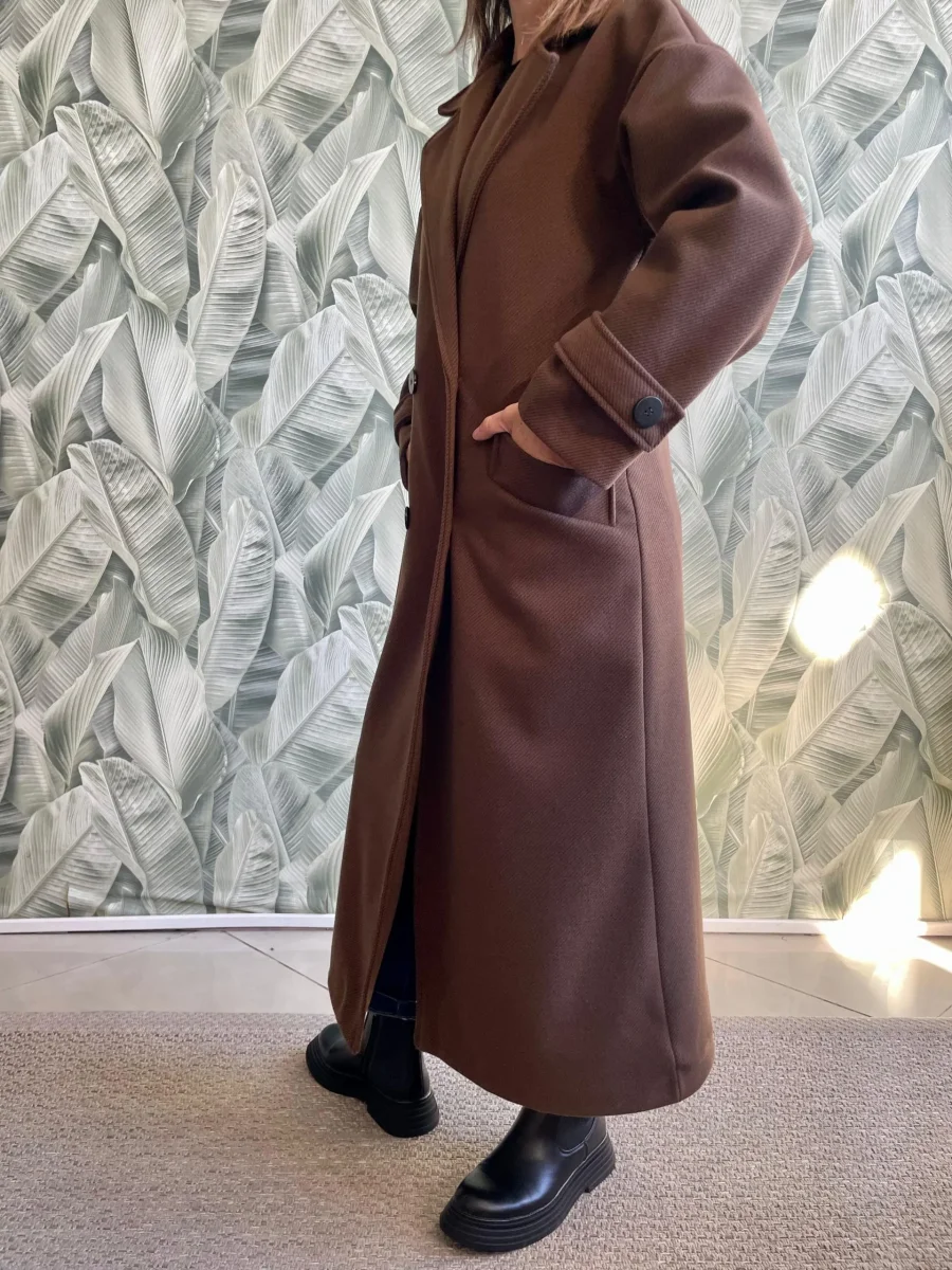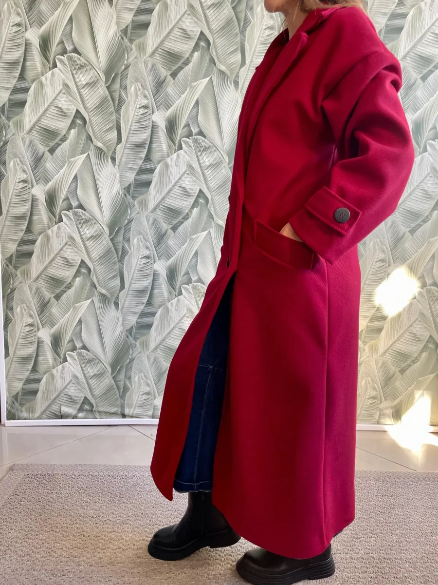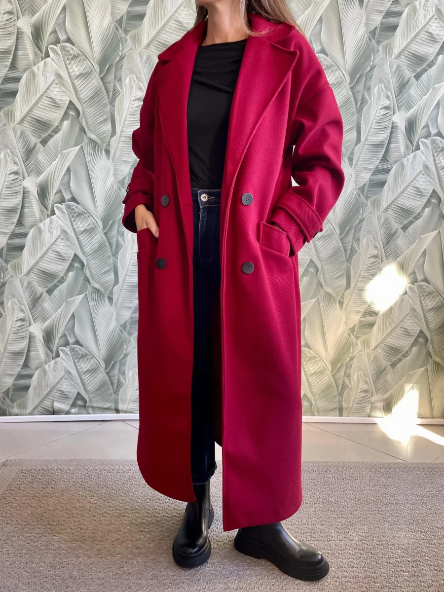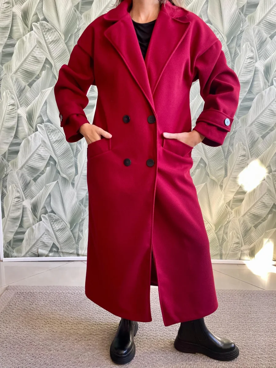 Cappotto doppiopetto Taglio dritto Taglia unica, vestibilità over (veste fino ad una taglia 48) Completamente foderato Colori: rosso e marrone