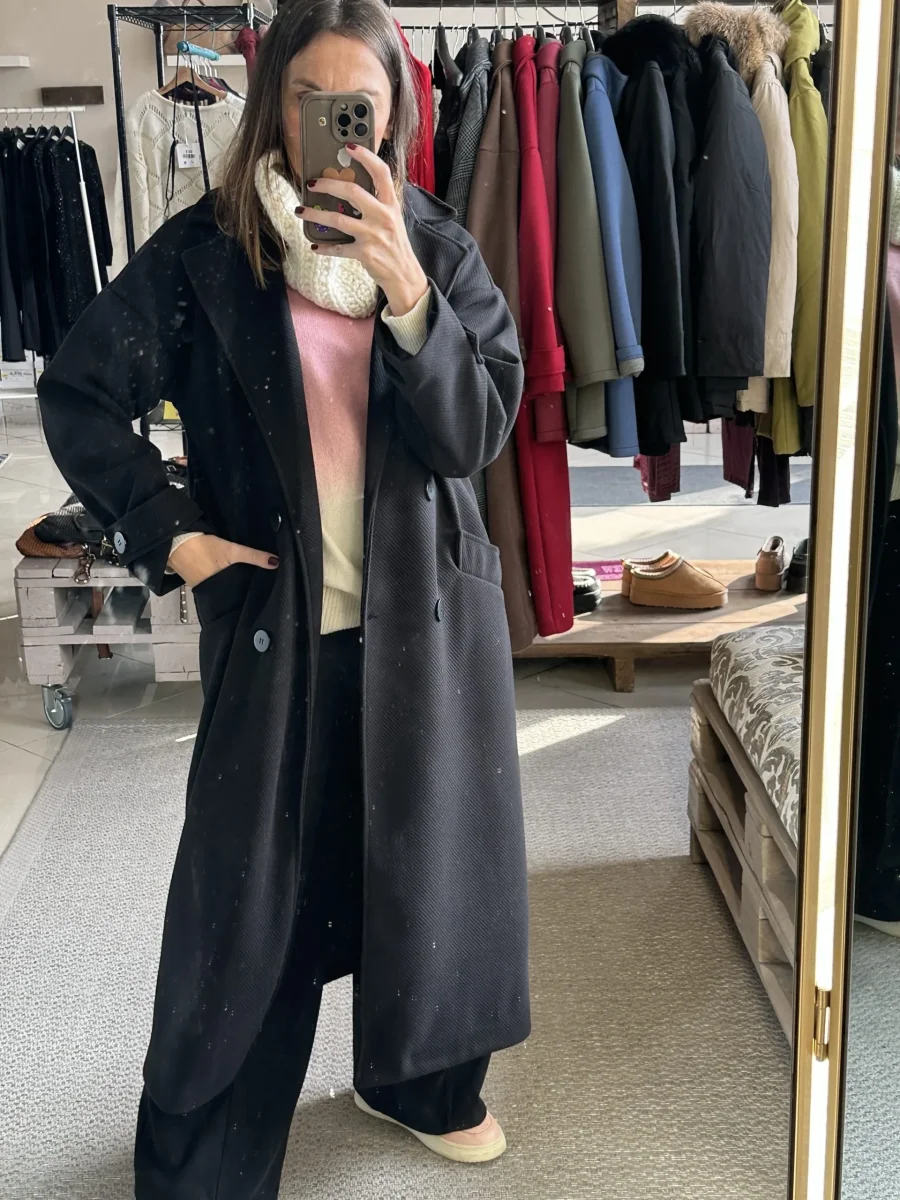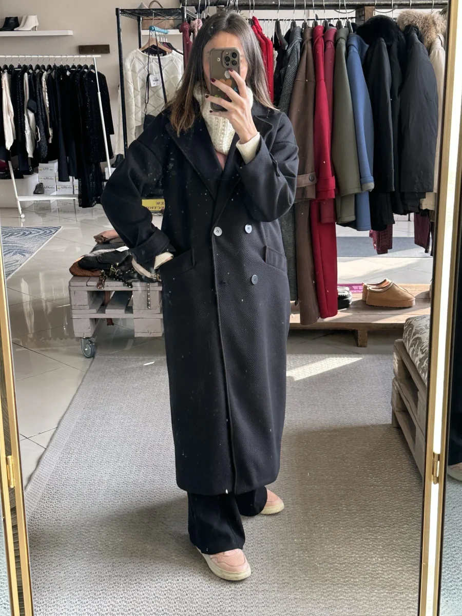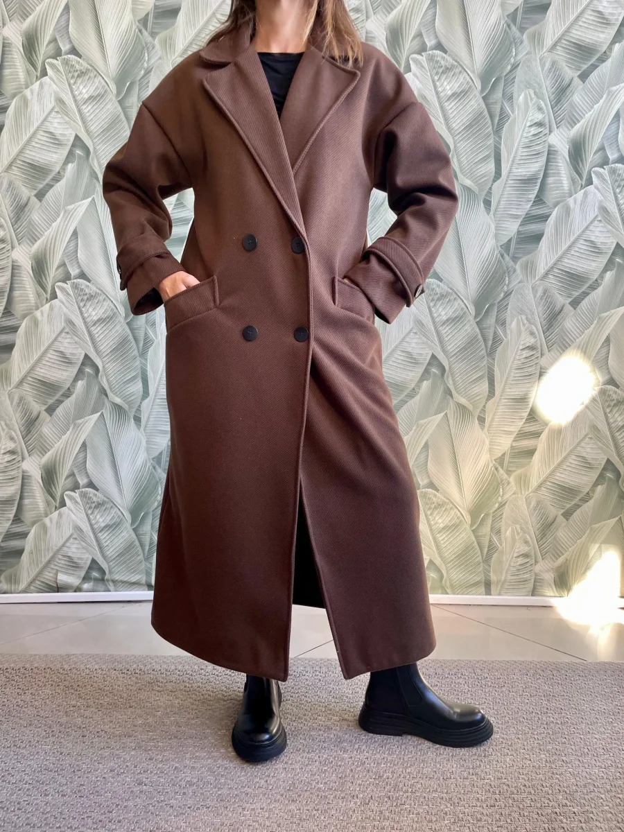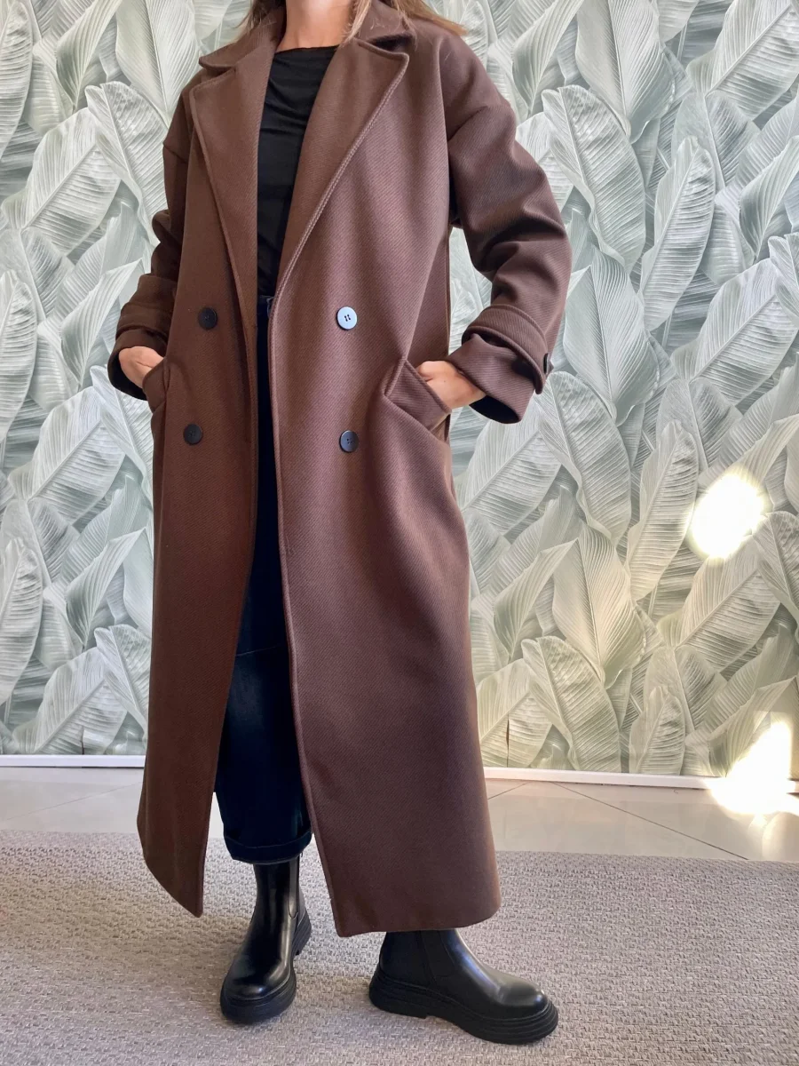 Cappotto doppiopetto Taglio dritto Taglia unica, vestibilità over (veste fino ad una taglia 48) Completamente foderato Colori: rosso e marrone