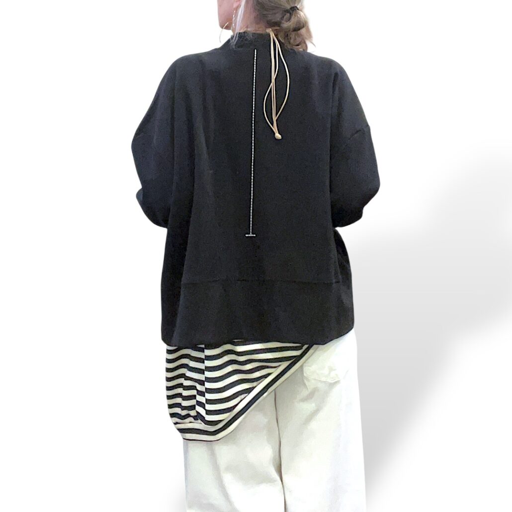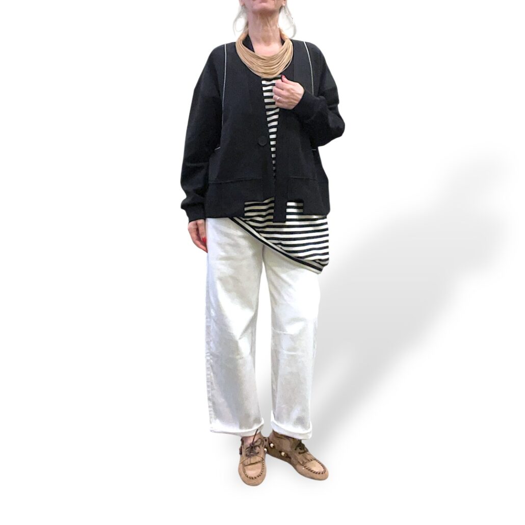 Taglio over a scatoletta. Spalle scese. Maniche lunghe con polsino. Taglio frontale a scaletta. Chiusura con bottone. Cuciture bianche frontali e sul retro. Misto cotone, tessuto morbido.