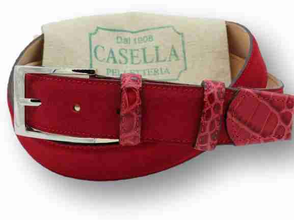 La Cintura Camoscio – Cocco (pelle di vitello scamosciata) è una cintura molto trendy e davvero morbida, realizzata in vera pelle scamosciata con rifiniture doppio passante e puntale in vitello stampato coccodrillo. Interamente Made in Italy. Colori: disponibile nei moderni colori Rosso, Verde Muschio, Arancione Dimensioni: Altezza cm. 3,5 con fibbia nichel lucida. Lunghezza cm. 115 facilmente accorciabile.