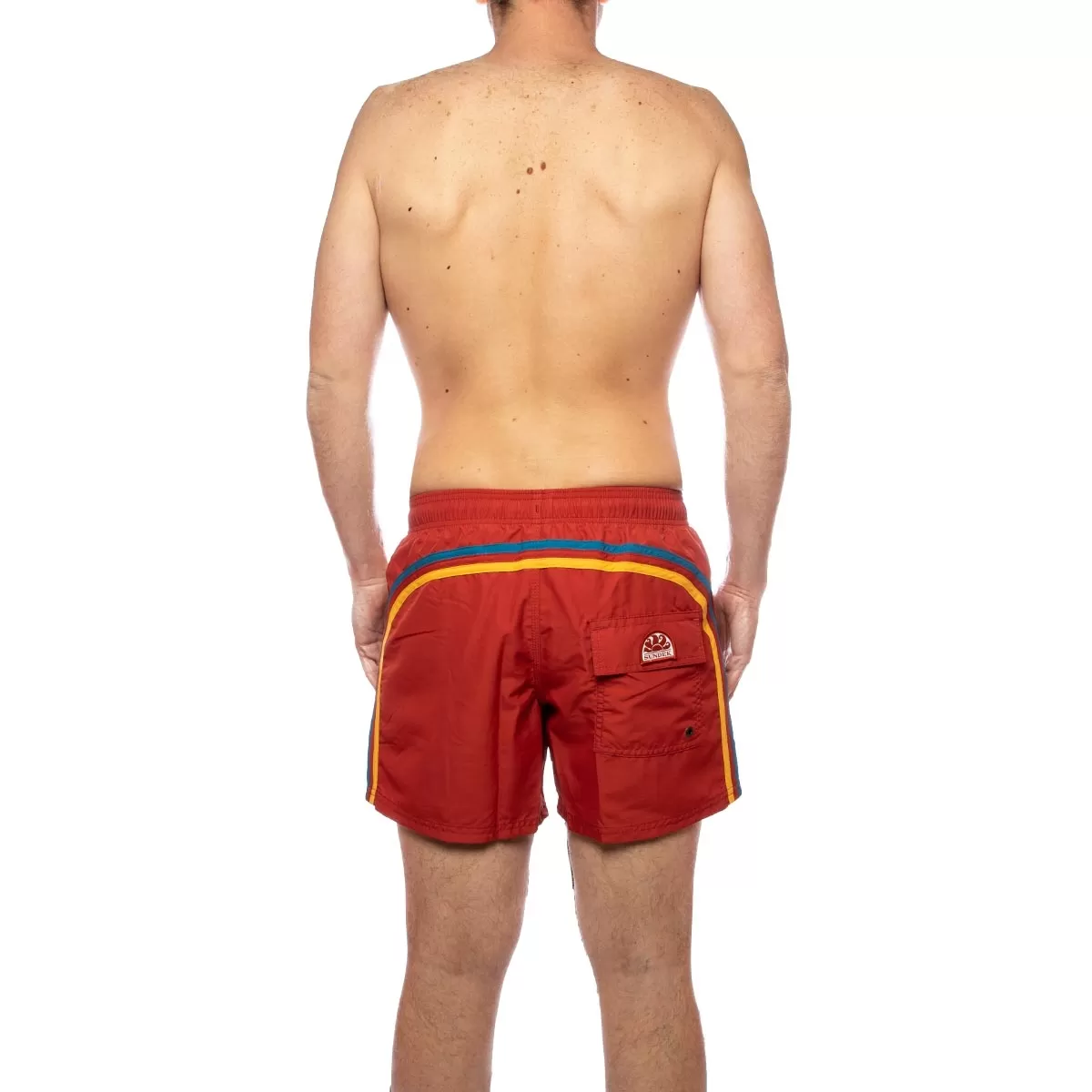Costume mare con taschino dietro e tasche laterali , elastico in vita e coulisse, colore brick red
