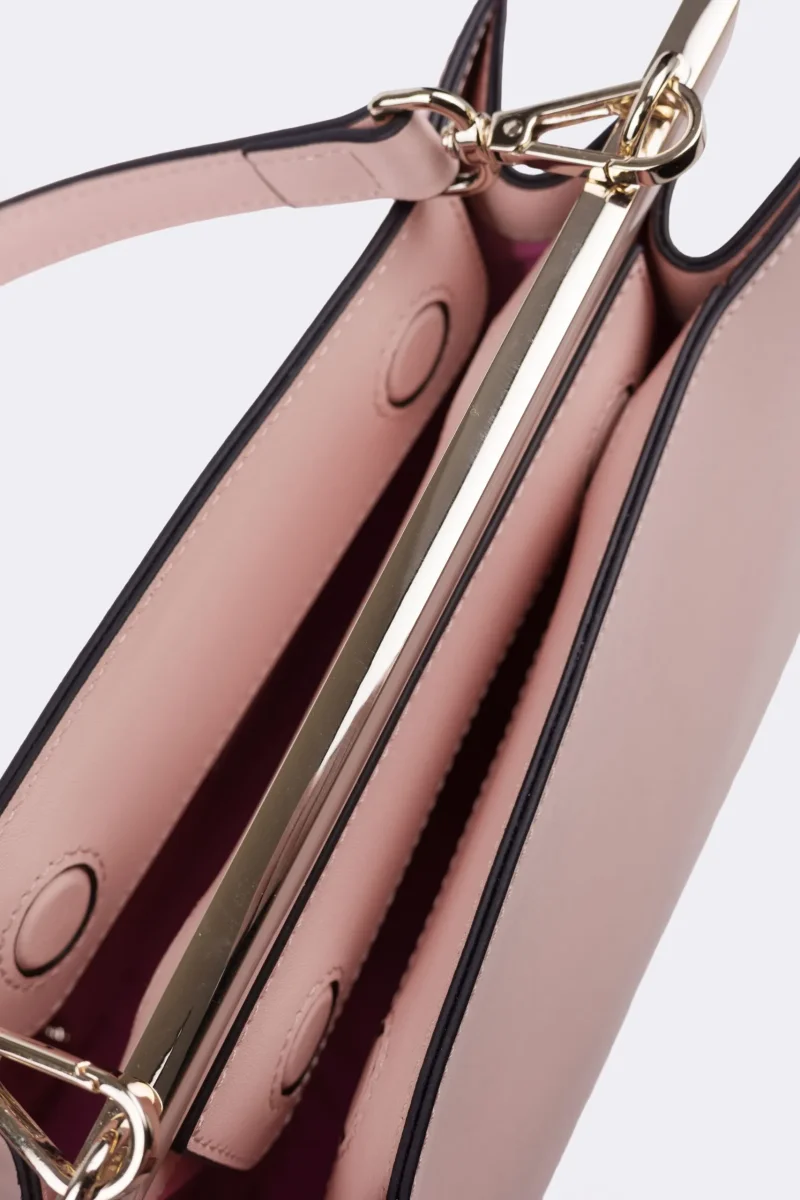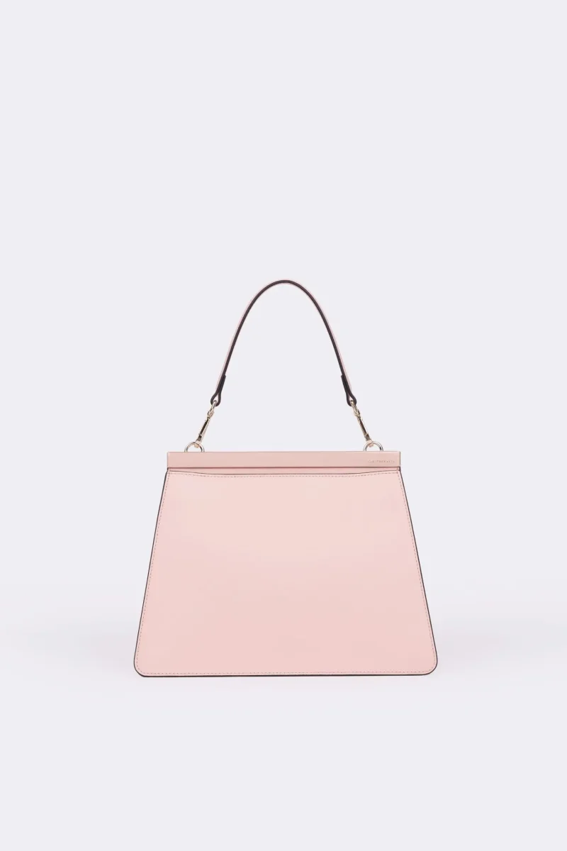 - Borsa a mano realizzata in pelle di vitello liscia, arricchita da una barra metallica smaltata, finitura oro chiaro.