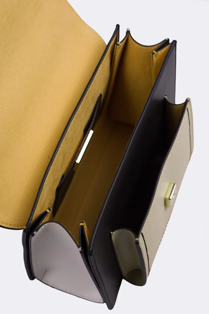 - Borsa a mano realizzata in pelle di vitello liscia, iconica combinazione di colori, chiusura metallica e resina con parte centrale smaltata. Finiture oro chiaro. Dotata di tracolla regolabile in pelle.