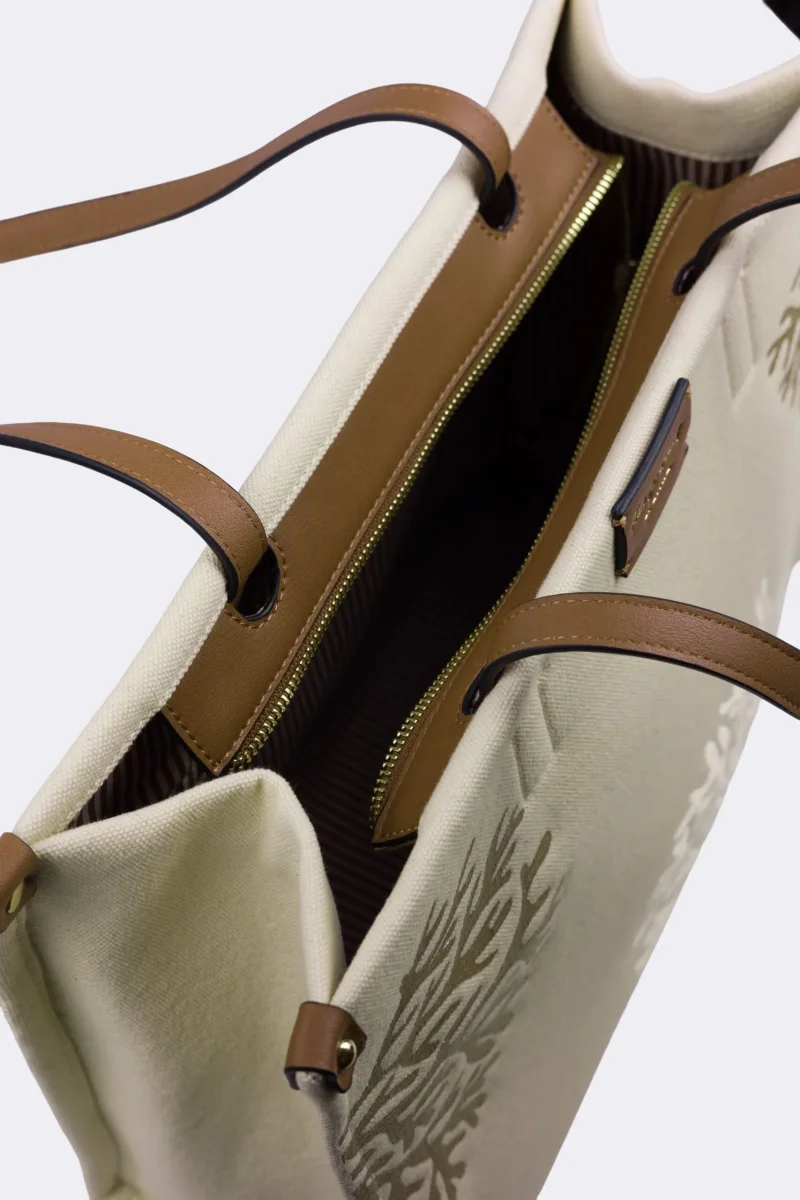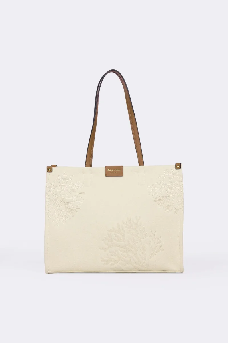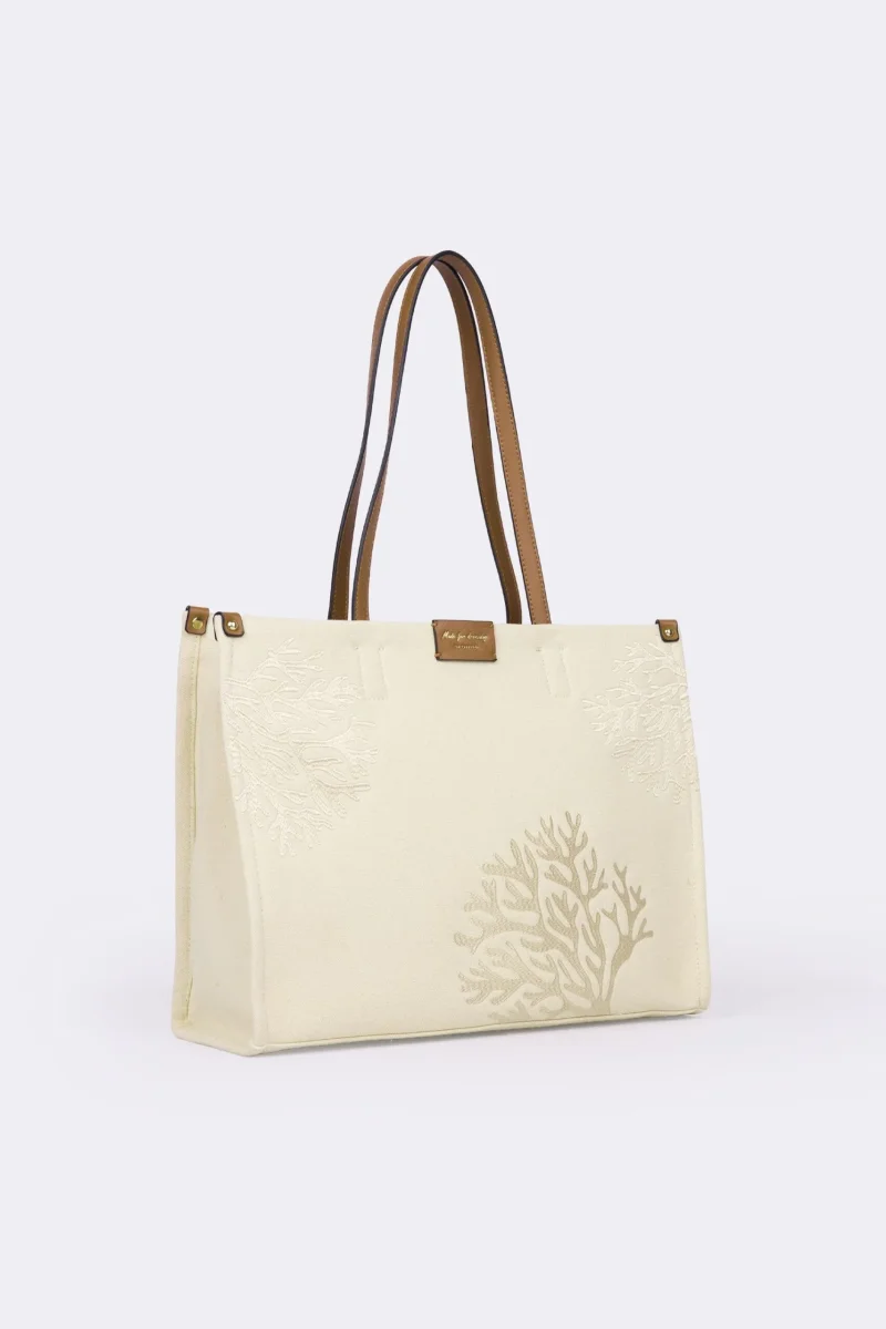 - Shopper in canvas e vitello liscio, con ricamo motivo coralli, patch in pelle logato Cromia.