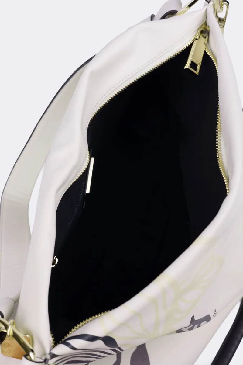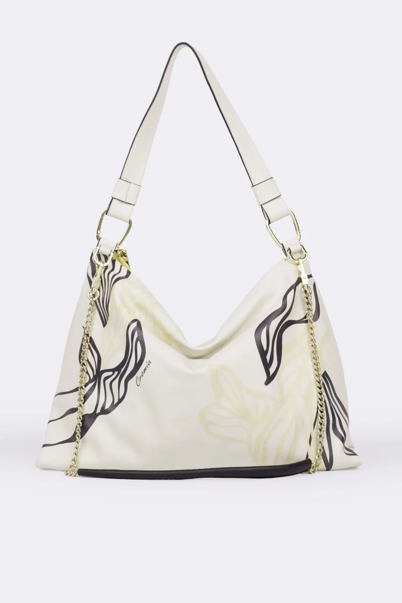 - Hobo in vitello liscio con stampa jungle, tracollina sganciabile in catena e pelle, (possibilità cambio manico) accessori oro chiaro,