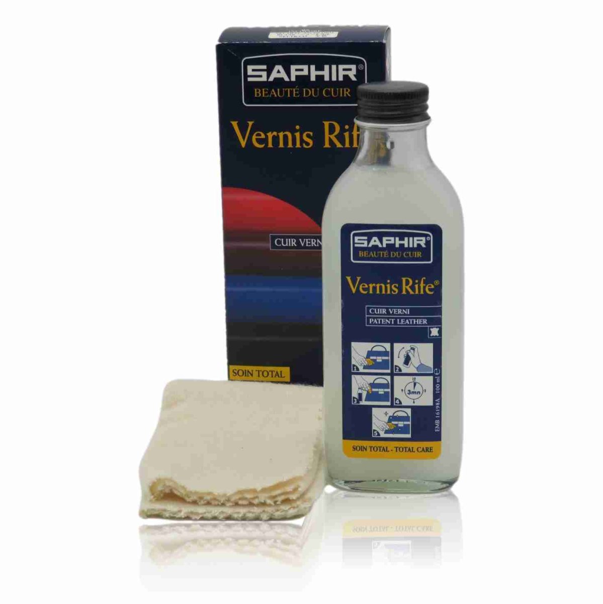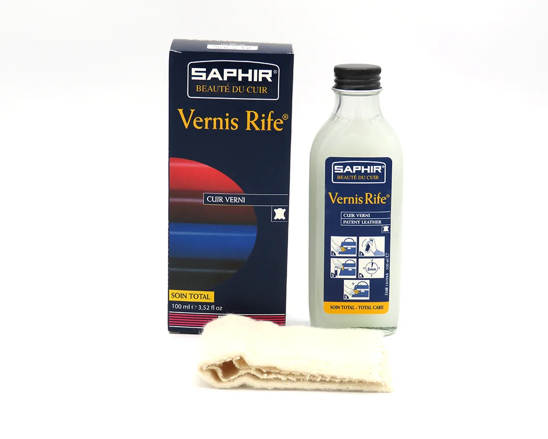Saphir Vernis Rife è un detergente neutro per pulire e lucidare i vostri accessori, borse, cinture o calzature in pelle di vernice di qualunque colore. Elimina le macchie, lo sporco e ridona la lucentezza alla pelle. ISTRUZIONI PER L’USO Eliminare prima la polvere con un panno, passare poco prodotto utilizzando il panno in dotazione strofinando di più su eventuali macchie. Attendere pochi minuti e ripassare con un panno morbido e pulito. Confezione da ml.100 comprendente un panno per l’applicazione del prodotto.