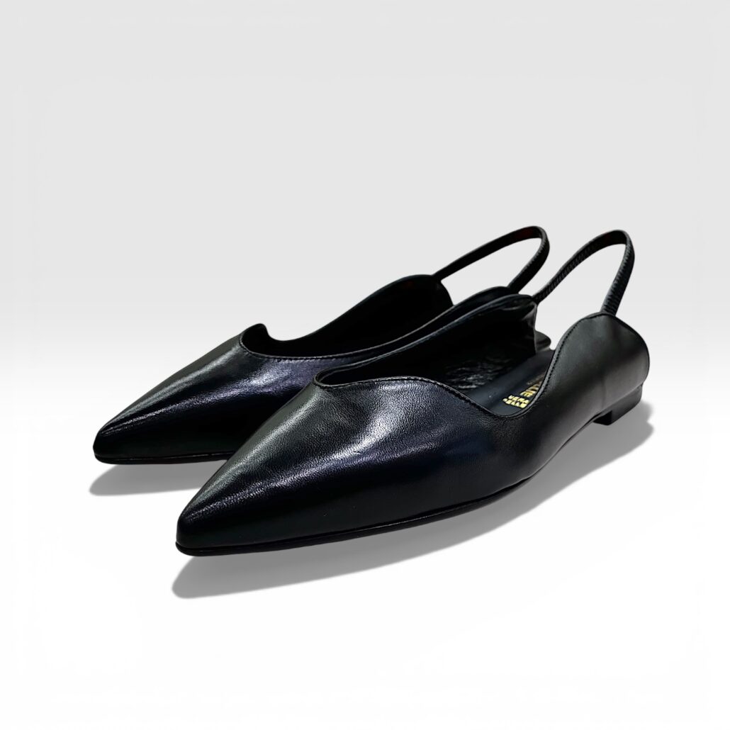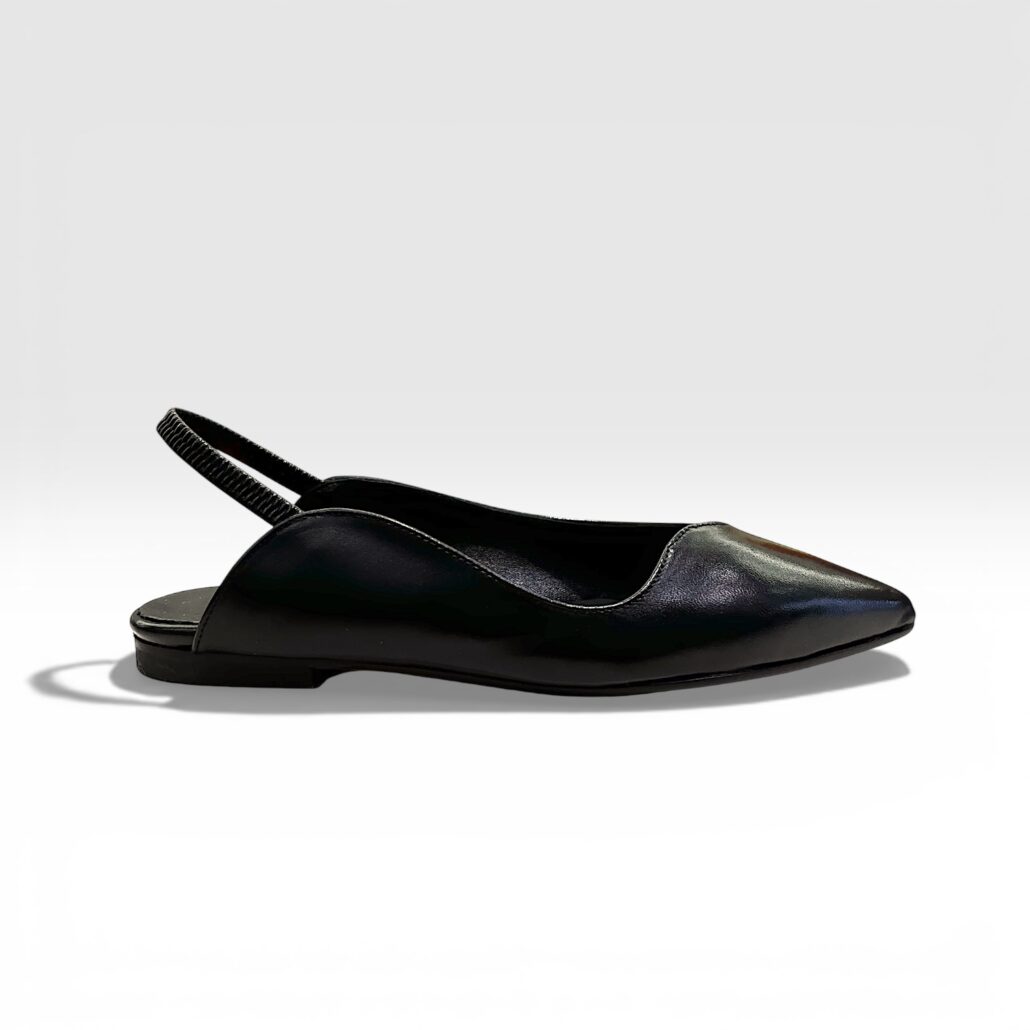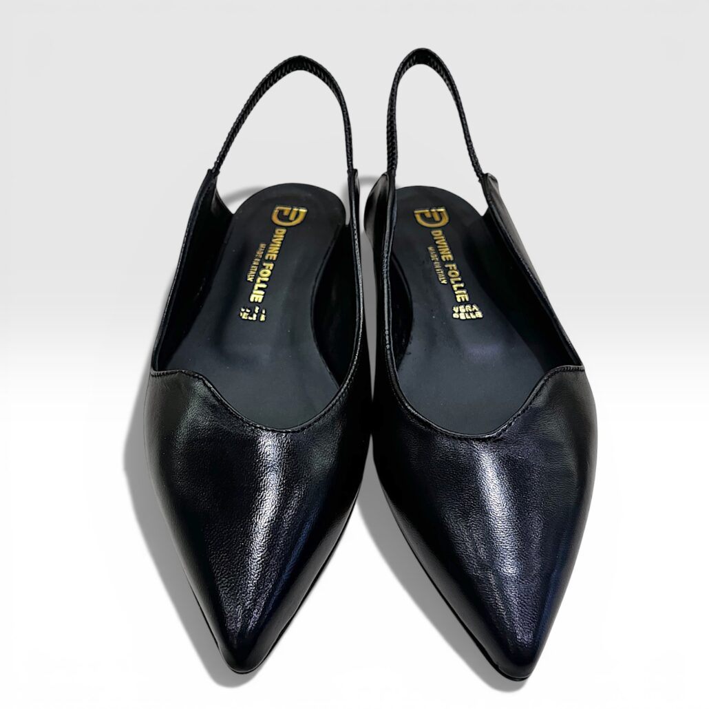 Slingback tacco 1 cm, fondo cuoio e soletta interna in vera pelle. Tomaia in morbida pelle nappata, cinturino elasticizzato e punta sfilata.
