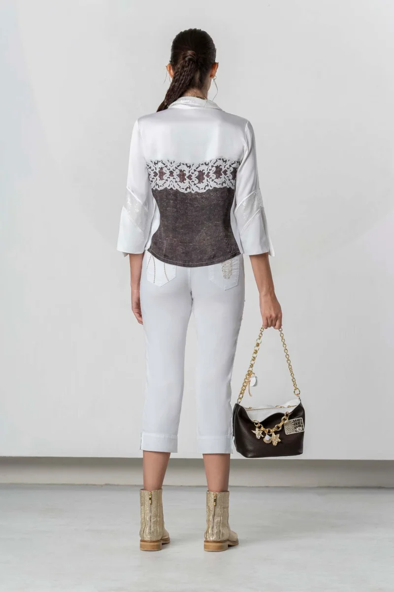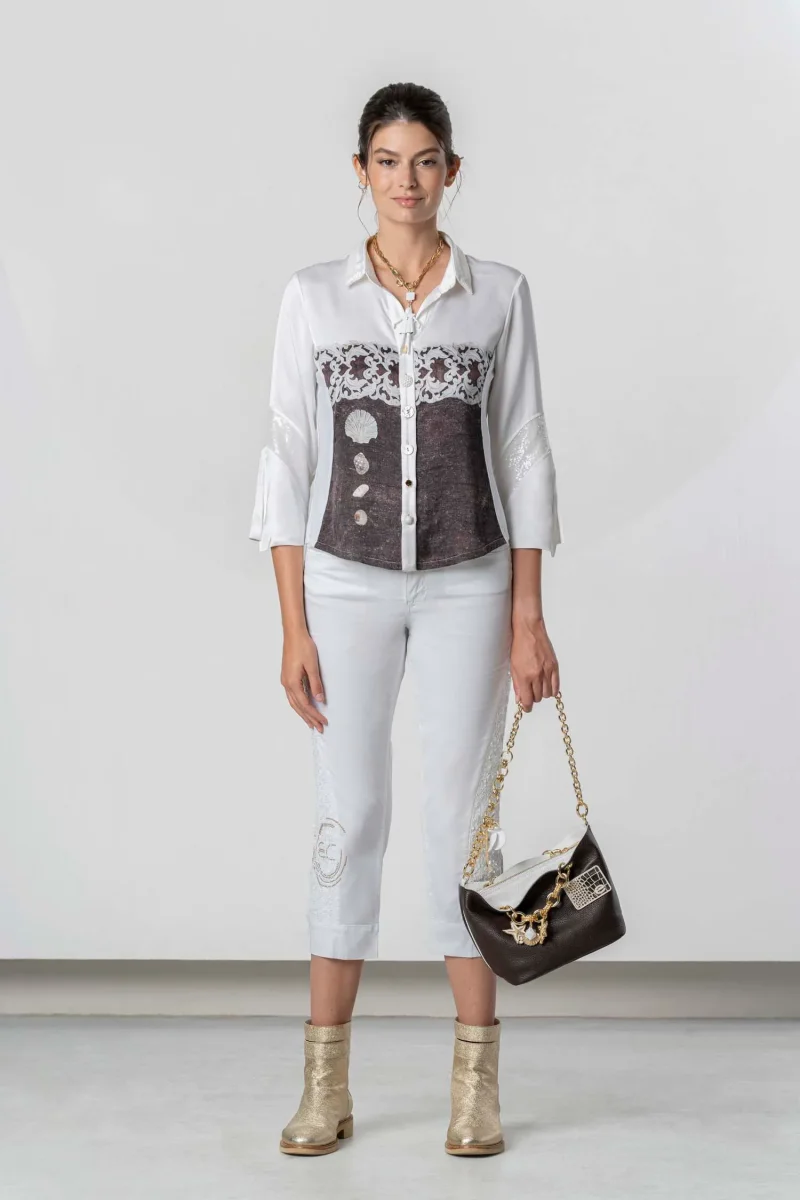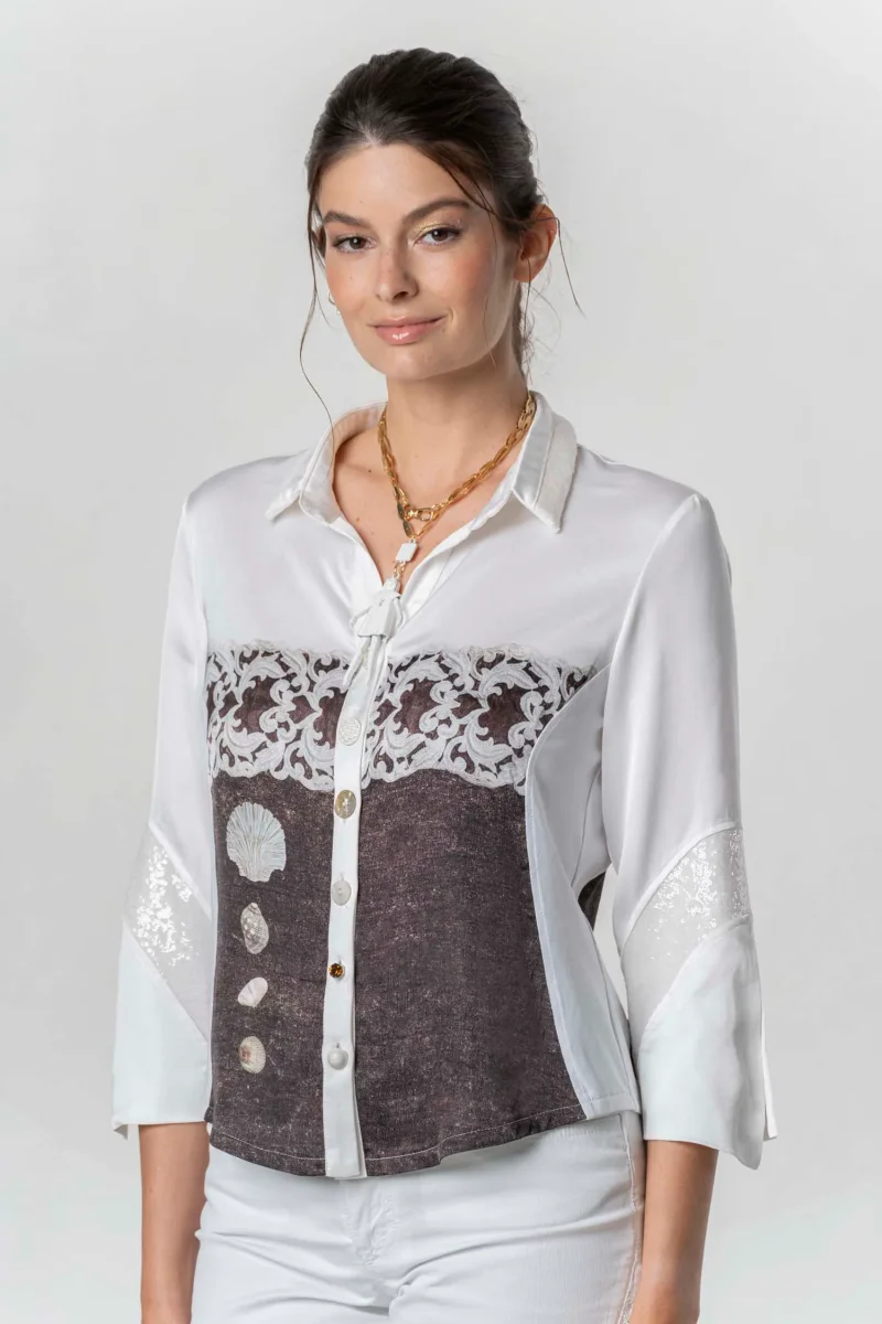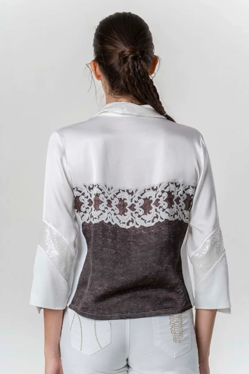 - Blusa in 100% viscosa con maniche a tre quarti. Ccon applicazione in pizzo, Modello goffran con dettagli traforati e applicazioni paillettes. Comoda e elegante blusa, fresca e leggera per i tuoi look estivi. La modella è alta 176 cm e indossa la taglia S.