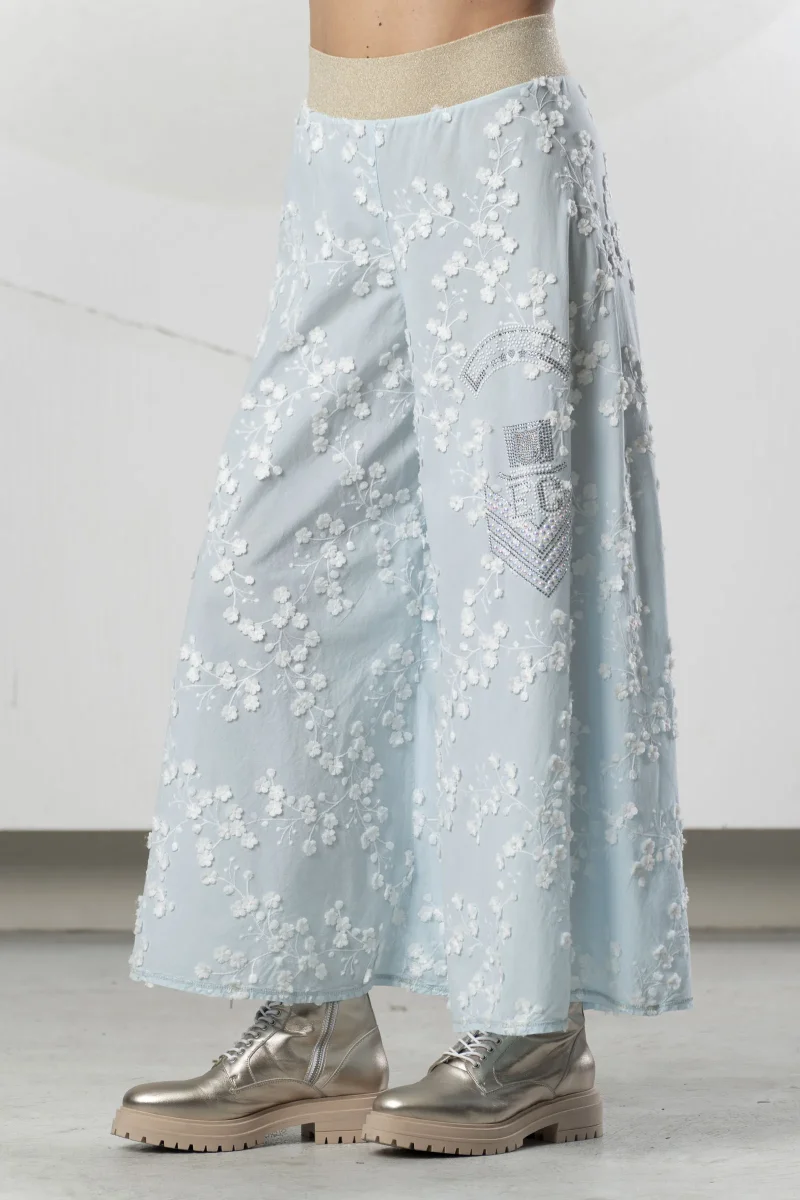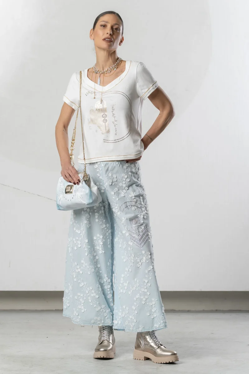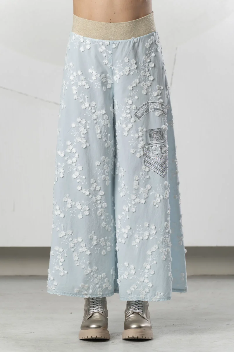 - Pantaloni in cotone azzurro. Ricamo floreale bianco tridimensionale. Applicazione stemma con cristalli e perle. Pantaloni a palazzo. Morbidi pantaloni per look romantici e femminili.