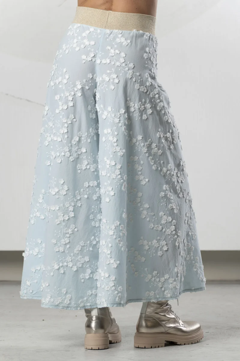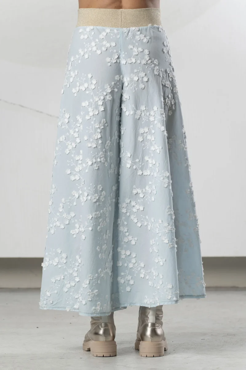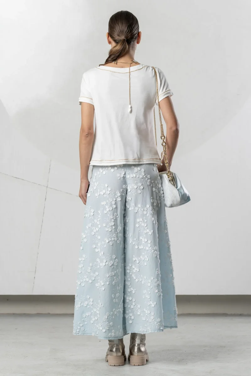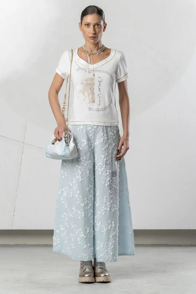 - Pantaloni in cotone azzurro. Ricamo floreale bianco tridimensionale. Applicazione stemma con cristalli e perle. Pantaloni a palazzo. Morbidi pantaloni per look romantici e femminili.