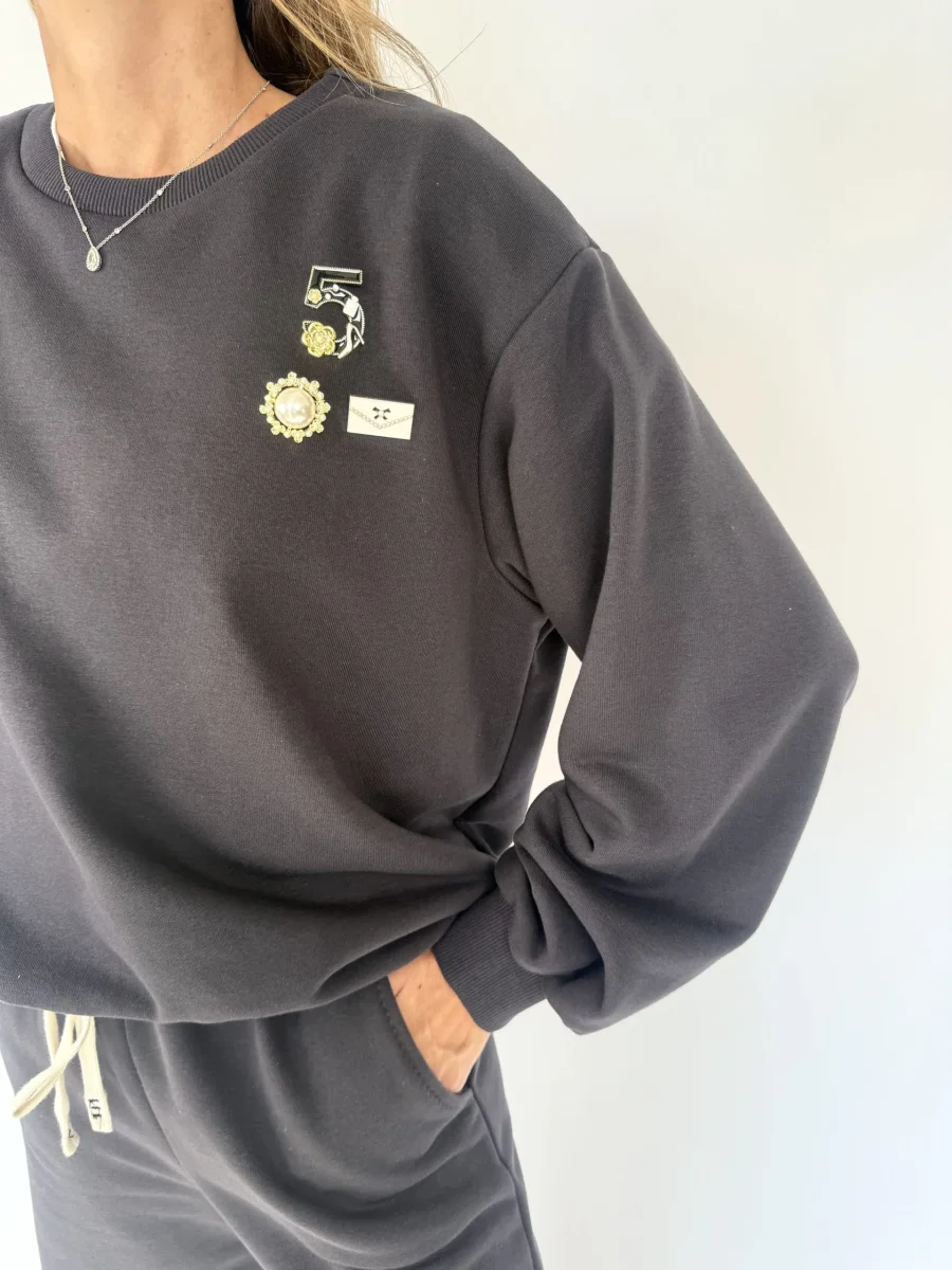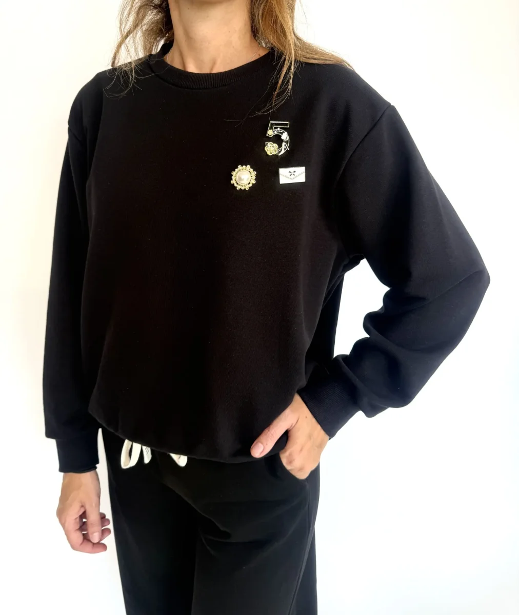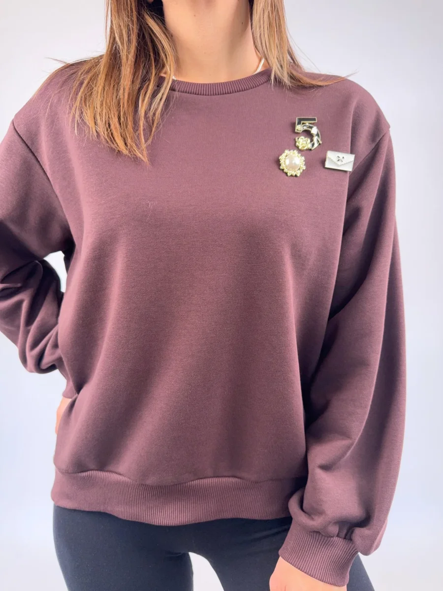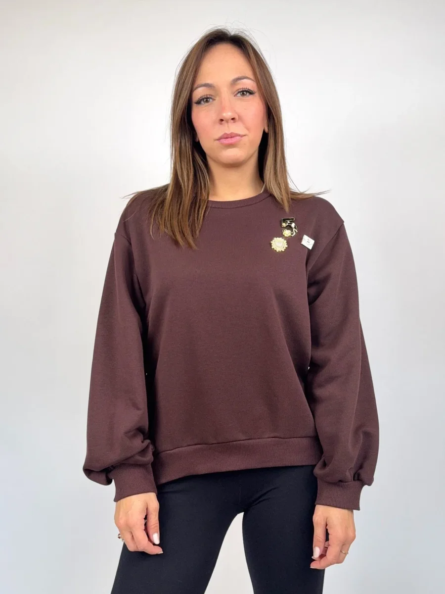 Felpa con spille LEILA. Modello ampio oversize, veste bene una 46. Le spille possono essere rimosse. Materiale: 70% cotone 30% poliestere. Made in Italy