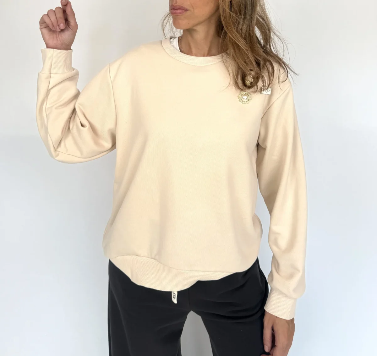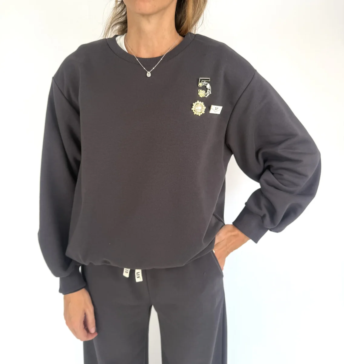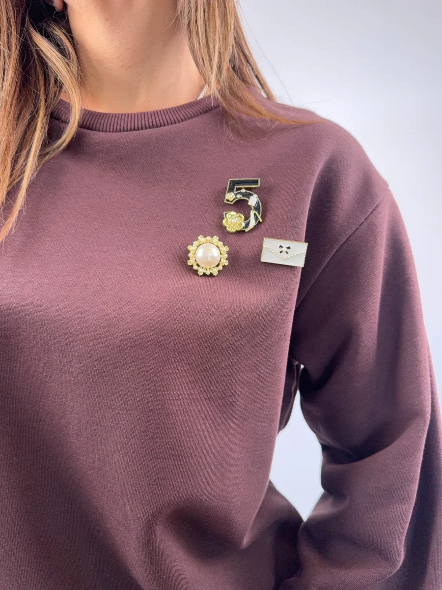 Felpa con spille LEILA. Modello ampio oversize, veste bene una 46. Le spille possono essere rimosse. Materiale: 70% cotone 30% poliestere. Made in Italy