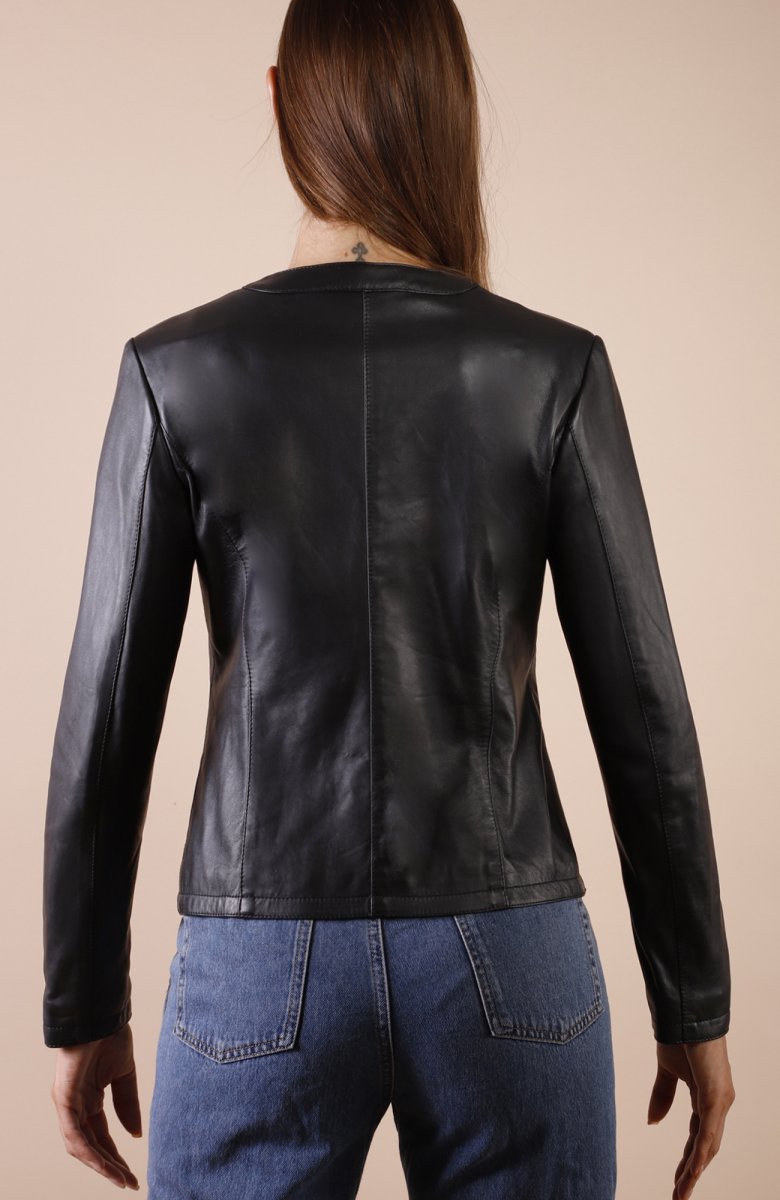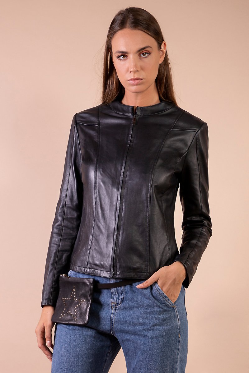 Giacca lineare in vera nappa con tagli sagomati sul davanti e zip in metallo color canna di fucile. Fodera stretch, vestibilità regolare.