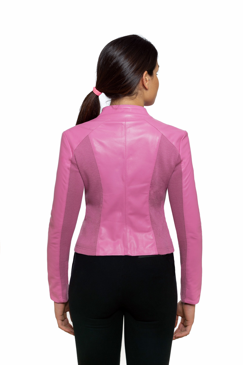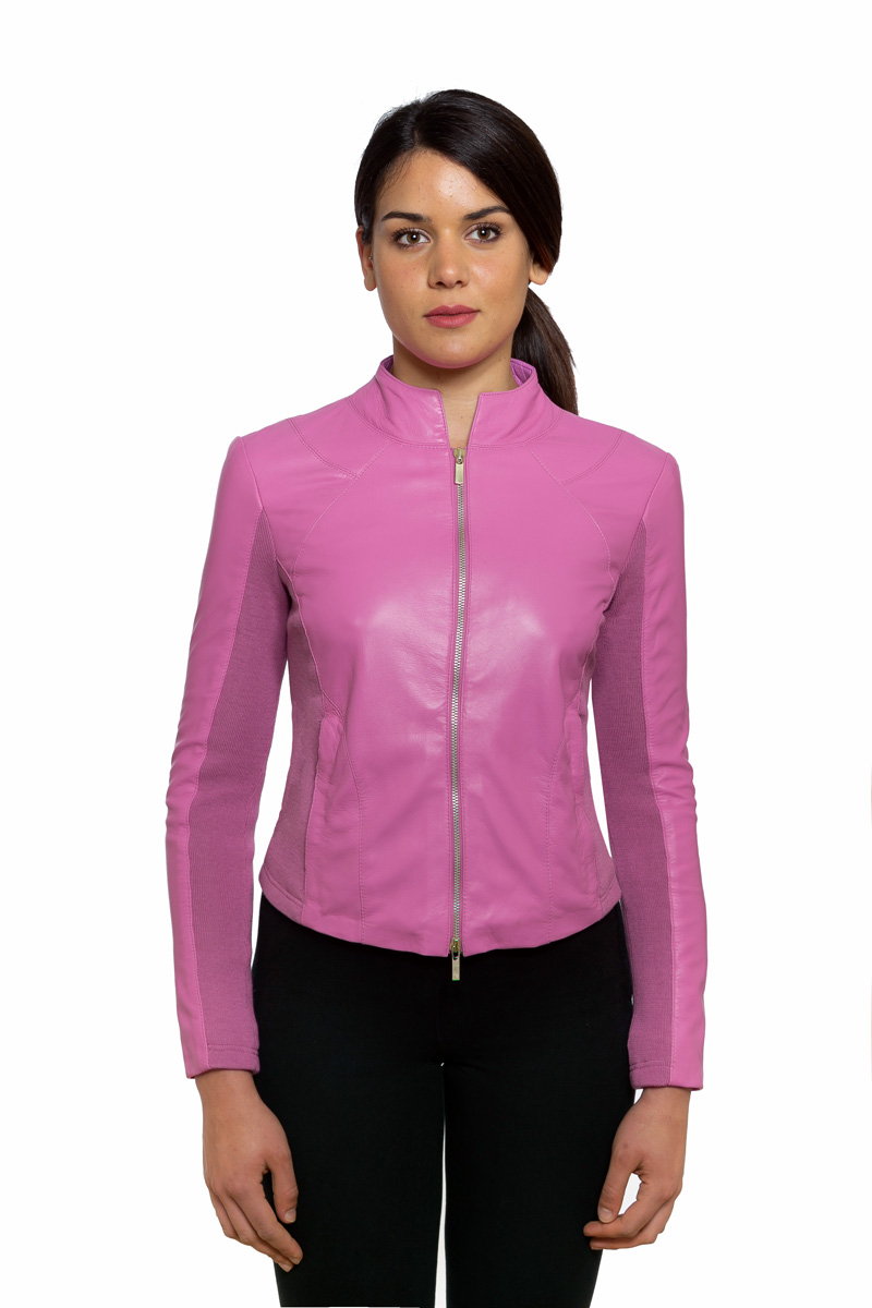 Giacchino in morbida nappa ovina e calda maglia in lana stretch nei fianchi e sottomanica. Il colore fuxia rende un capo pulito ed essenziale nuovo ed attuale