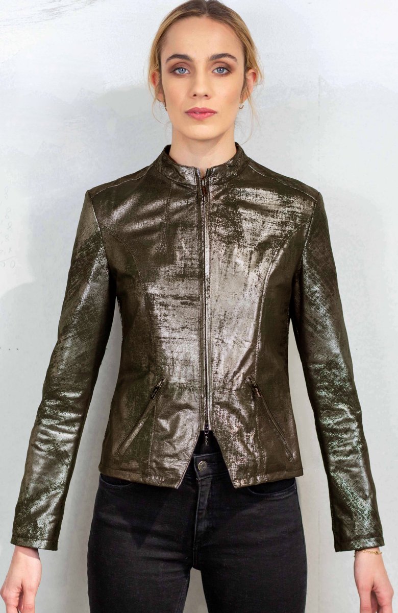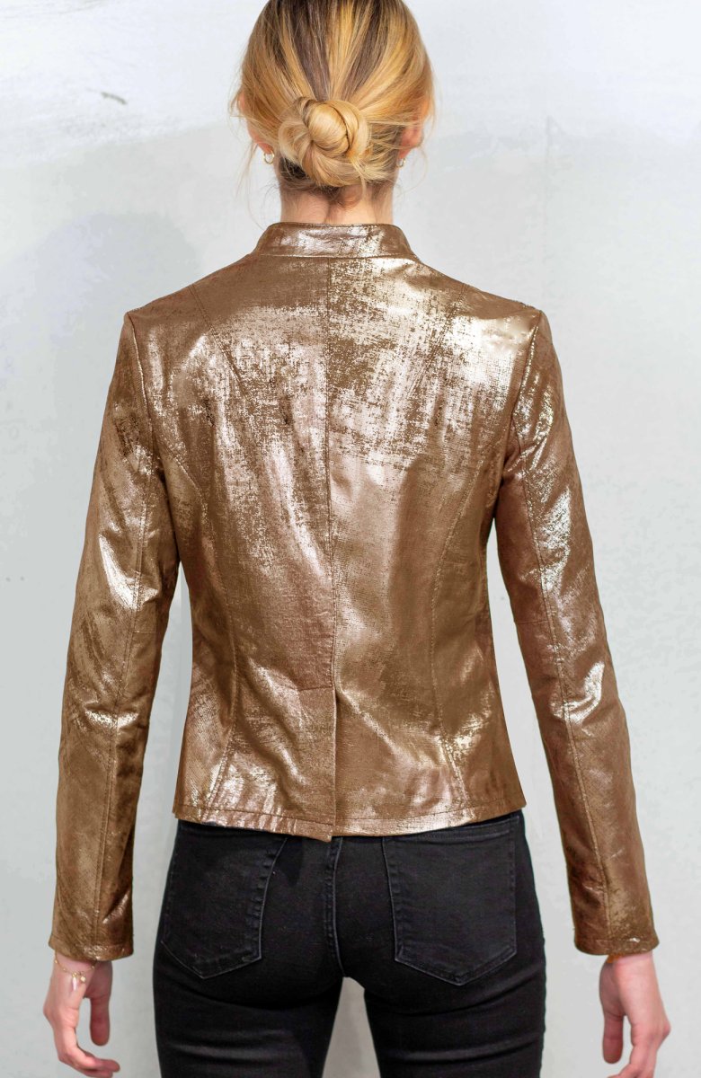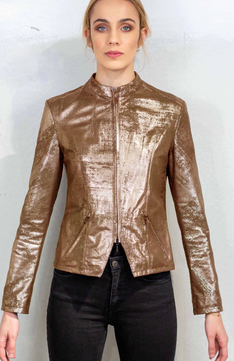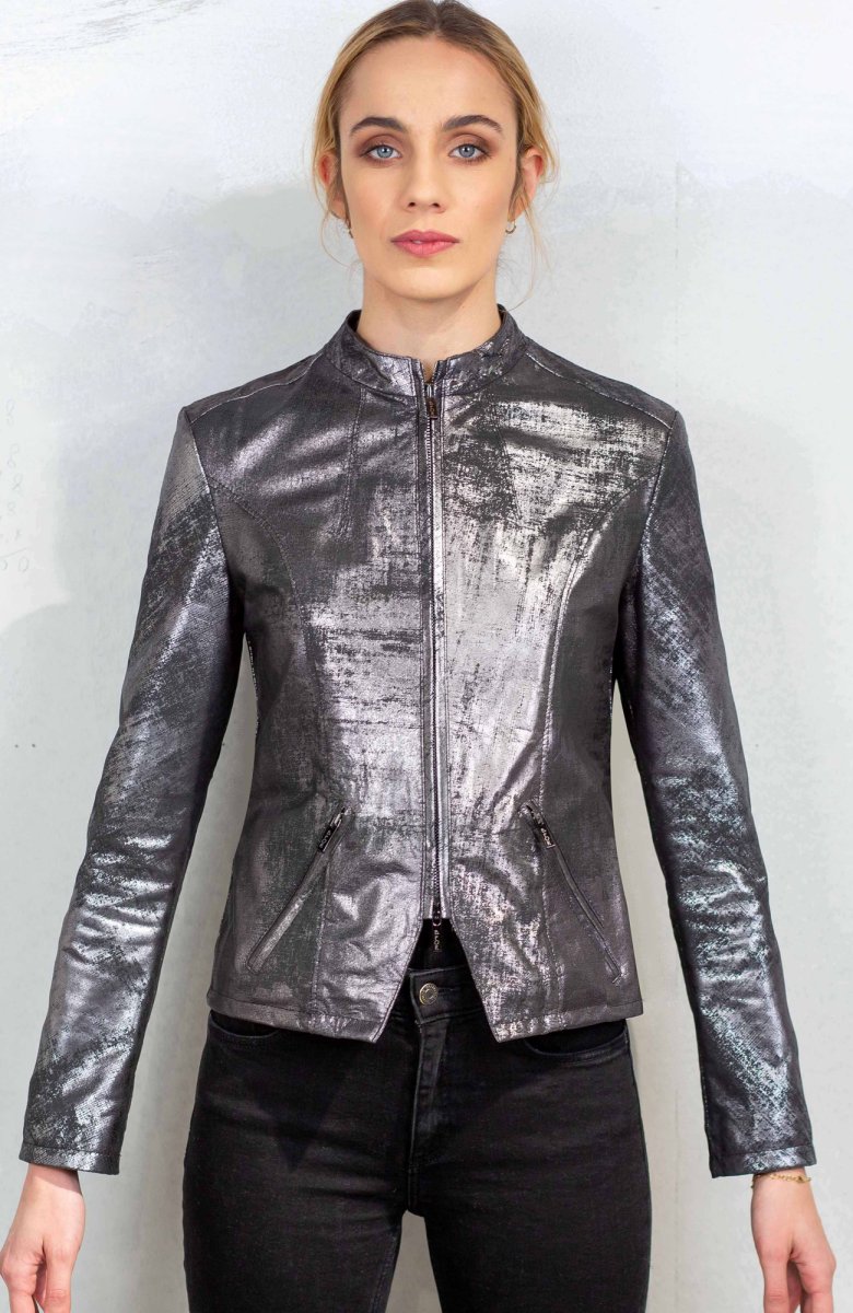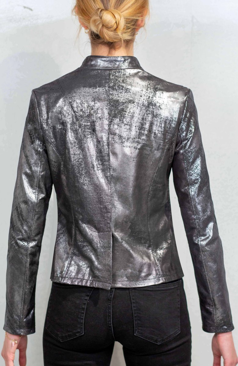 Giacchino in vera nappa con effetto screziato metallizzato con zip davanti. Fodera di jersey stretch, vestibilità regolare.