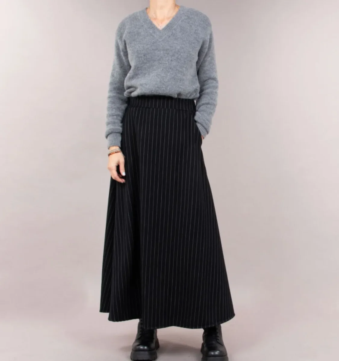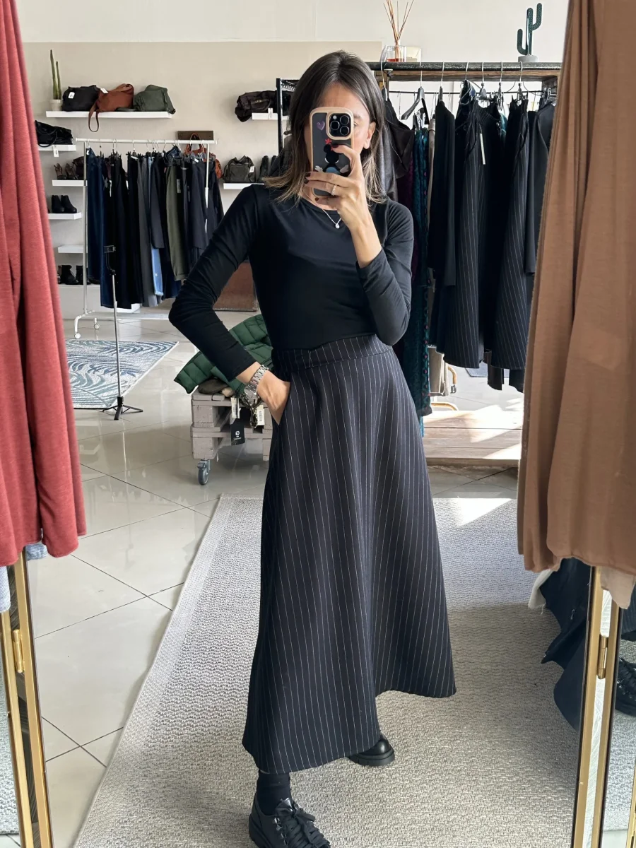 Gonna gessata con elastico in vita Composizione: 63%poliestere 34%viscosa 3%elastane Tasche laterali, vestibilità regolare Taglie disponibili dalla S alla L Made in Italy