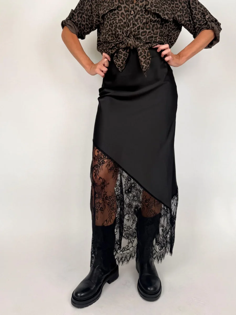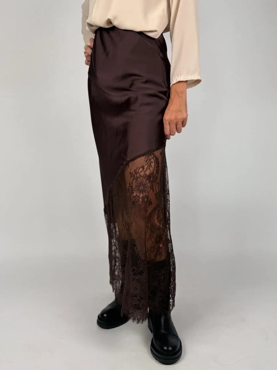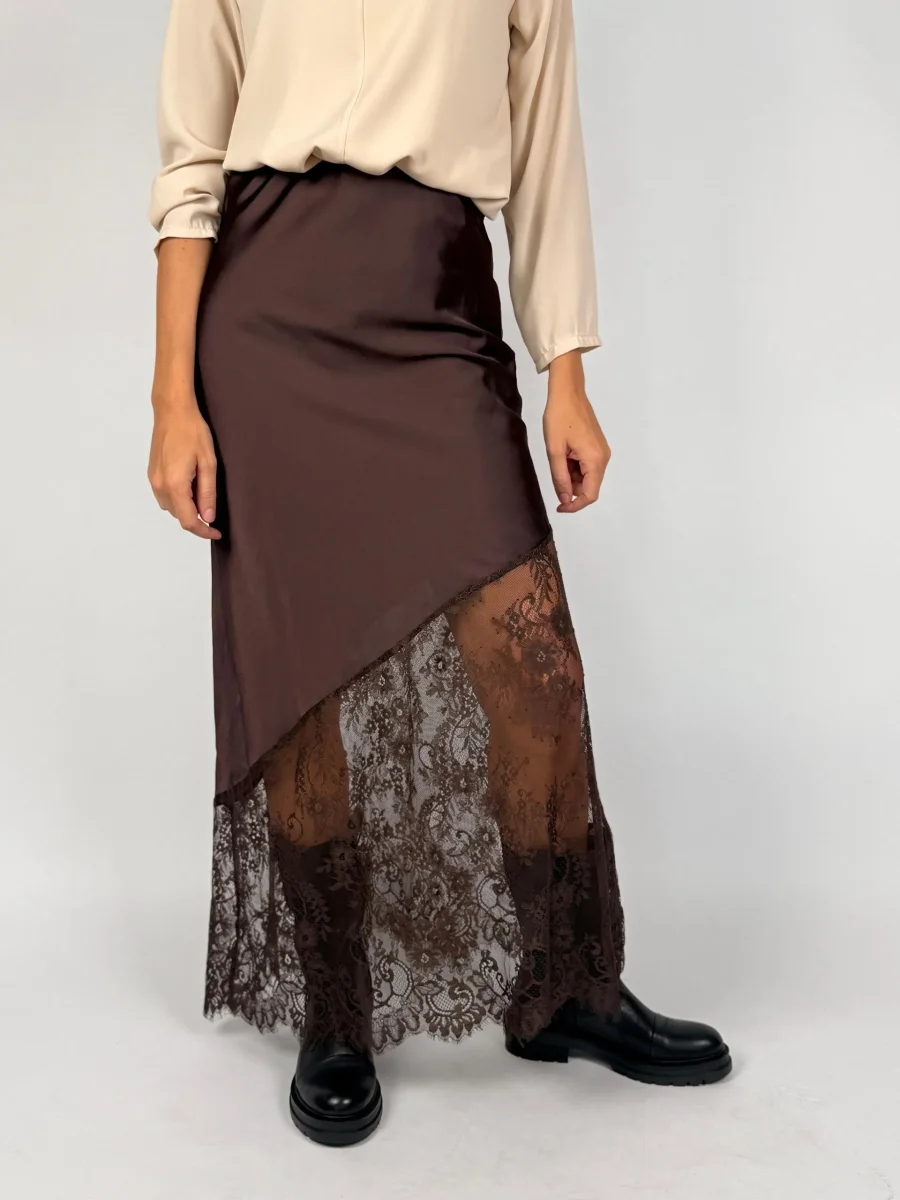 Gonna in raso, con parte finale in pizzo. Elastico in vita. Taglia unica che veste fino a una 44. Made in Italy