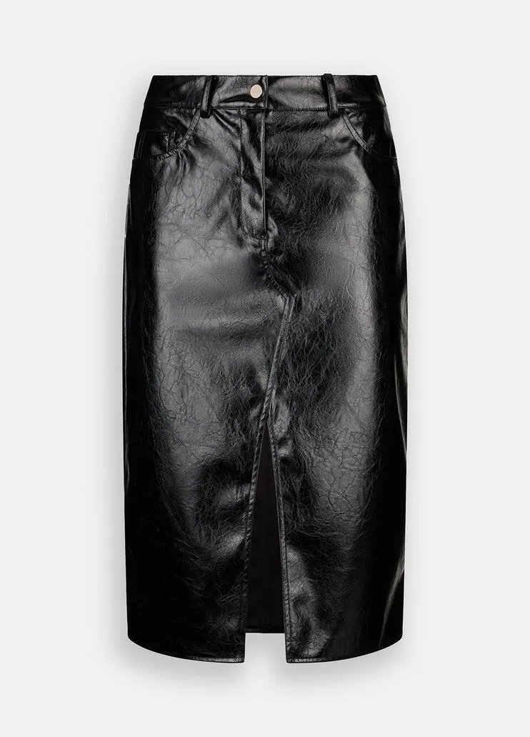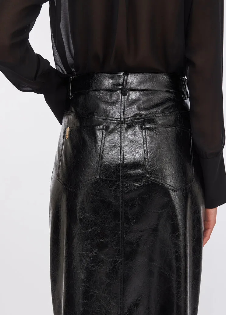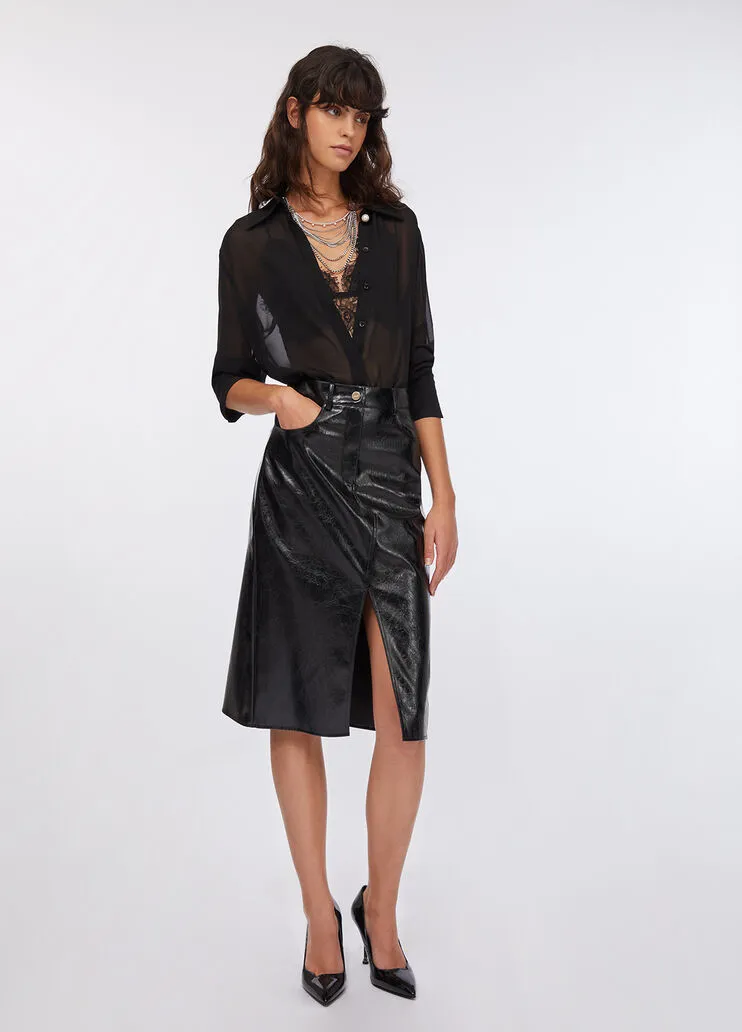 liujo Gonna ecosostenibile UF5232E1038U9822 Gonna longuette nera Realizzata in tessuto spalmato lucido Modello cinque tasche Spacco sul davanti Logo in metallo Chiusura con bottone e zip nascosta Codice web 58/70 Napoli Composizione 100% Poliestere Visita la nostra pagina facebook boutique flair