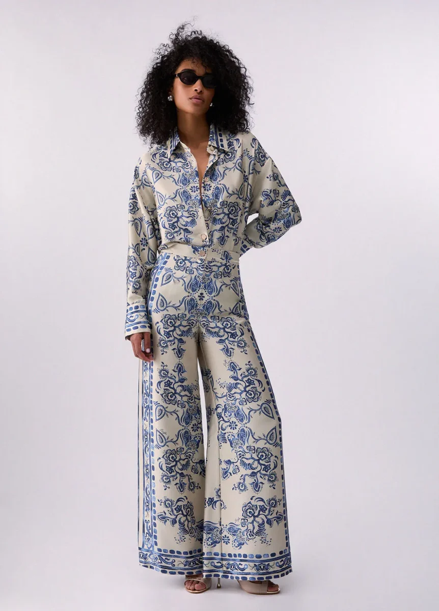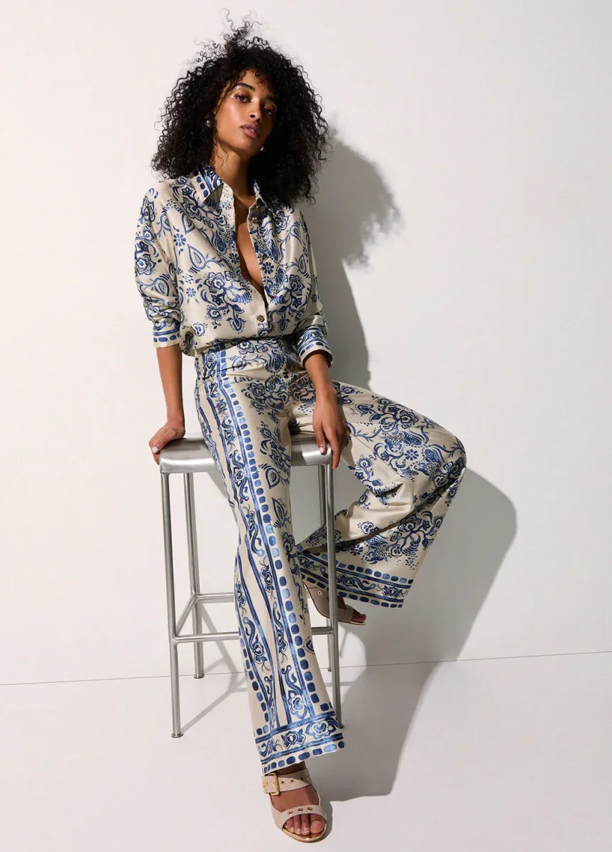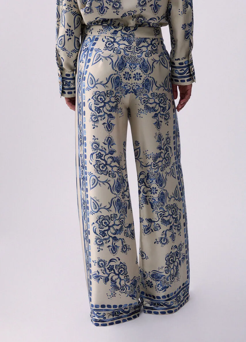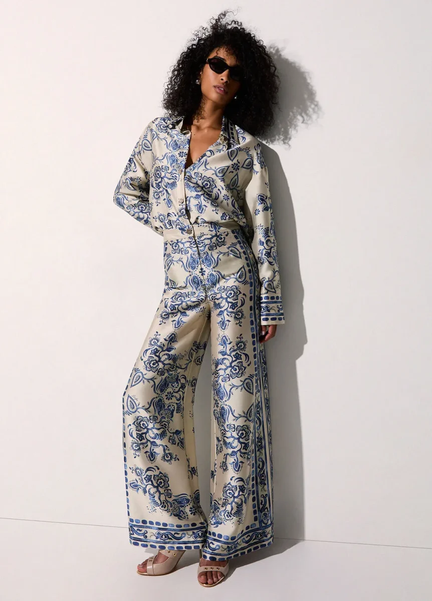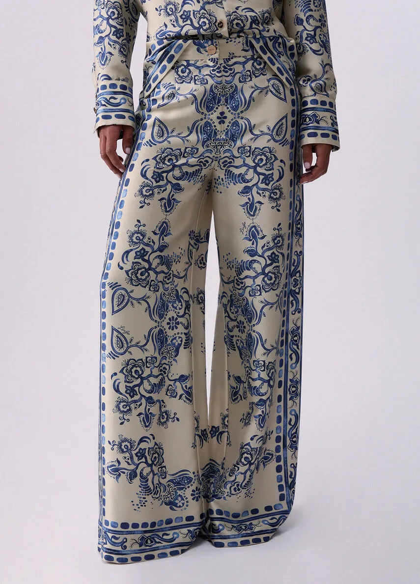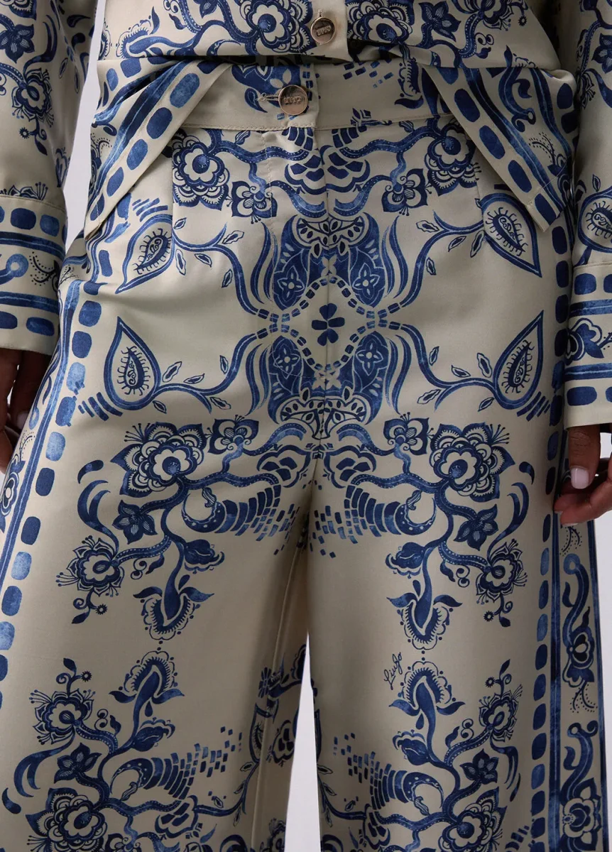 liujo pantaloni ecosostenibile CA6230TS555P9652 Pantaloni in twill fluido Stampa foulard Vita media Gamba ampia e comoda Chiusura con zip e bottoni Prodotto “Liu Jo Better” Codice web 73/89 Napoli Composizione 100% Poliestere Visita la nostra pagina facebook boutique flair