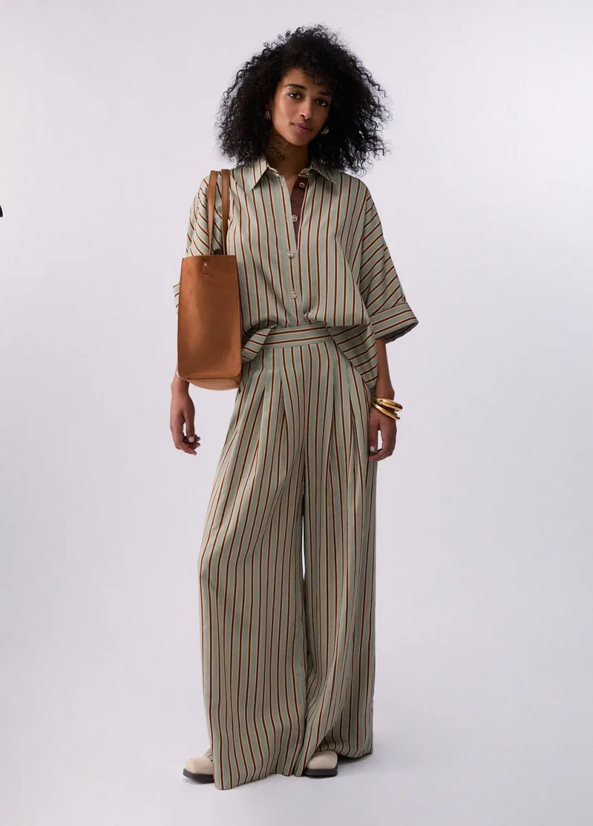 liujo pantaloni ecosostenibile CA6089T553AP9641 Pantaloni wide leg in rayon di viscosa Fantasia rigata Cintone con inserto elastico posteriore Comode tasche Design ampio e fluido Codice web 77/94 Napoli Composizione 90% Viscosa, 10% Poliammide Visita la nostra pagina facebook boutique flair