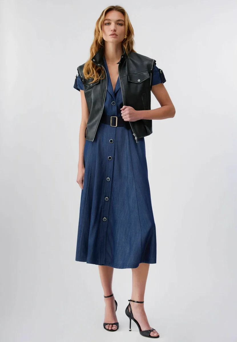 liujo abito ecosostenibile UA6315D033577000 Abitoin denim chambray no-stretch Scollo V Manica aletta Taschini alla francese Chiusura con bottoni Cintura removibile Codice web 89/108 Napoli Composizione 100% liocell Visita la nostra pagina facebook boutique flair