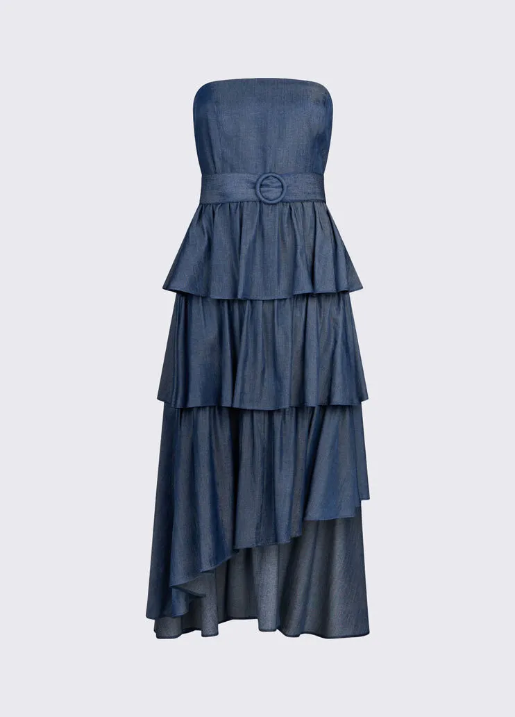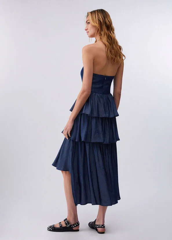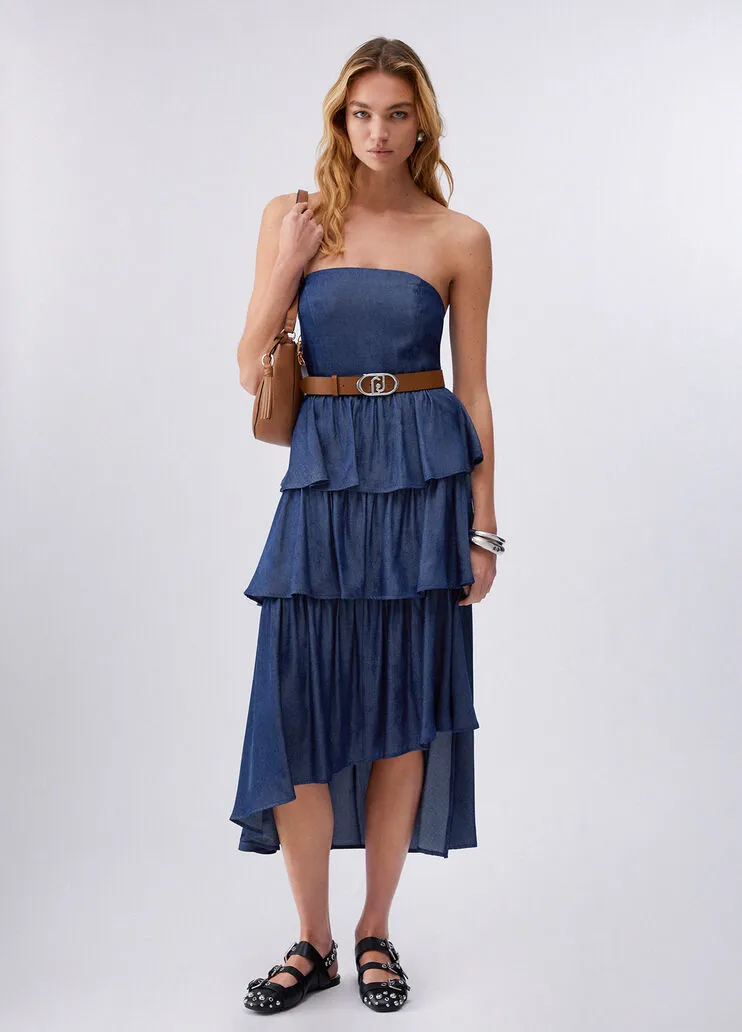 liujo abito ecosostenibile UA6275D489477000 Abito midi in denim chambray no-stretch Taglio bustier Balze asimmetriche Chiusura con zip nascosta Cintura in tono colore Codice web 69/84 Napoli Composizione 58% Poliestere, 42% Viscosa Visita la nostra pagina facebook boutique flair