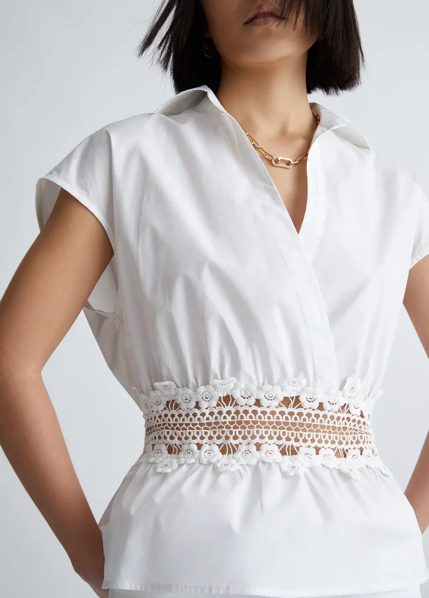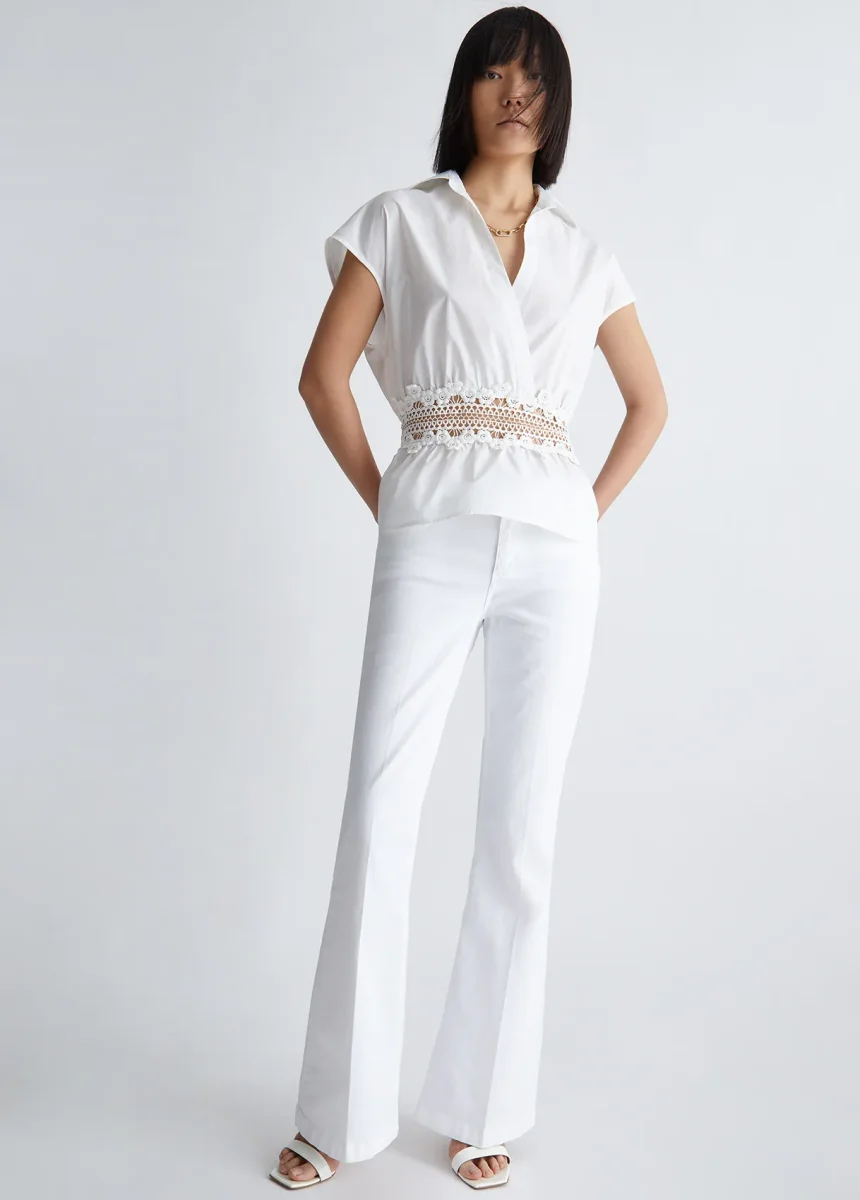 liujo Camicia cotone WA3080T485311111 liujo Camicia cotone WA3080T485311111 Blusa in popeline di cotone Dettagli in pizzo sul davanti Scollo a V incrociato Maniche ad aletta Cintone elastico sul retro Logo in metallo sul retro Made in Italy Codice web 65 Napoli Composizione 100% cotone Visita la nostra pagina facebook boutique flair