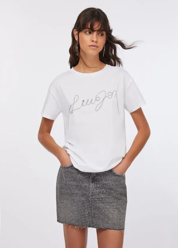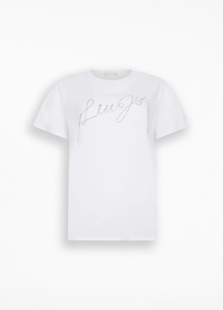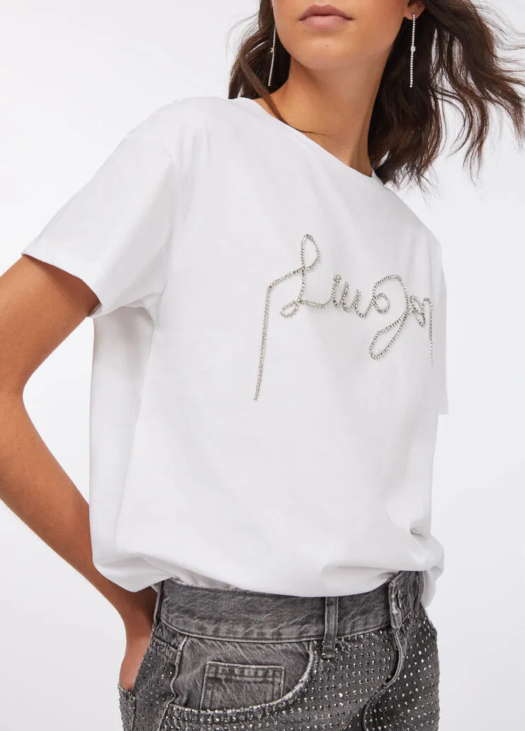 liujo shirt ecosostenibile UF5261JS923Q9698 T-shirt in jersey di cotone bianco Logo con strass sul davanti Taglio girocollo Maniche corte Prodotto “Liu Jo Better” Codice web 31/37Napoli 100% Cotone Visita la nostra pagina facebook boutique flair