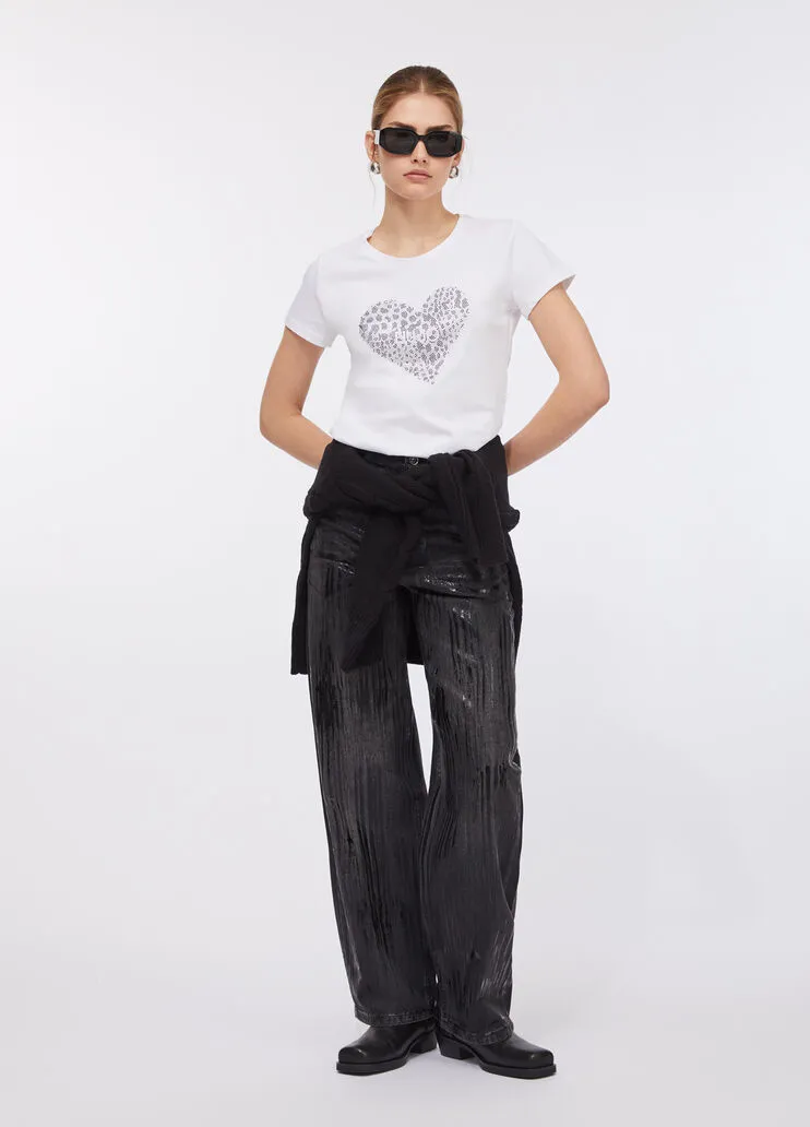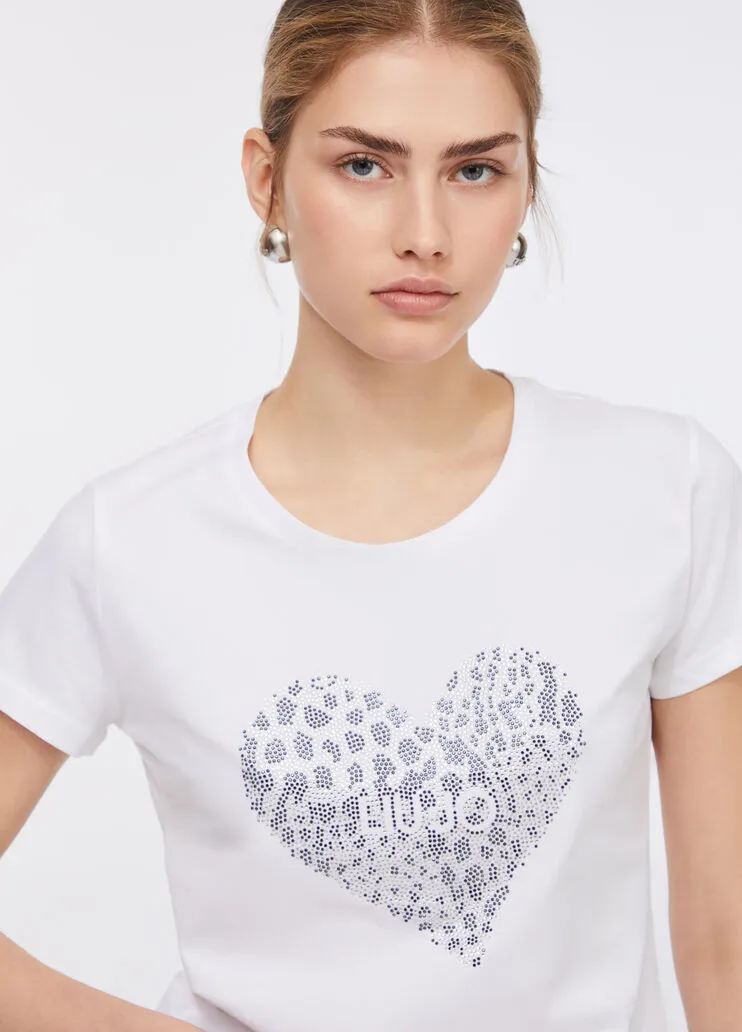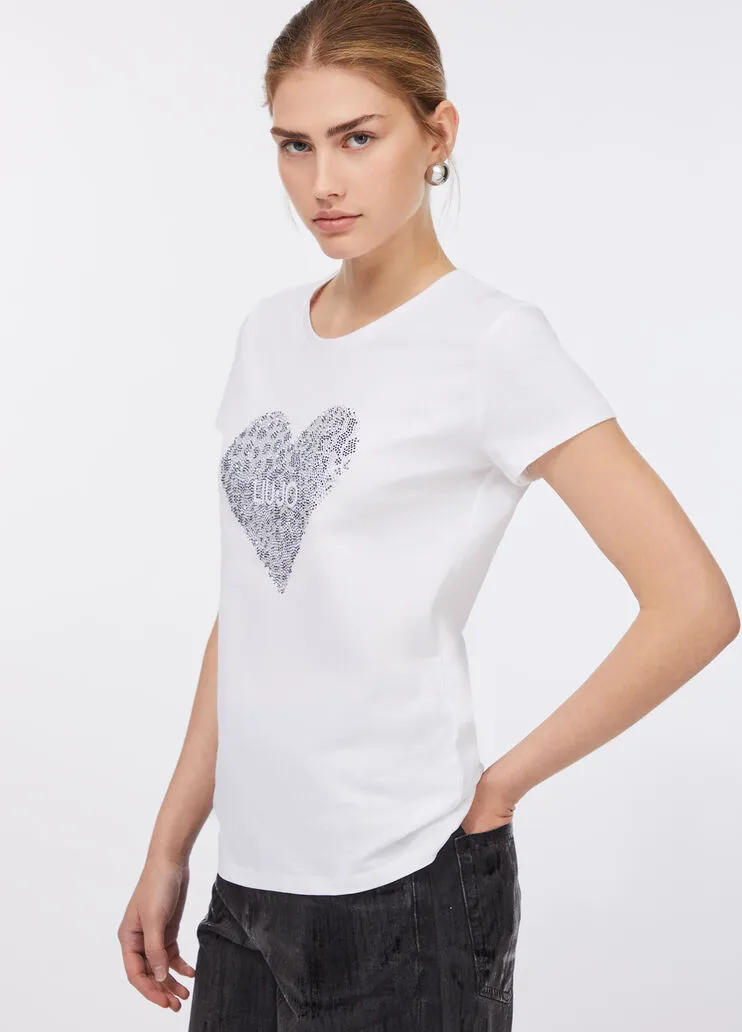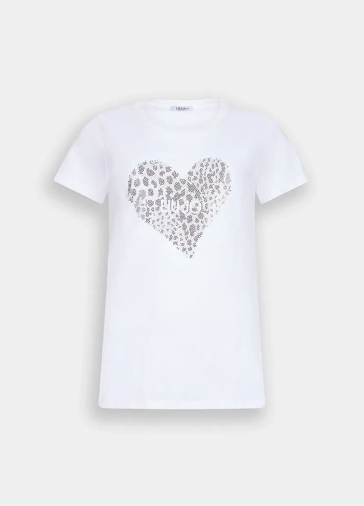 liujo shirt ecosostenibile UF5264JS923P9003 T-shirt in jersey di cotone Cuore con logo e strass Scollo rotondo Maniche corte Prodotto “Liu Jo Better” Codice web 27/33 Napoli 100% Cotone Visita la nostra pagina facebook boutique flair