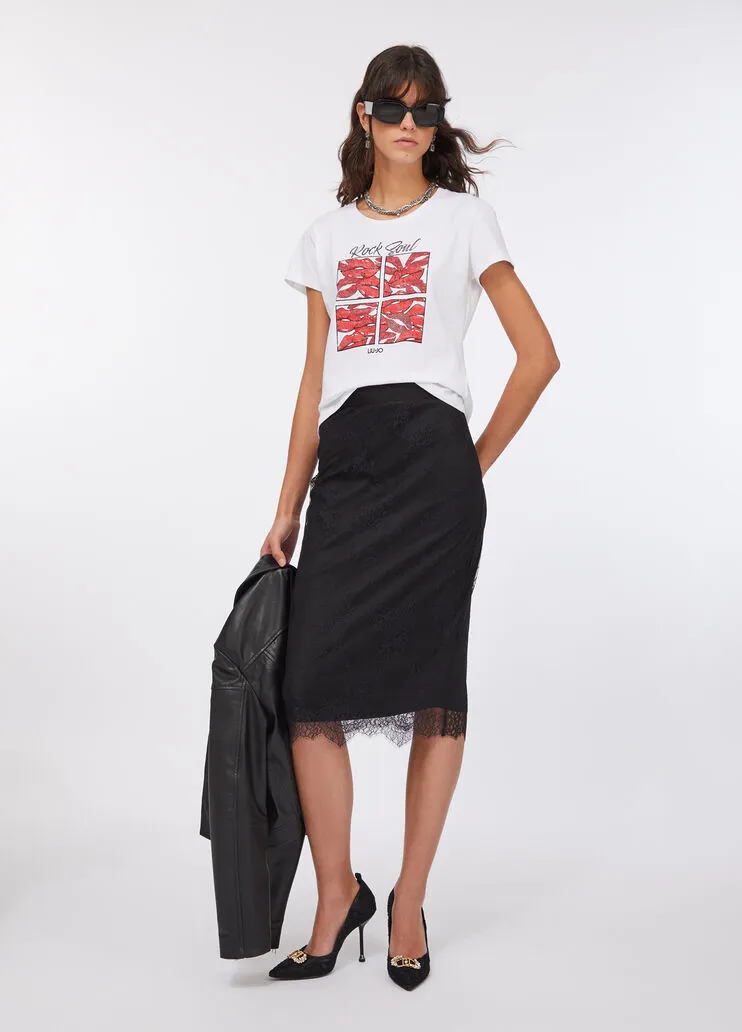 liujo shirt ecosostenibile UF5265JS923M9942 T-shirt in jersey di cotone Stampa grafica con strass Scollo rotondo Maniche corte Prodotto “Liu Jo Better” Codice web 25/31 Napoli 100% Cotone Visita la nostra pagina facebook boutique flair