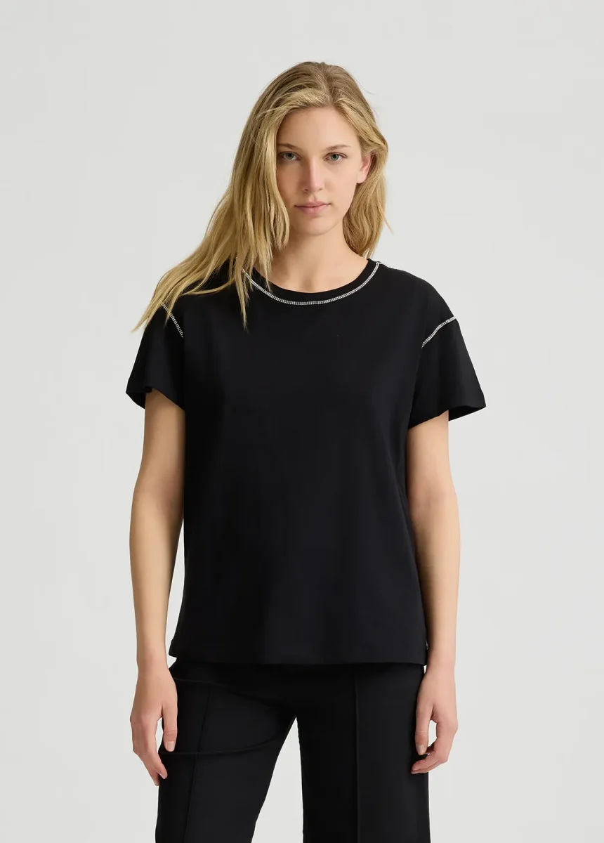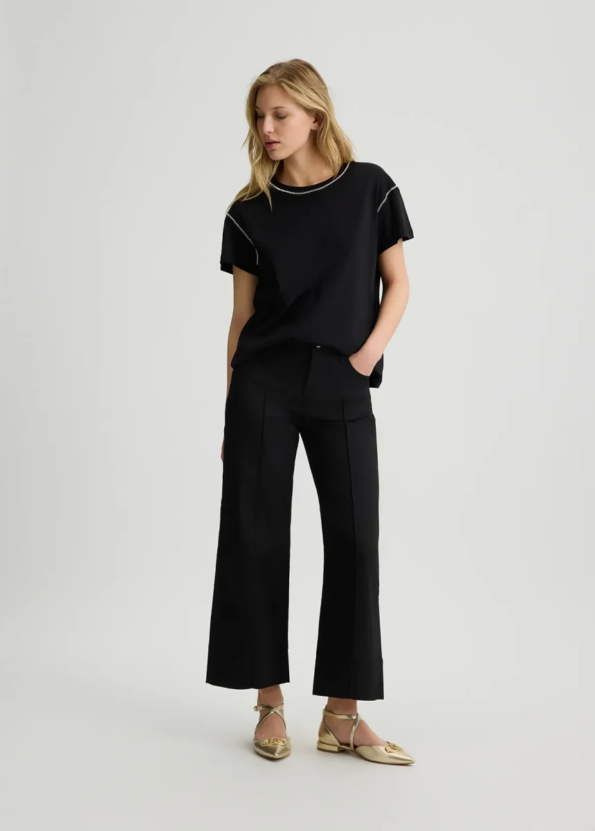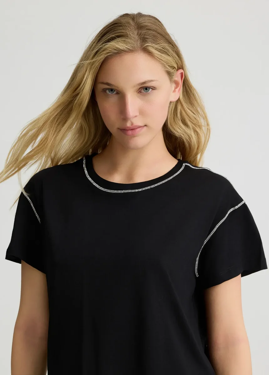 liujo shirt ecosostenibile WA5148J489322222 T-shirt in jersey di cotone Strass applicati Scollo a barchetta Maniche corte Logo in metallo sul retro Prodotto “Liu Jo Better” Codice web 31/37 Napoli 100% Cotone Visita la nostra pagina facebook boutique flair